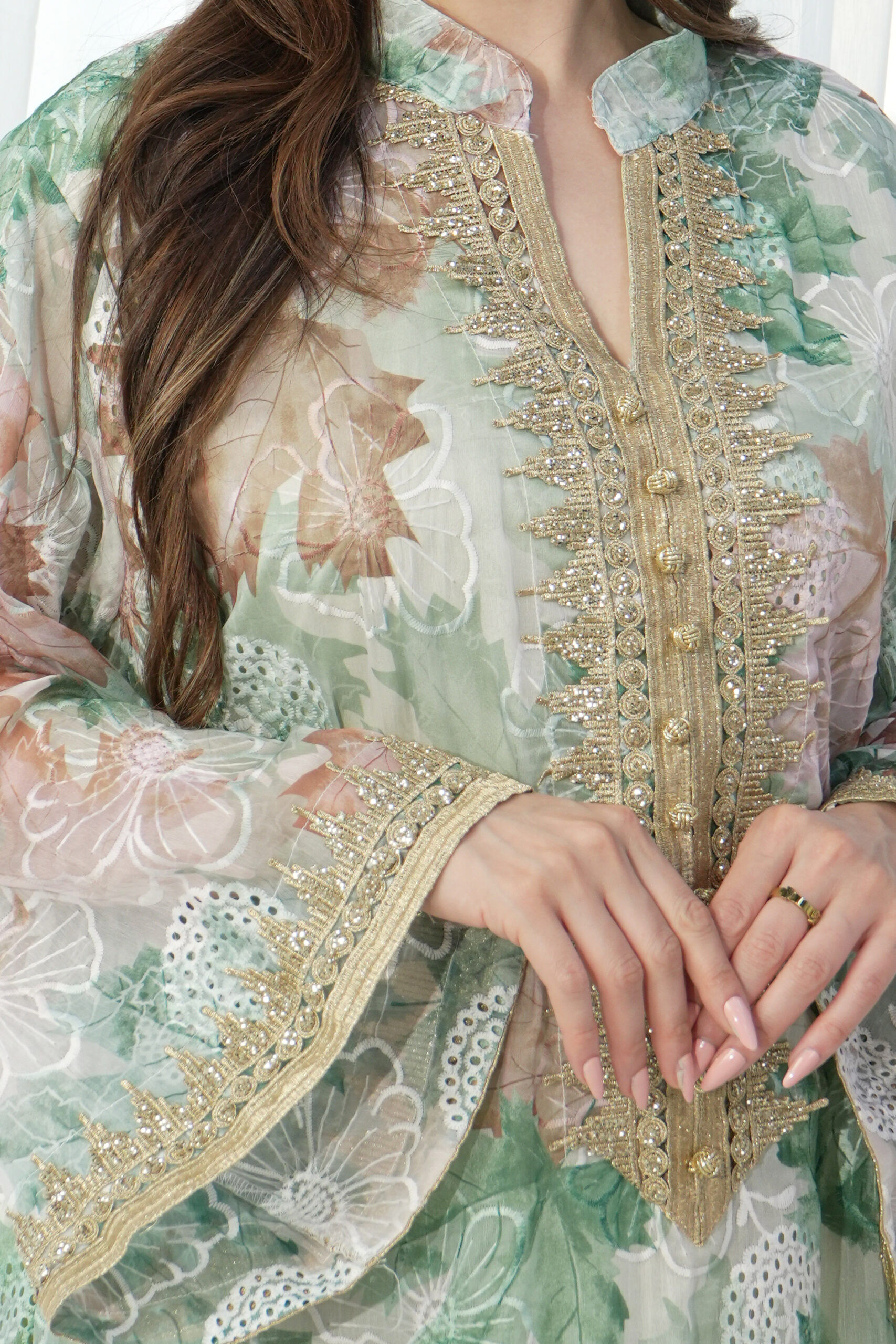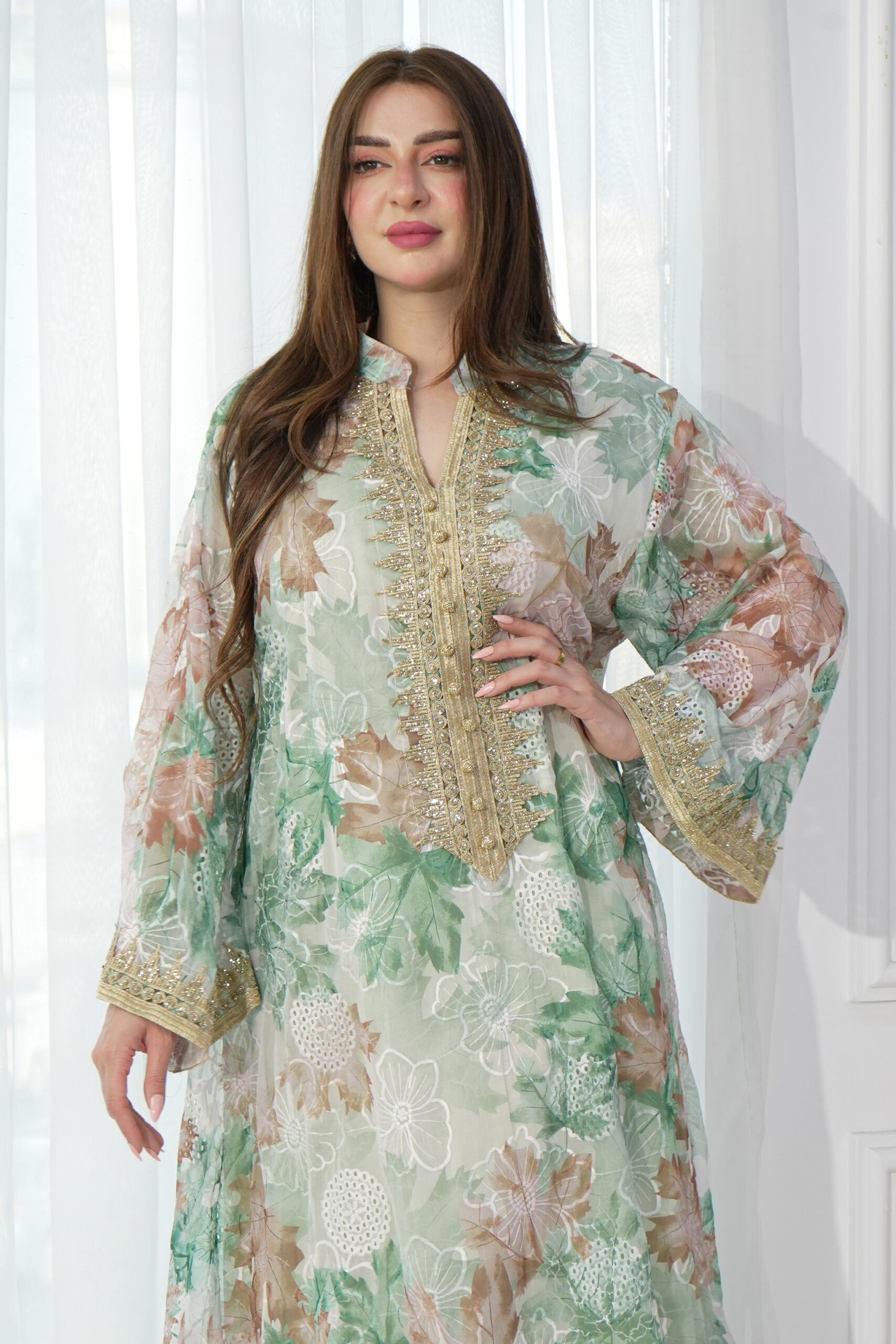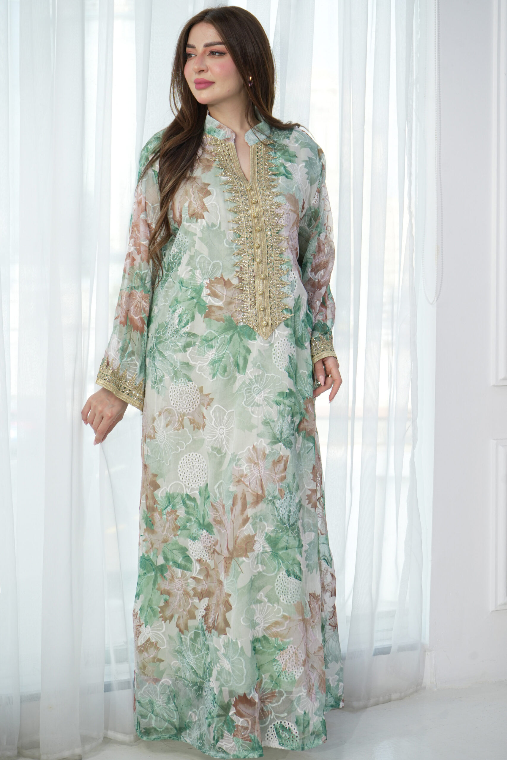 نسجت باللون اخضر الناعم ومن خامه مشجره عالي الجودة، صممت بتطريز ذهبي بياقة ناعمة حول الرقبة مع فتحة صدر قصيرة ومزينة بكلفة ذهبي،ممتدة الى منطقة الخصر مع الاكمام، تتسع من منتصف الذراع بقصة عليها حواف شريط ذهبي، والاكمام شريط حول المعصم.
