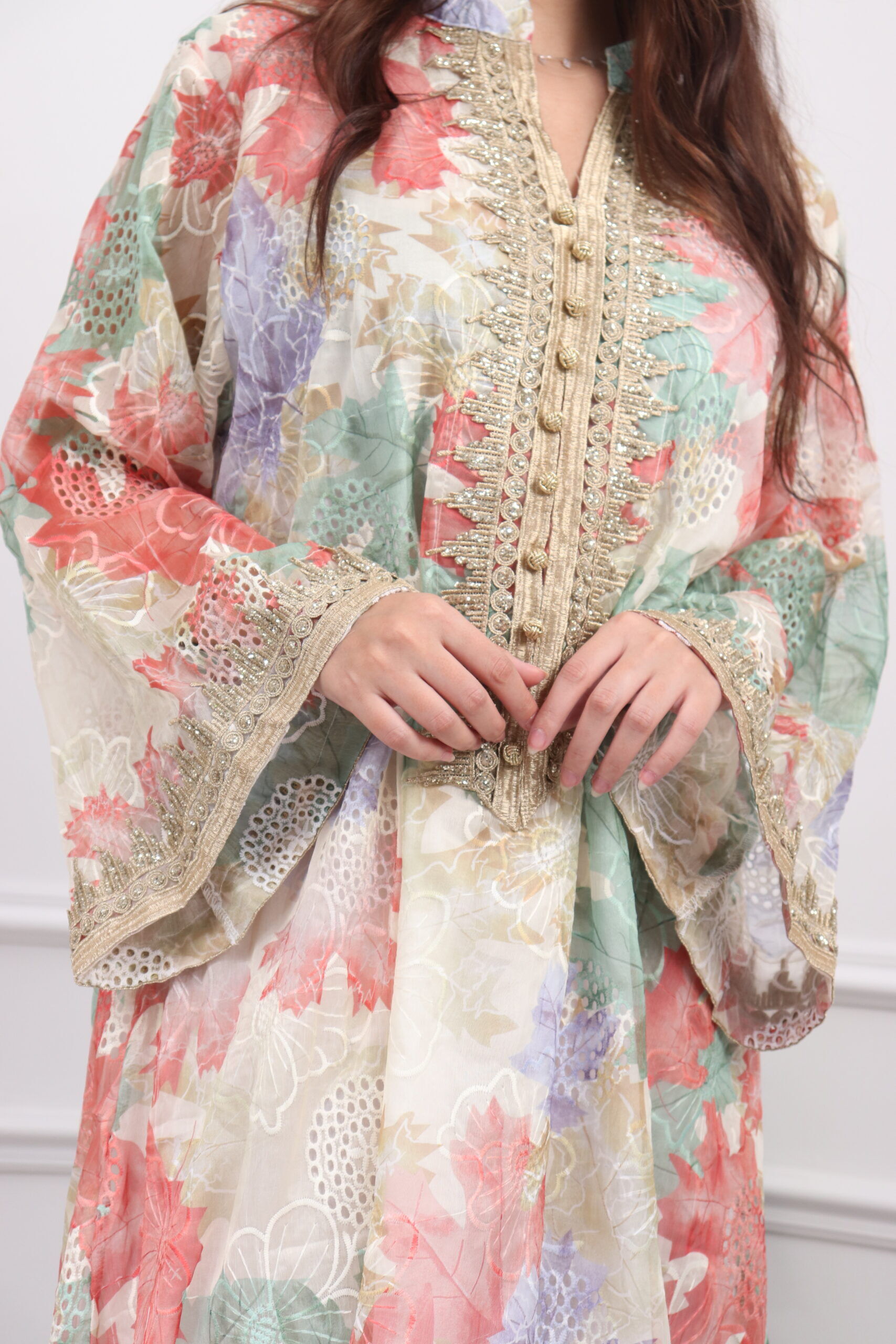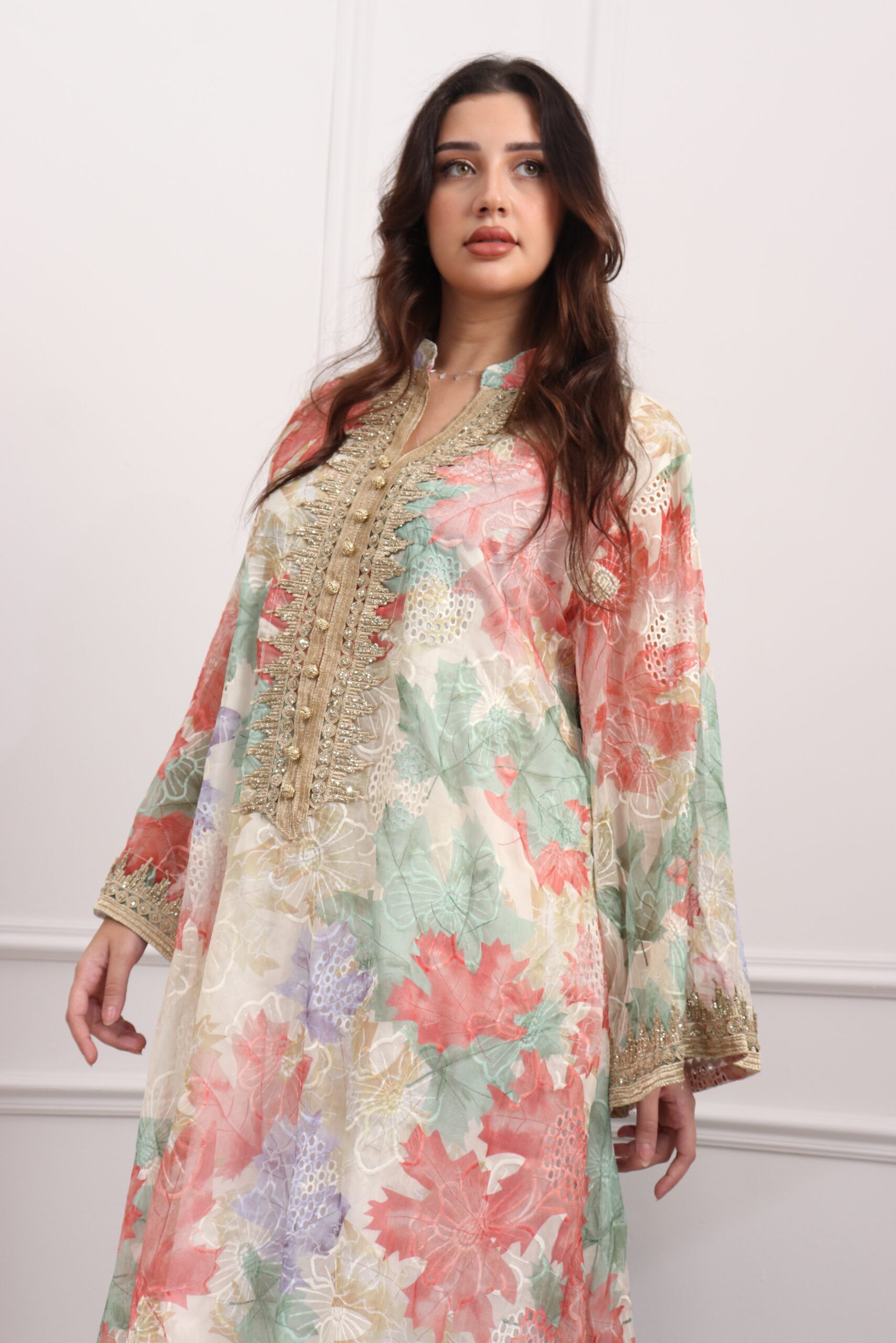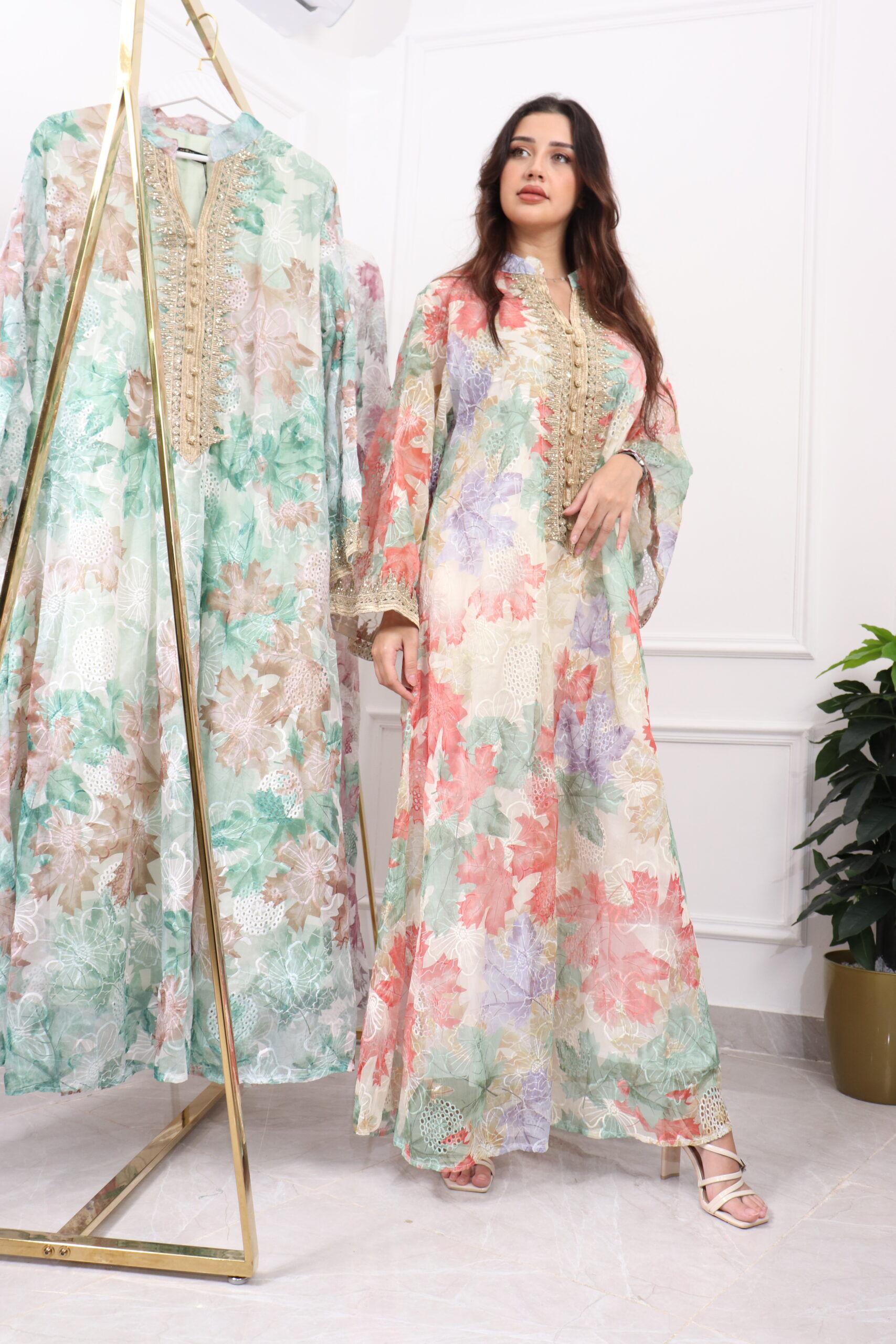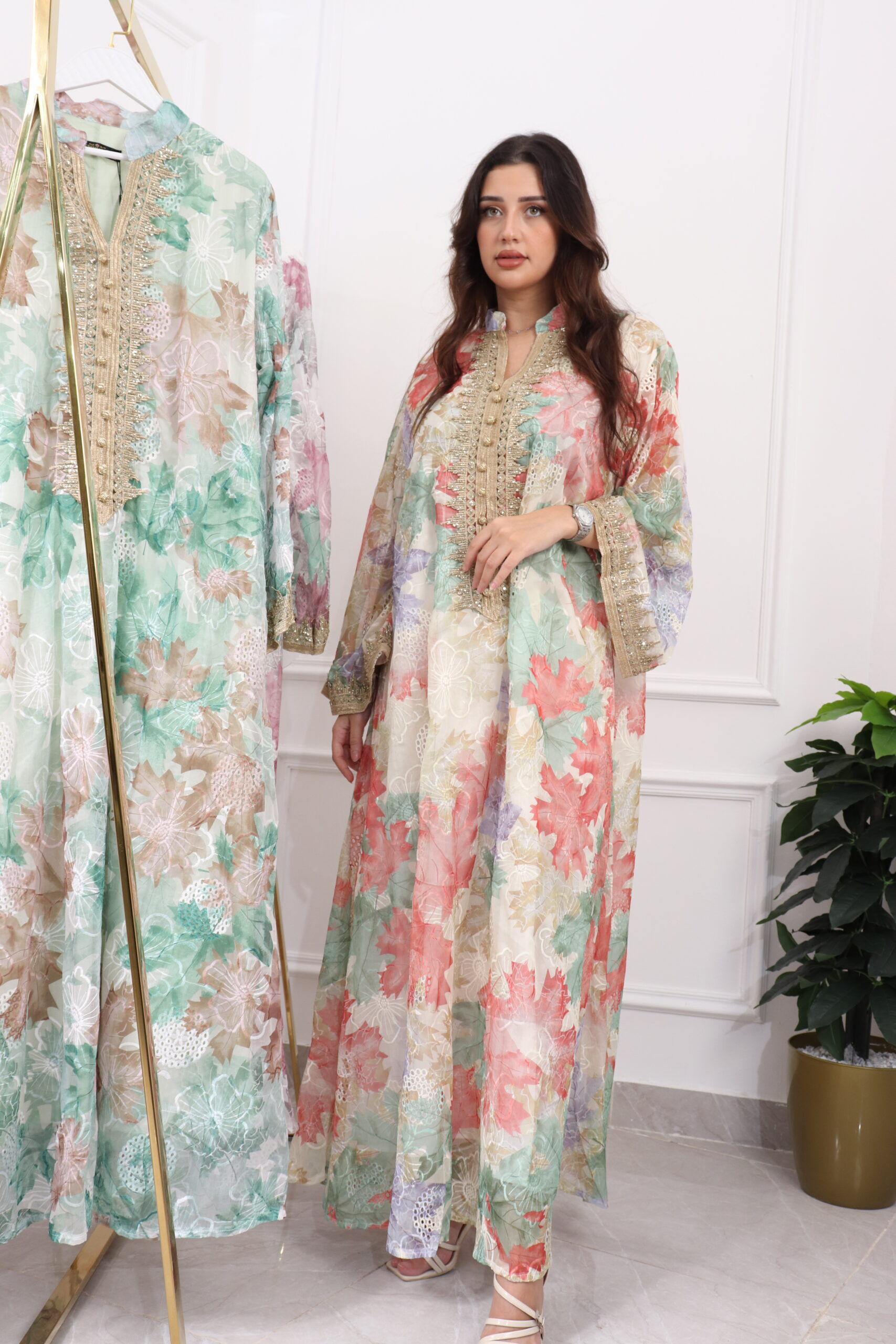 - الموديل: جلابية مشجره بتطريز ذهبي.