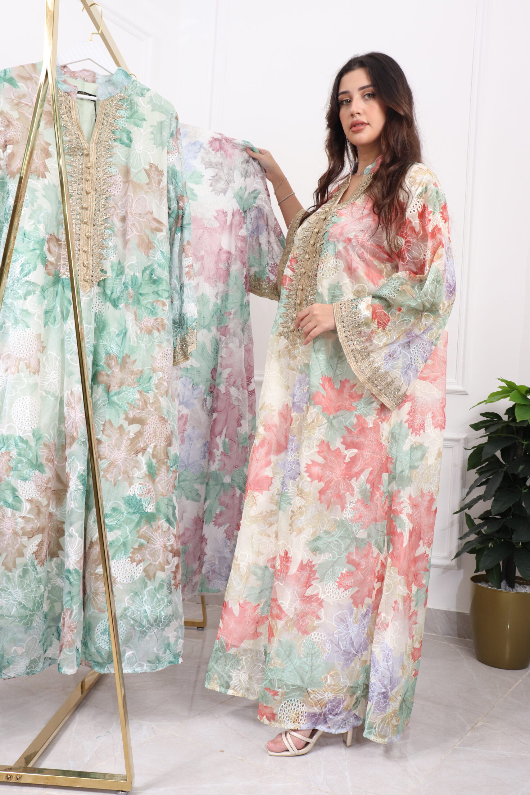 جلابية مشجره بتطريز ذهبي فخمة وراقية للمناسبات العائلية من الجلابيات الأكثر طلباً لأنها: