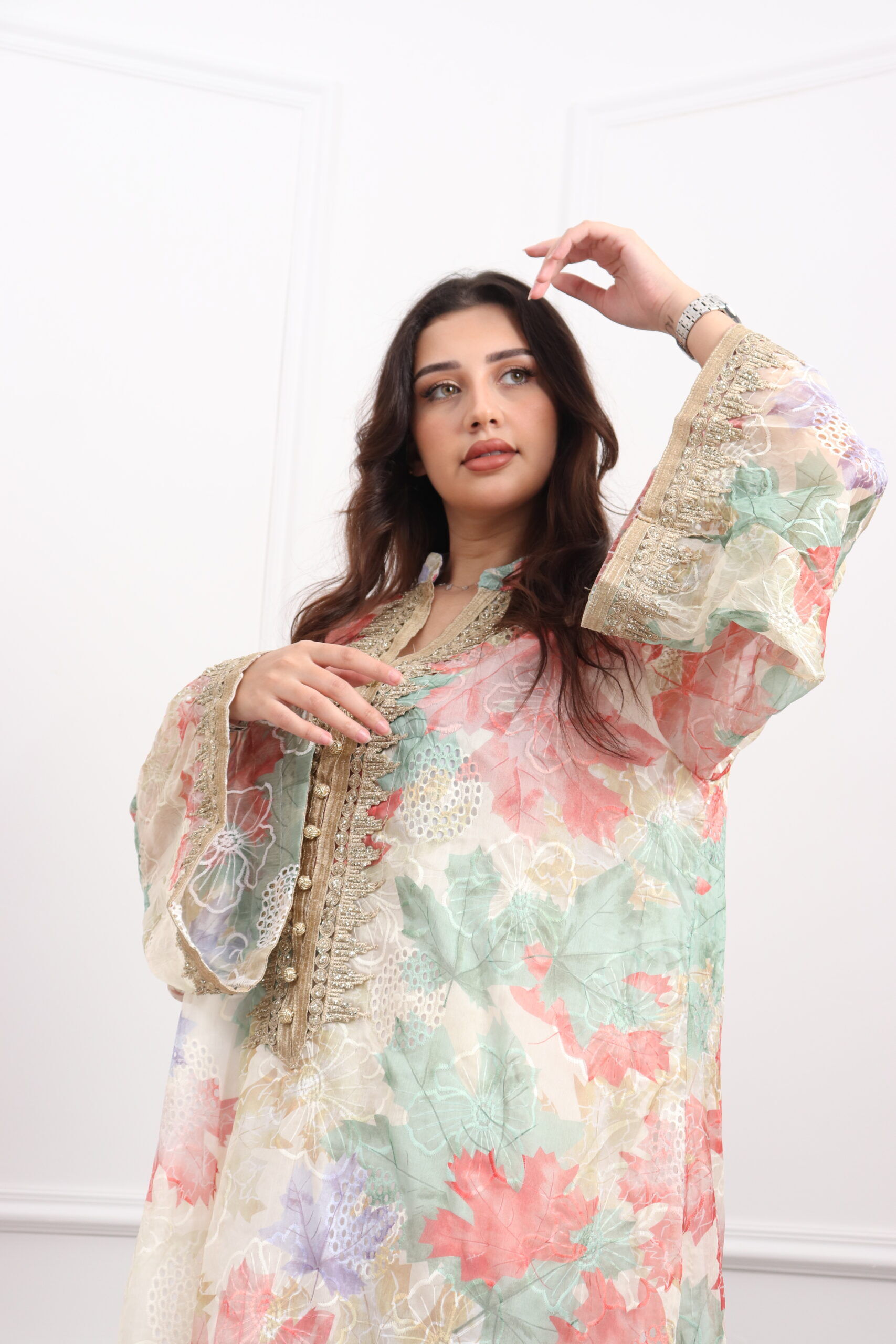 نسجت باللون برتقالي الناعم ومن خامه مشجره عالي الجودة، صممت بتطريز ذهبي بياقة ناعمة حول الرقبة مع فتحة صدر قصيرة ومزينة بكلفة ذهبي،ممتدة الى منطقة الخصر مع الاكمام، تتسع من منتصف الذراع بقصة عليها حواف شريط ذهبي، والاكمام شريط حول المعصم.