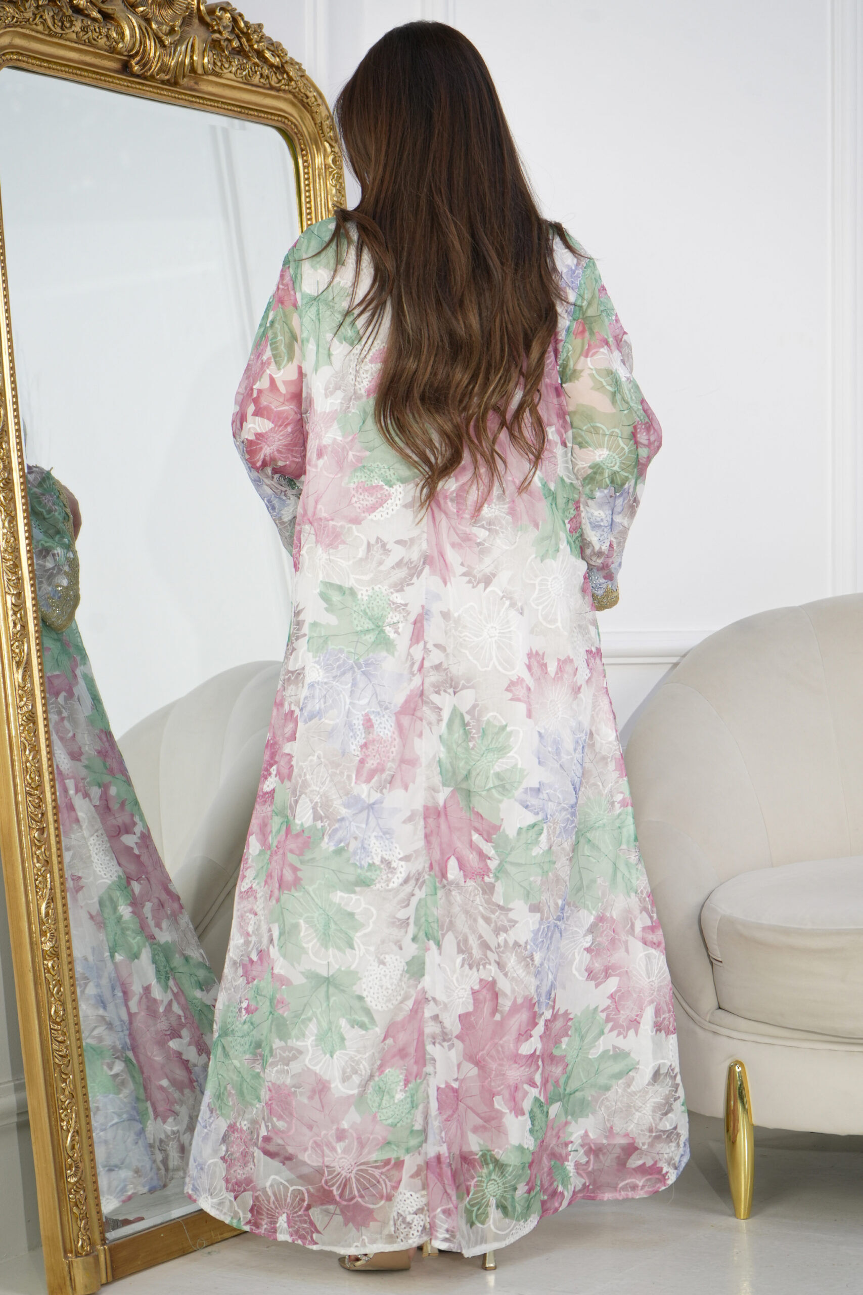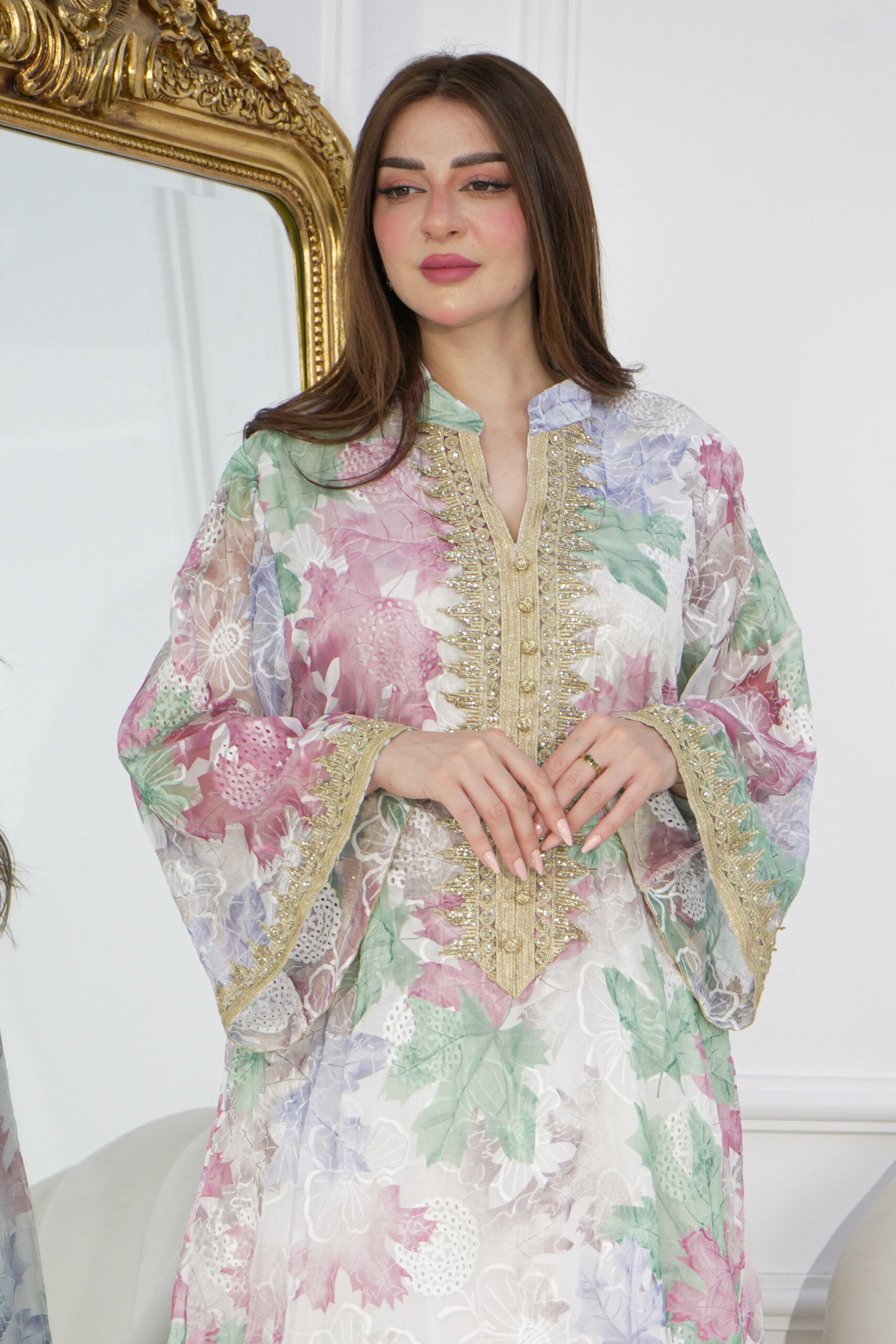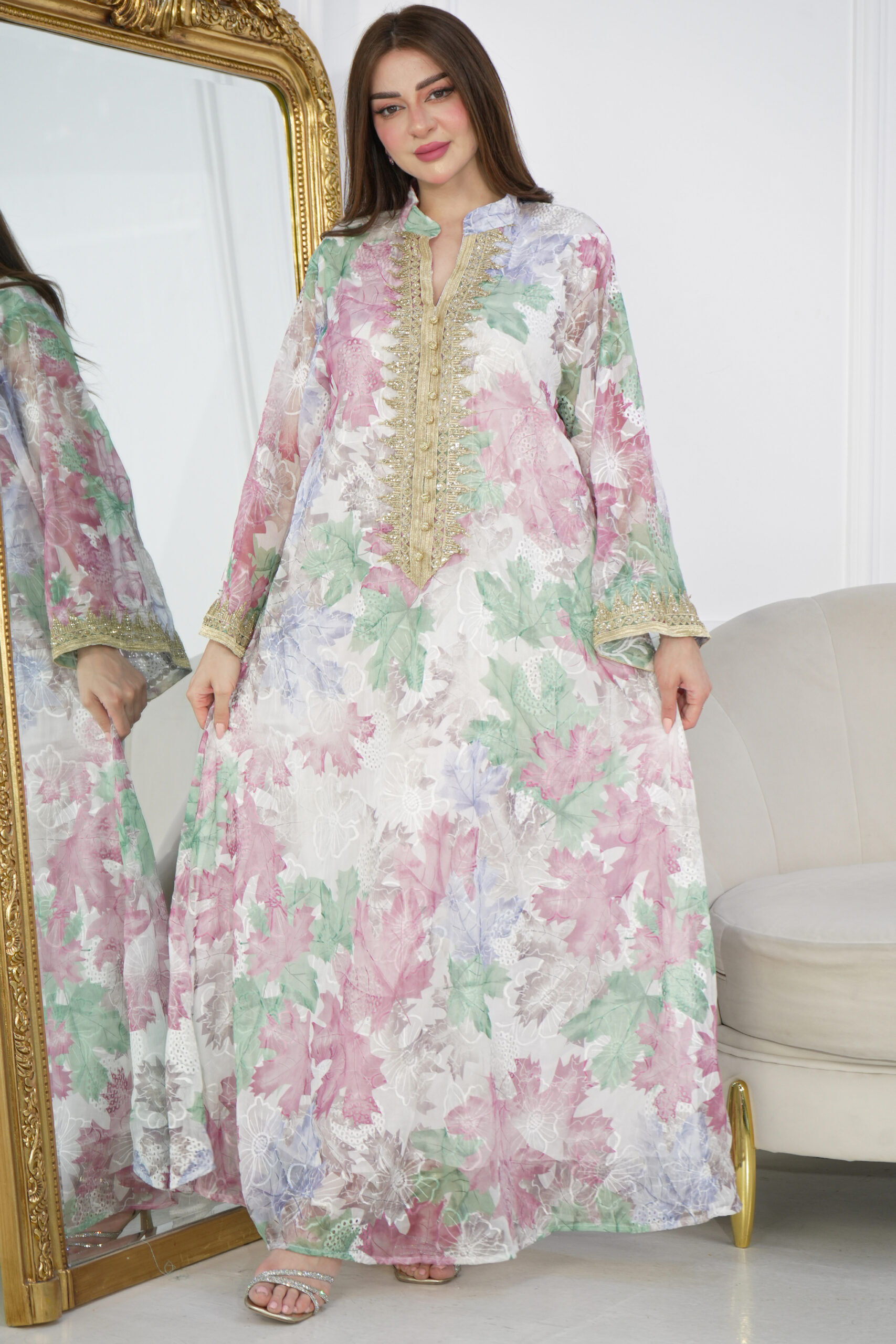 - الموديل: جلابية مشجره بتطريز ذهبي.