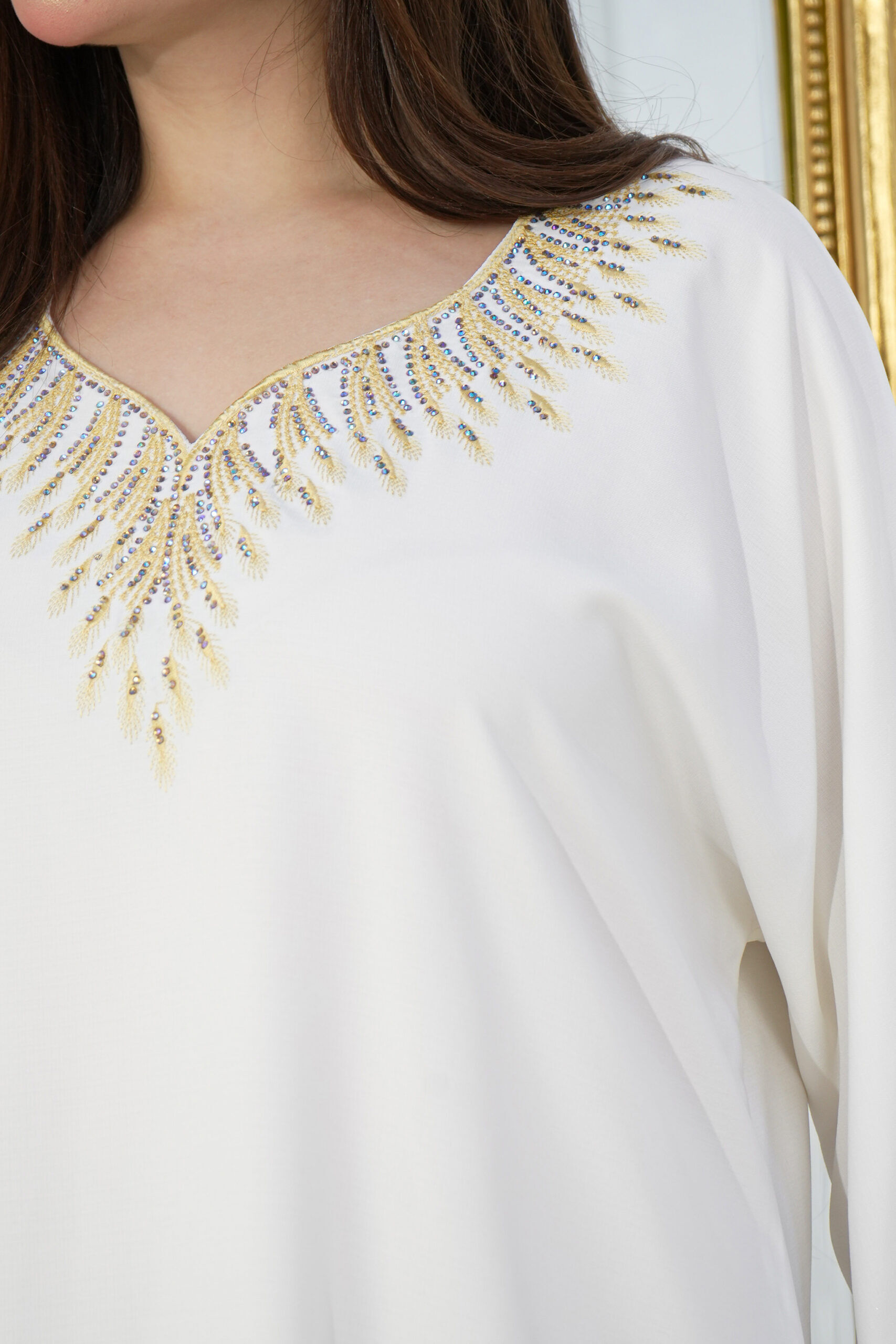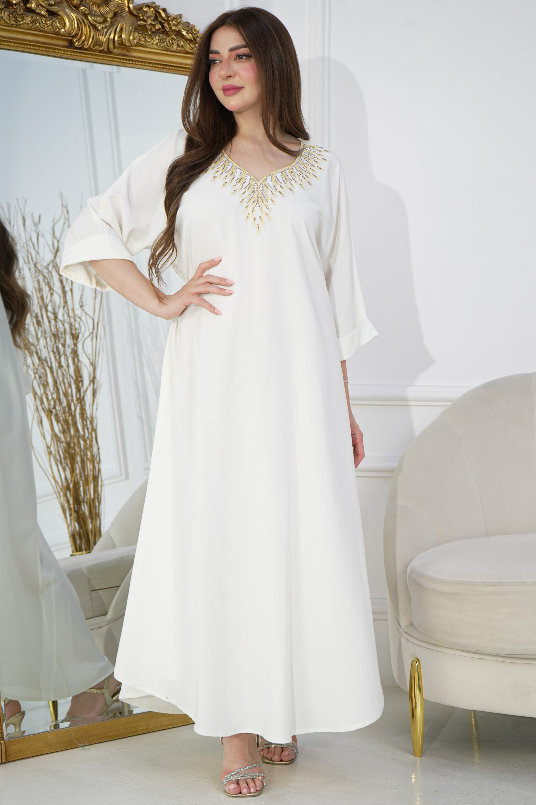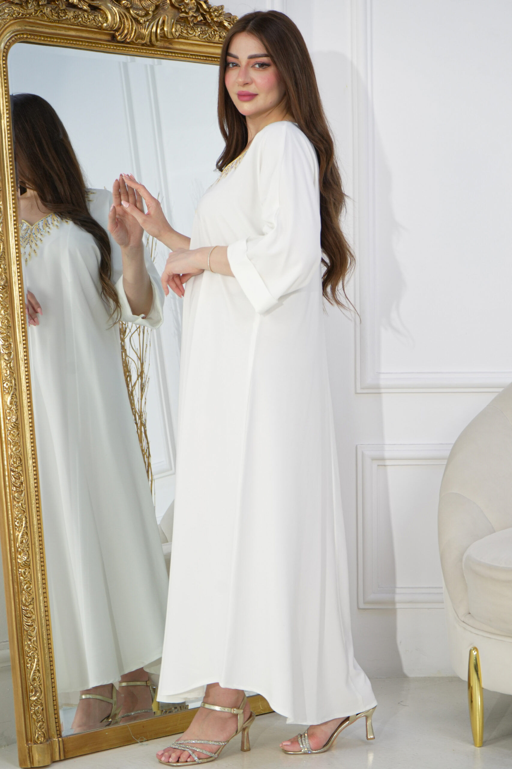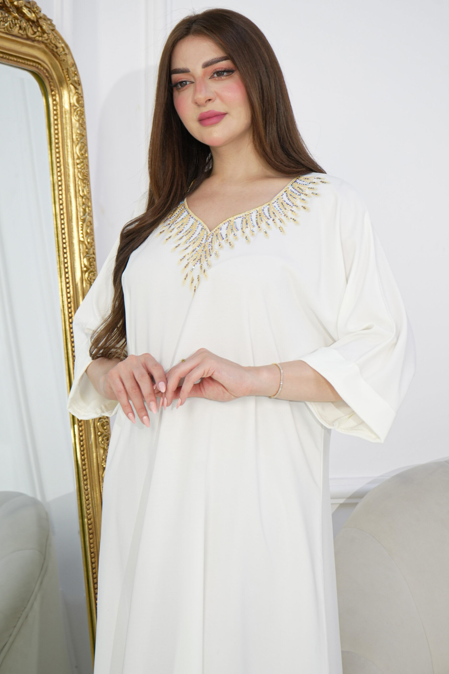 جلابيه ابيض خليجى بتطريز شك و فصوص من امام