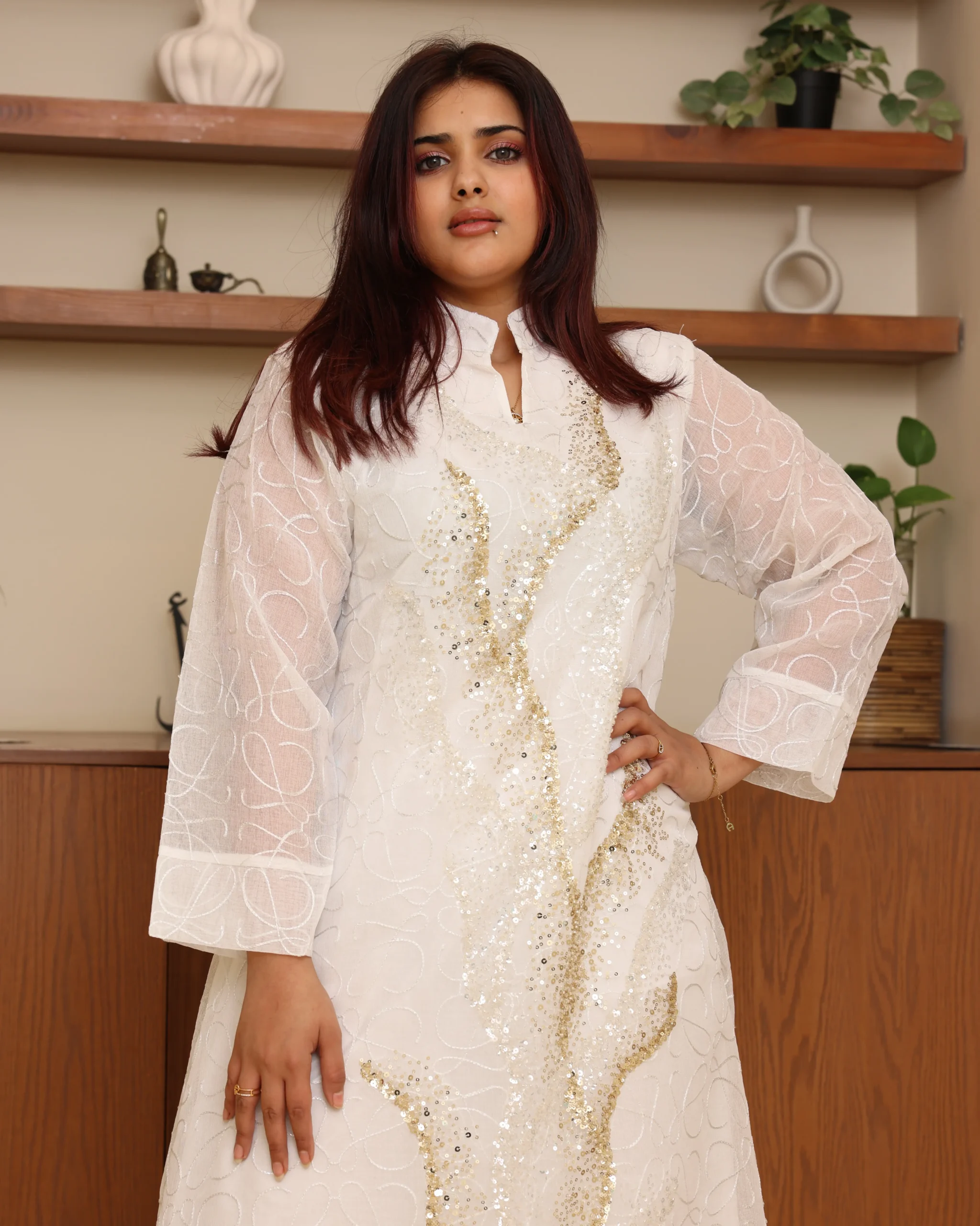 جلابية ابيض مطرزة بشك ذهبي فخمة تميز وجودك بين الحضور، خليها بخزانتك للمناسبات والجمعات العائلية.