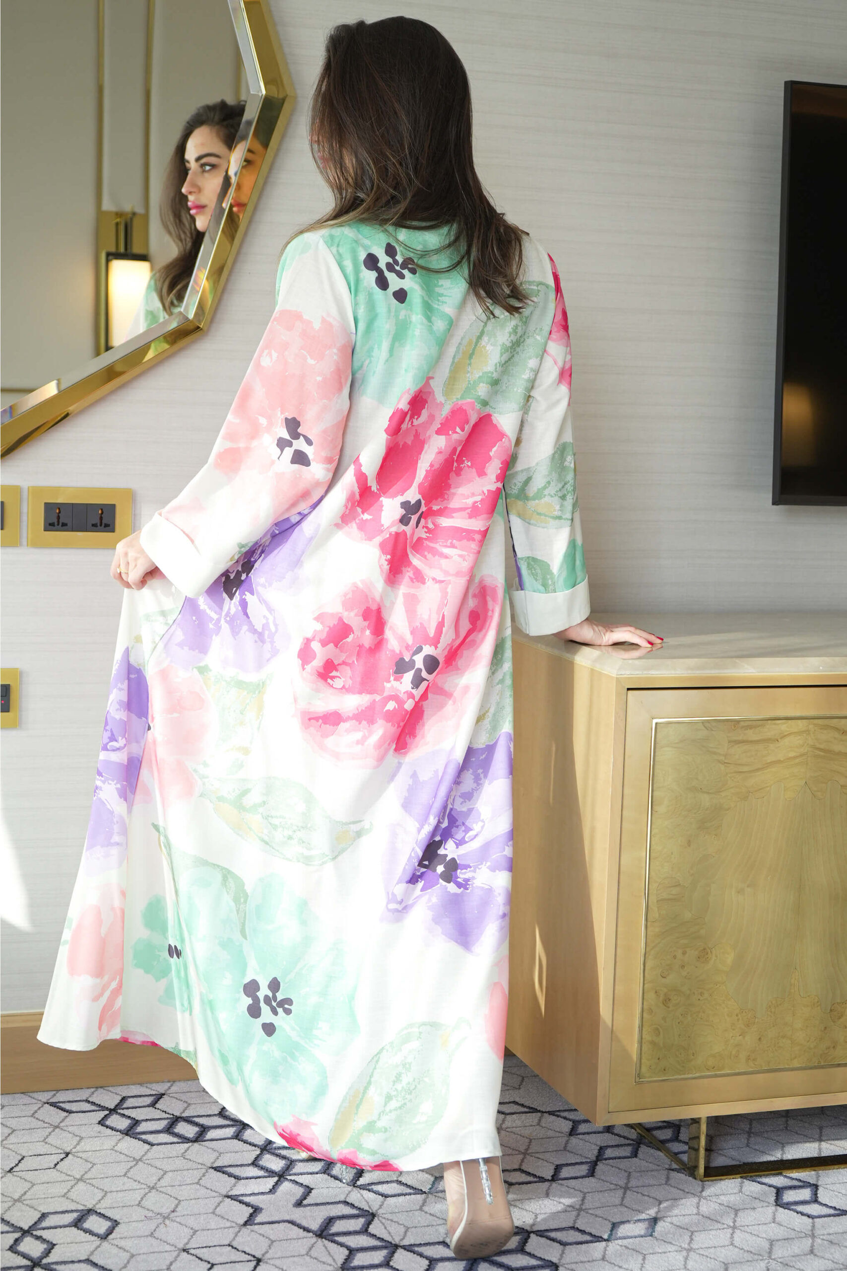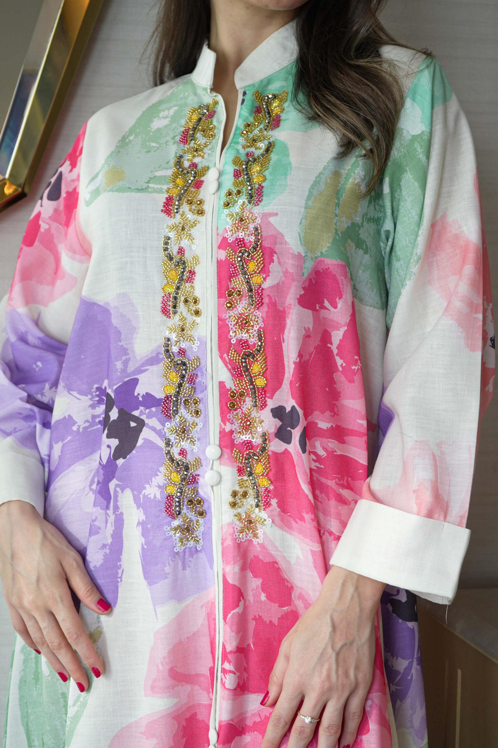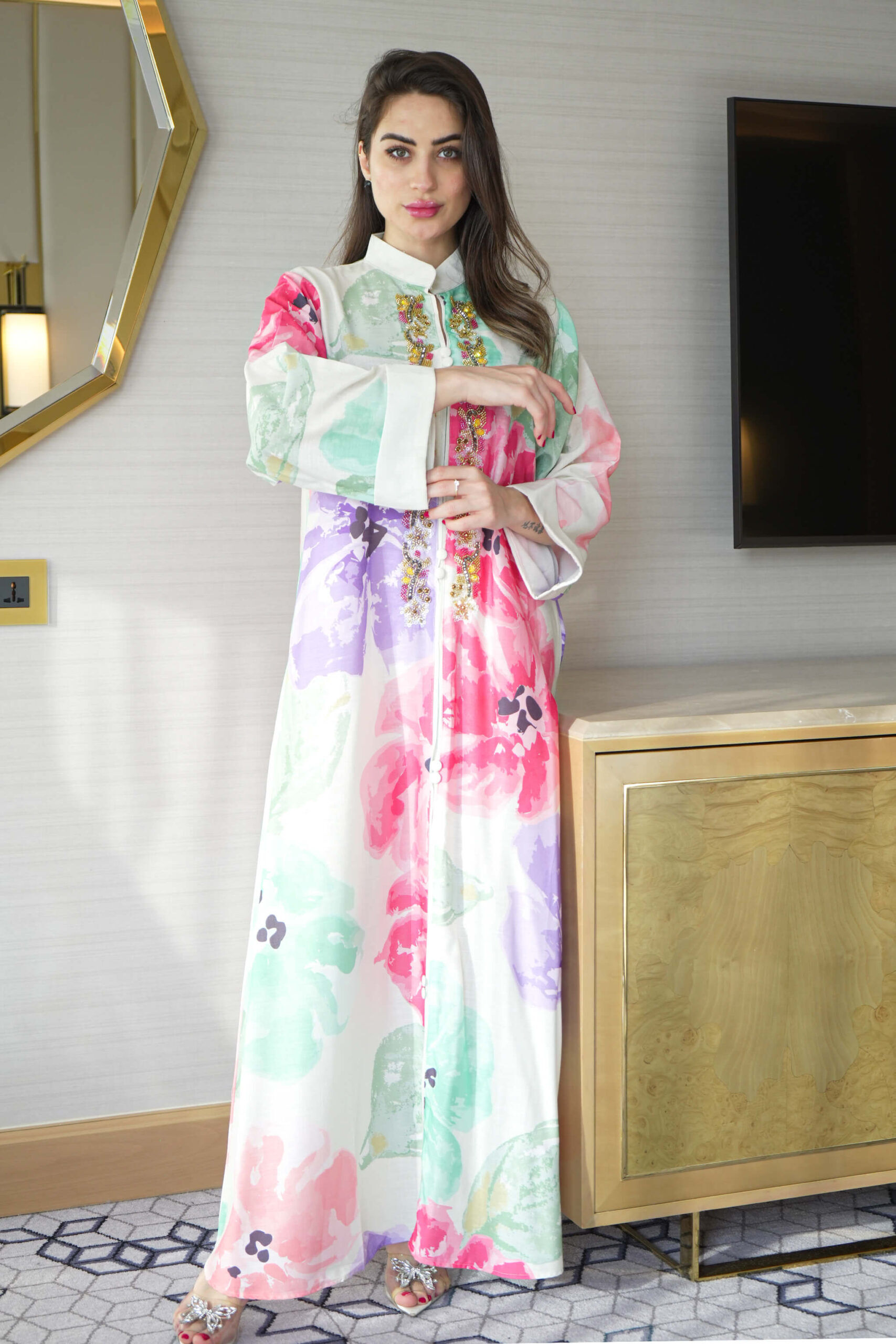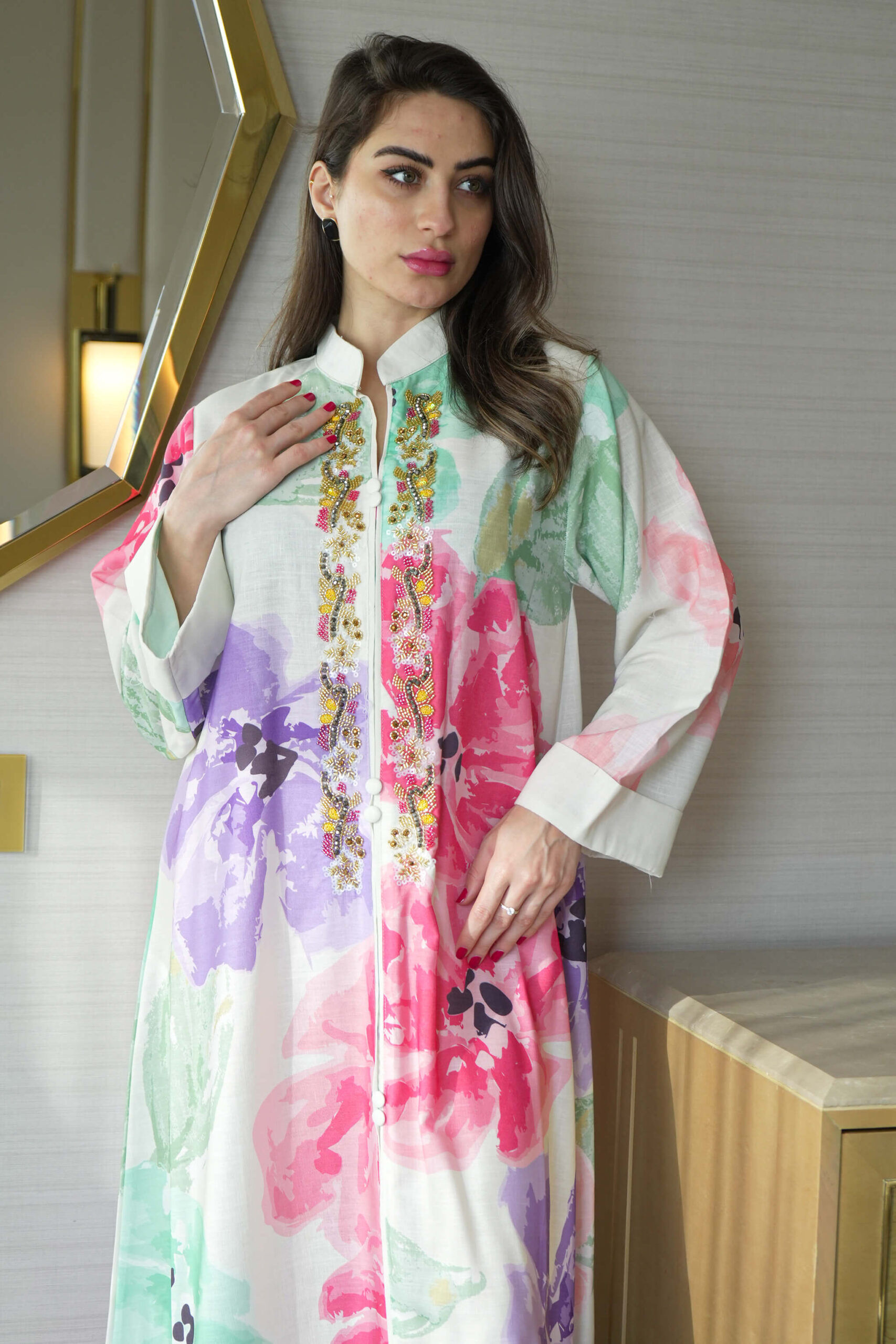 الجلابية نسجت من خامة كتان مطرز بشك ذهبي مع خام مرسومه بلكامل بورود كامل جلابية ، صممت بلياقه و تطريز شك بلون ذهبي و لتمنحك إطلالة تستحقينها.