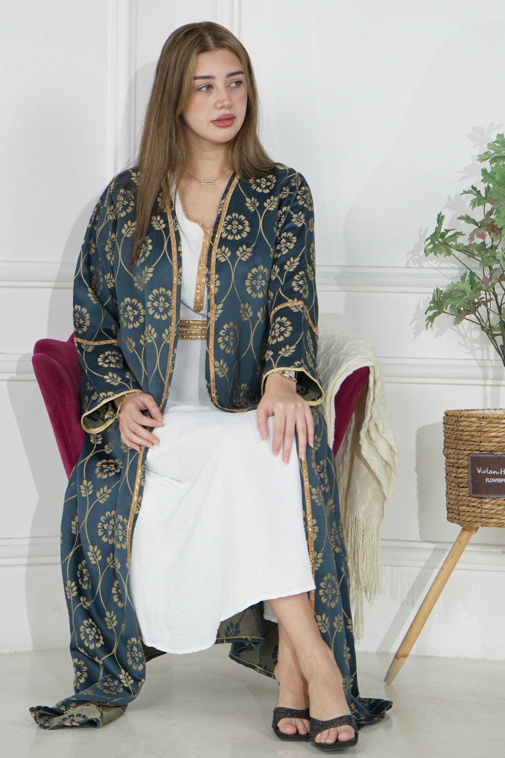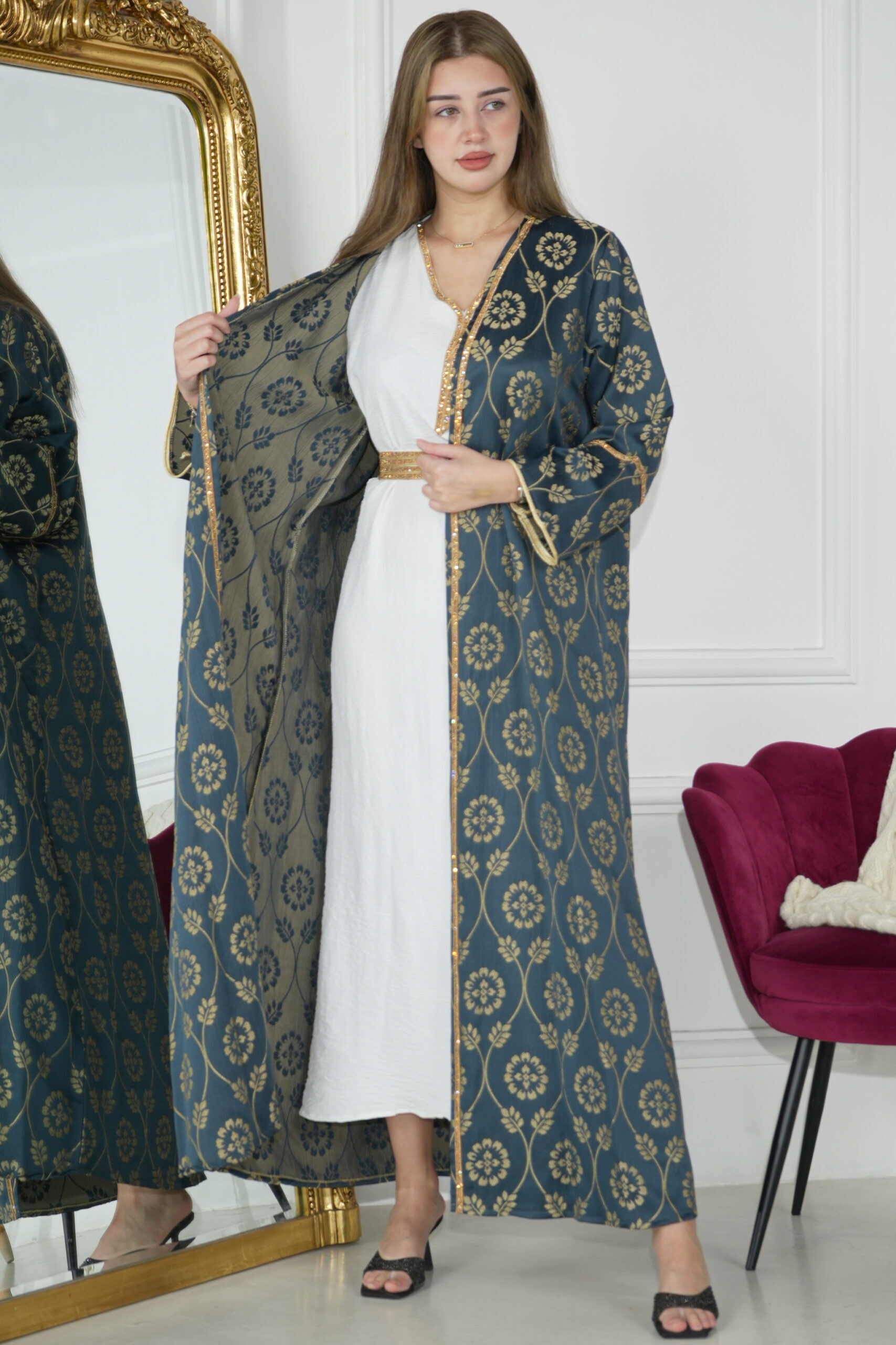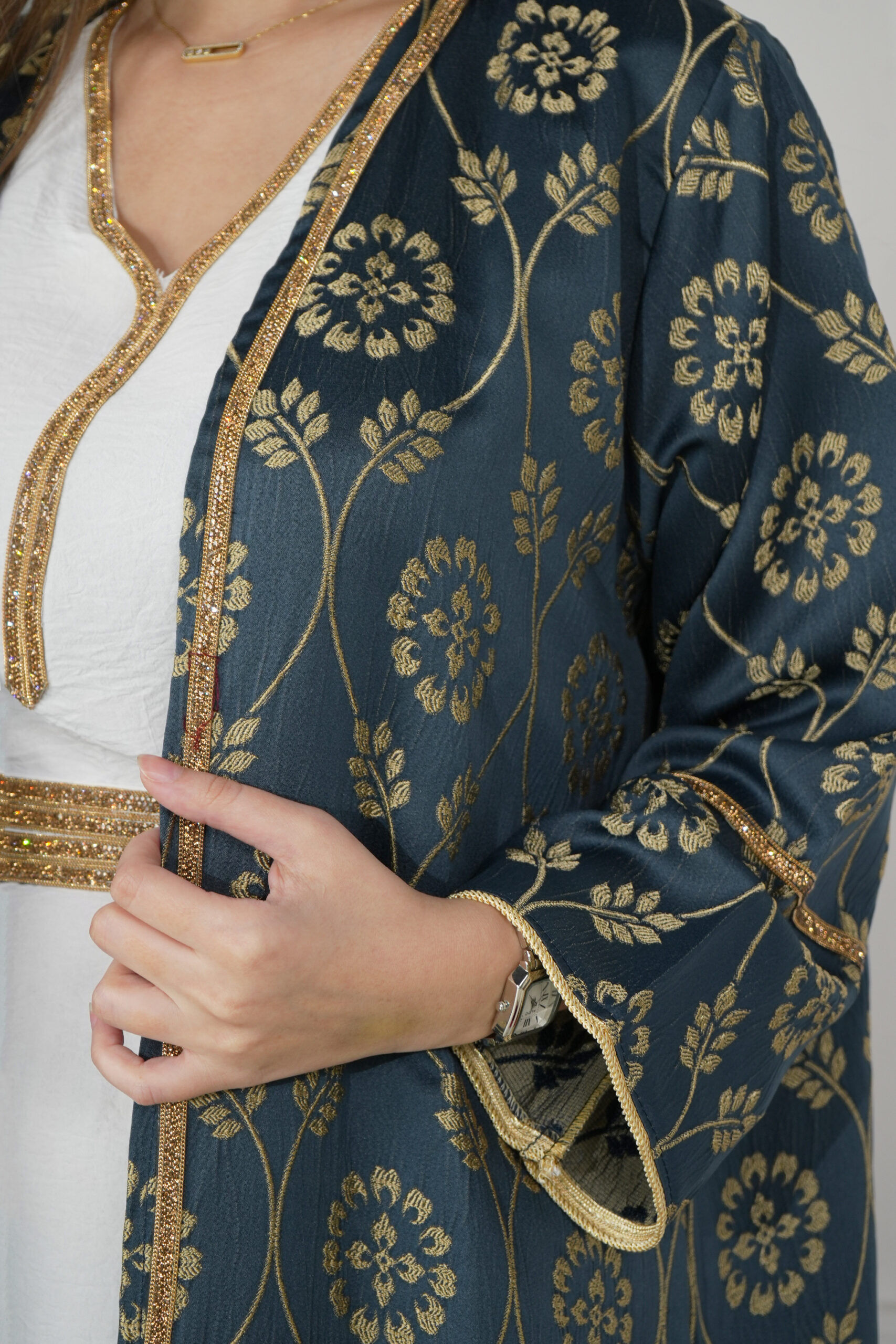 جلابيه اخضر جاكار مشجره بتصميم طبقتين وشريط فصوص