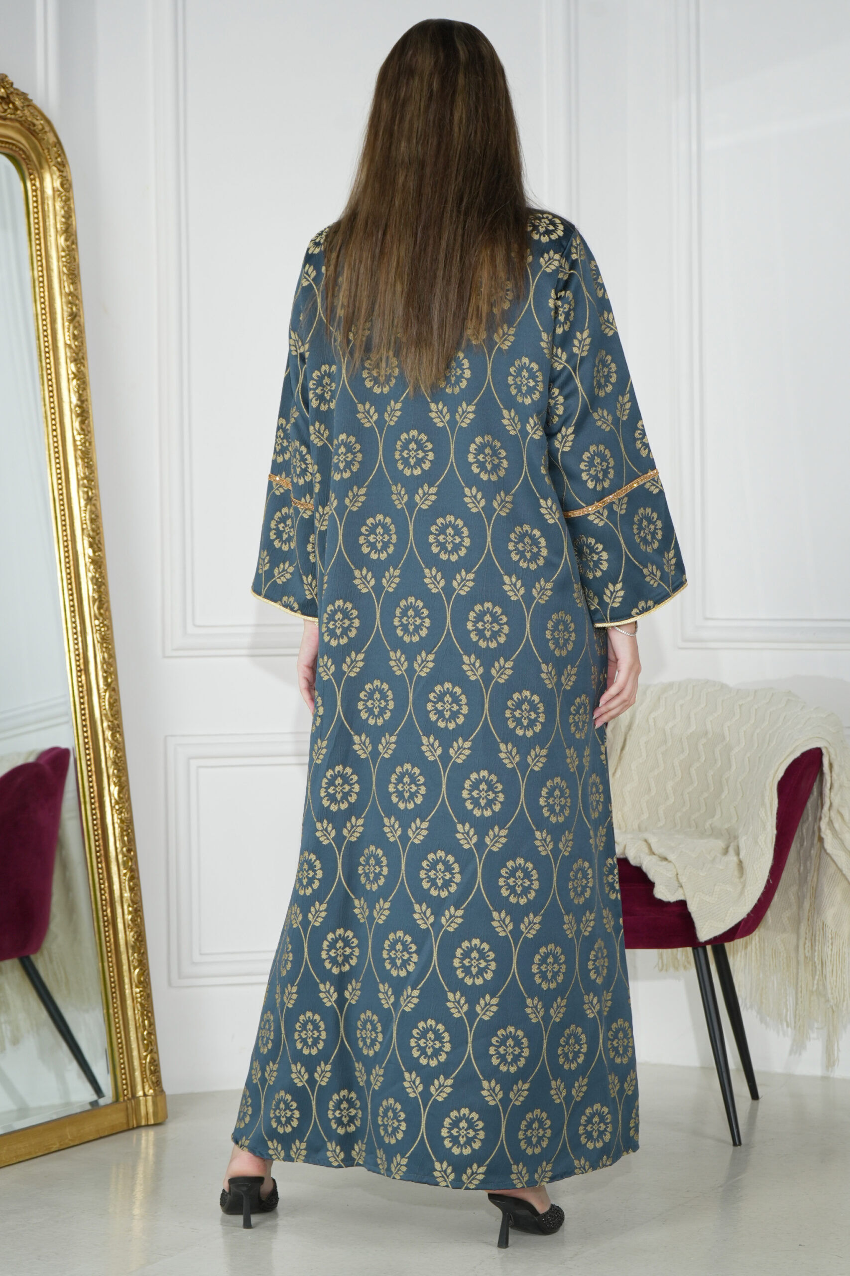 جلابية مشجرة باكمام كلوش لون تيفاني مع شريط شك