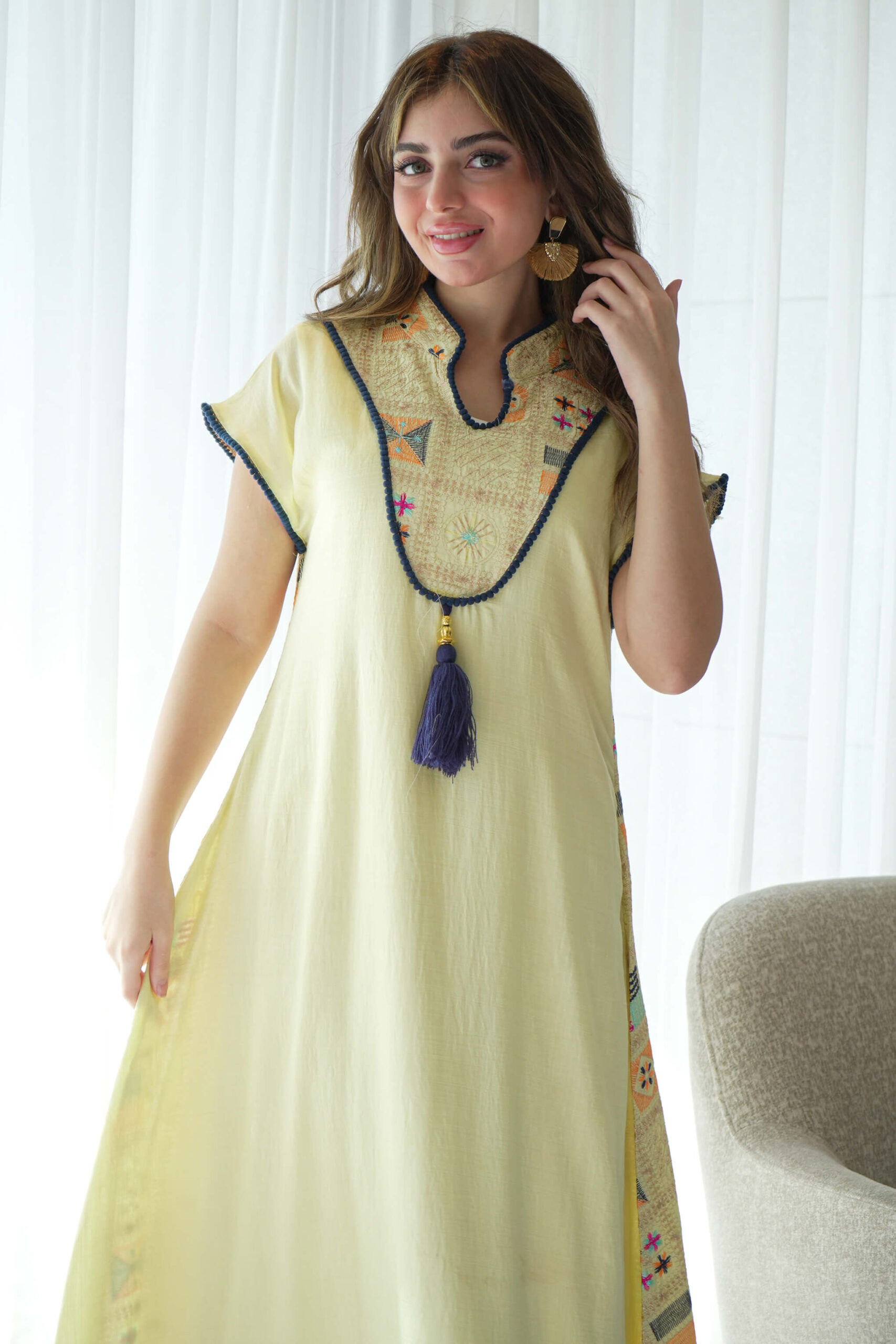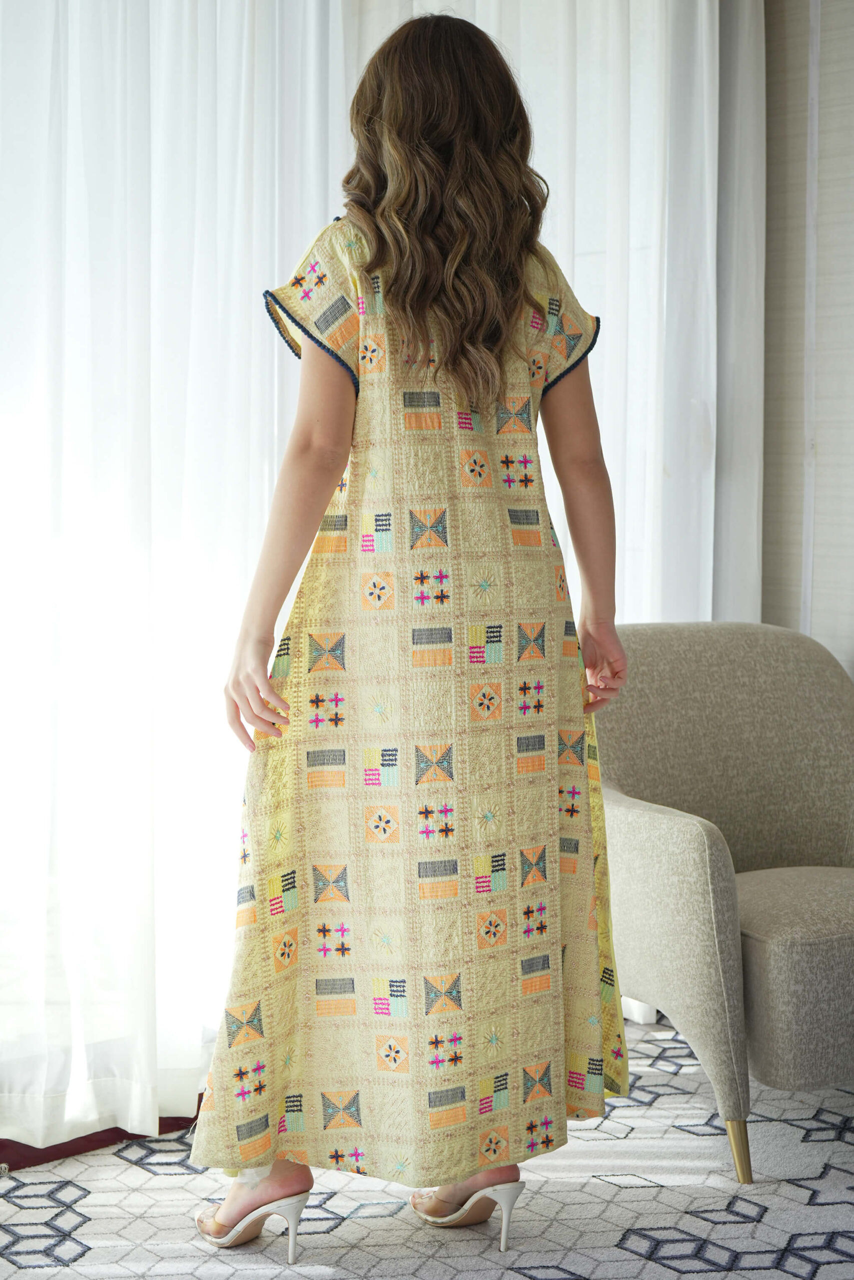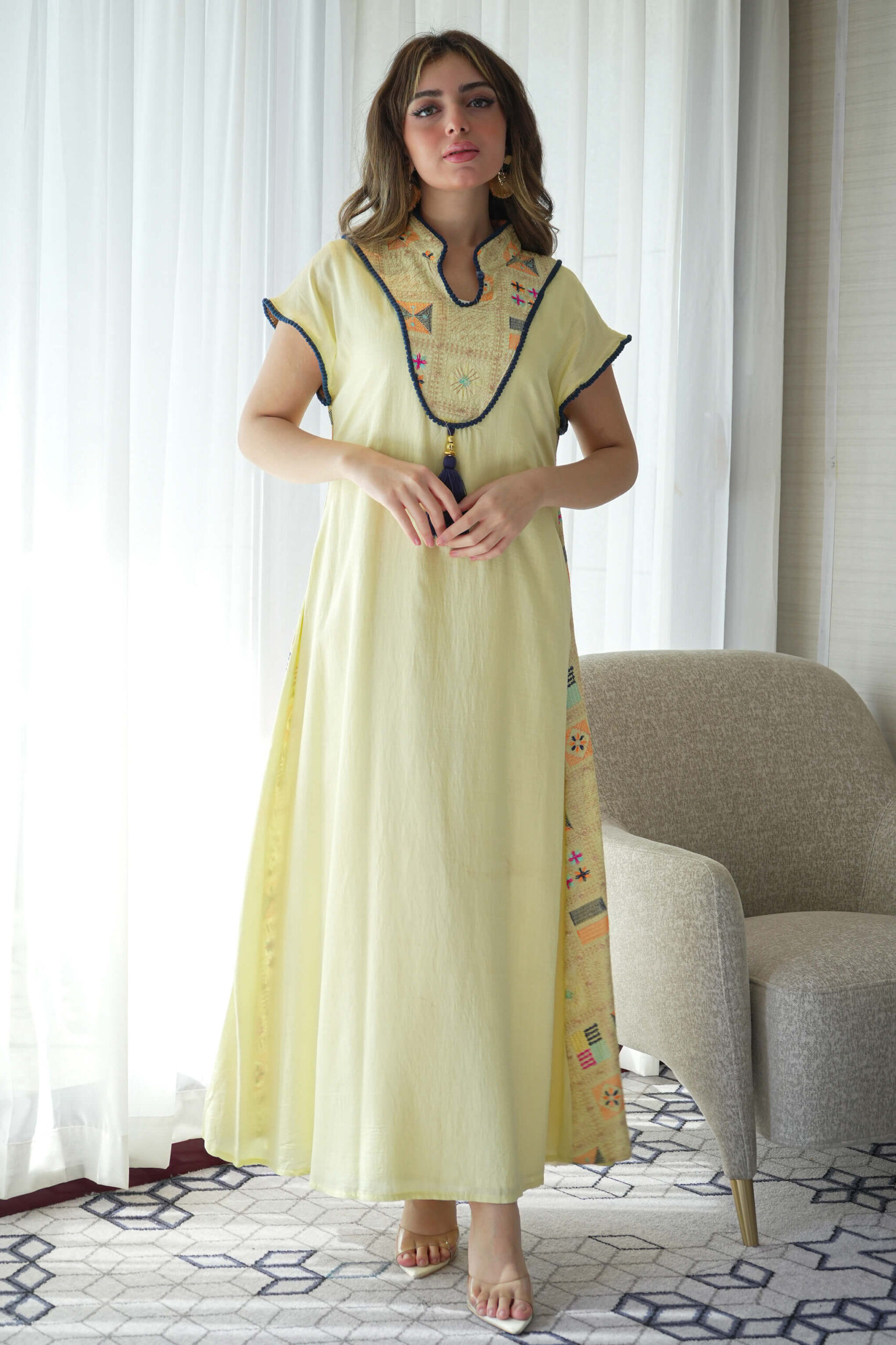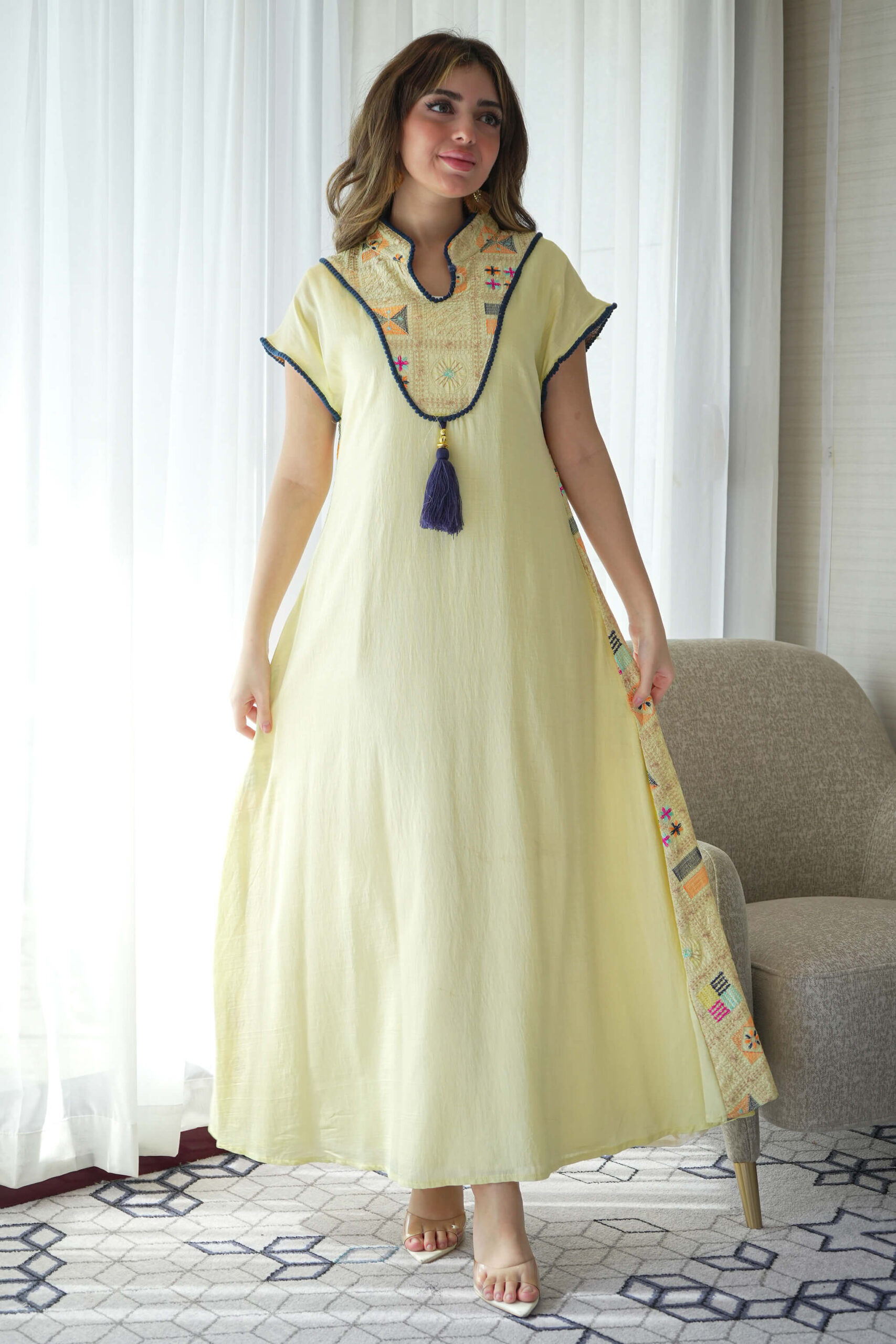 جلابيه اصفر بترتر ملون من حلق و خلف كامل (2)