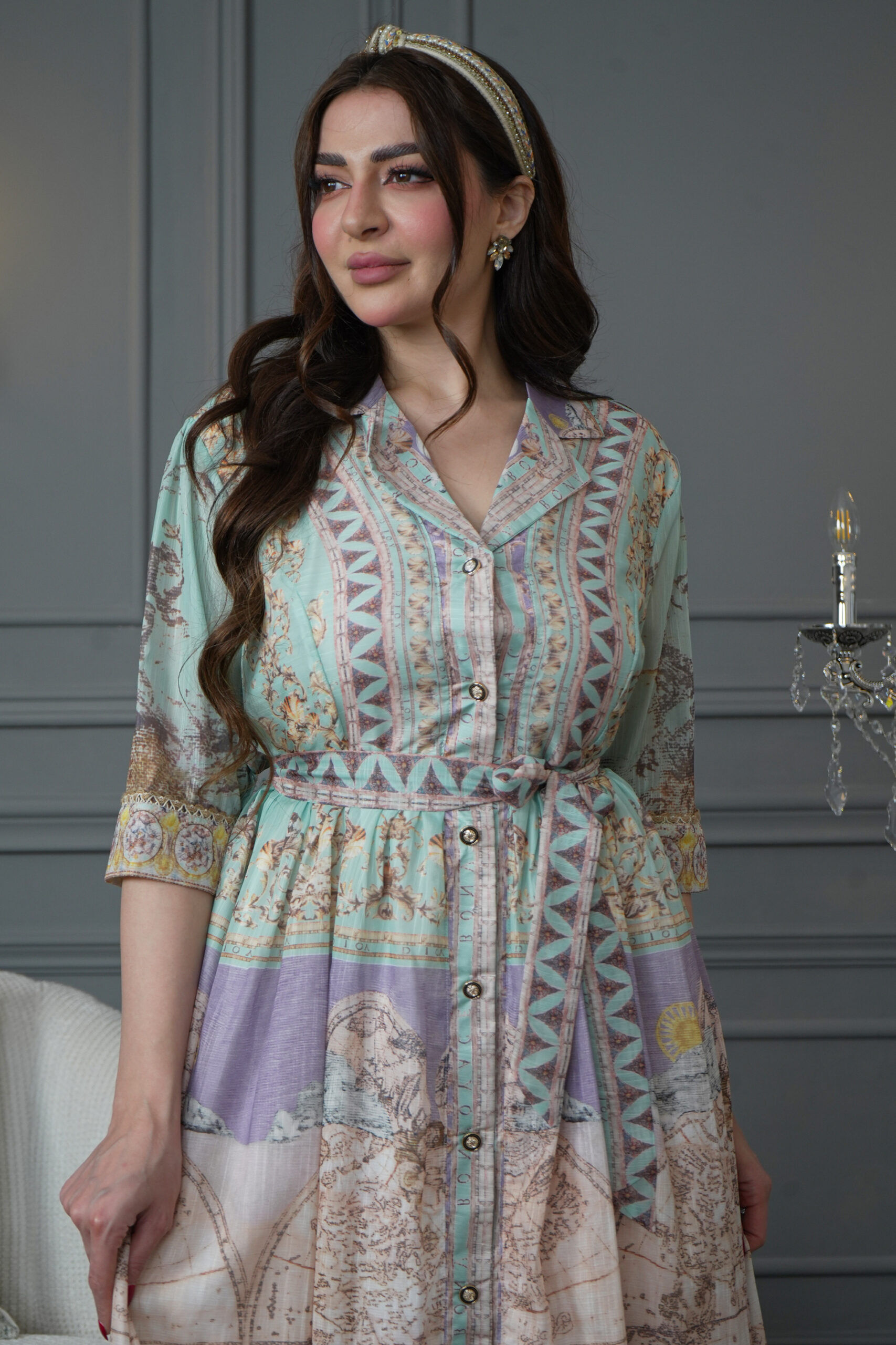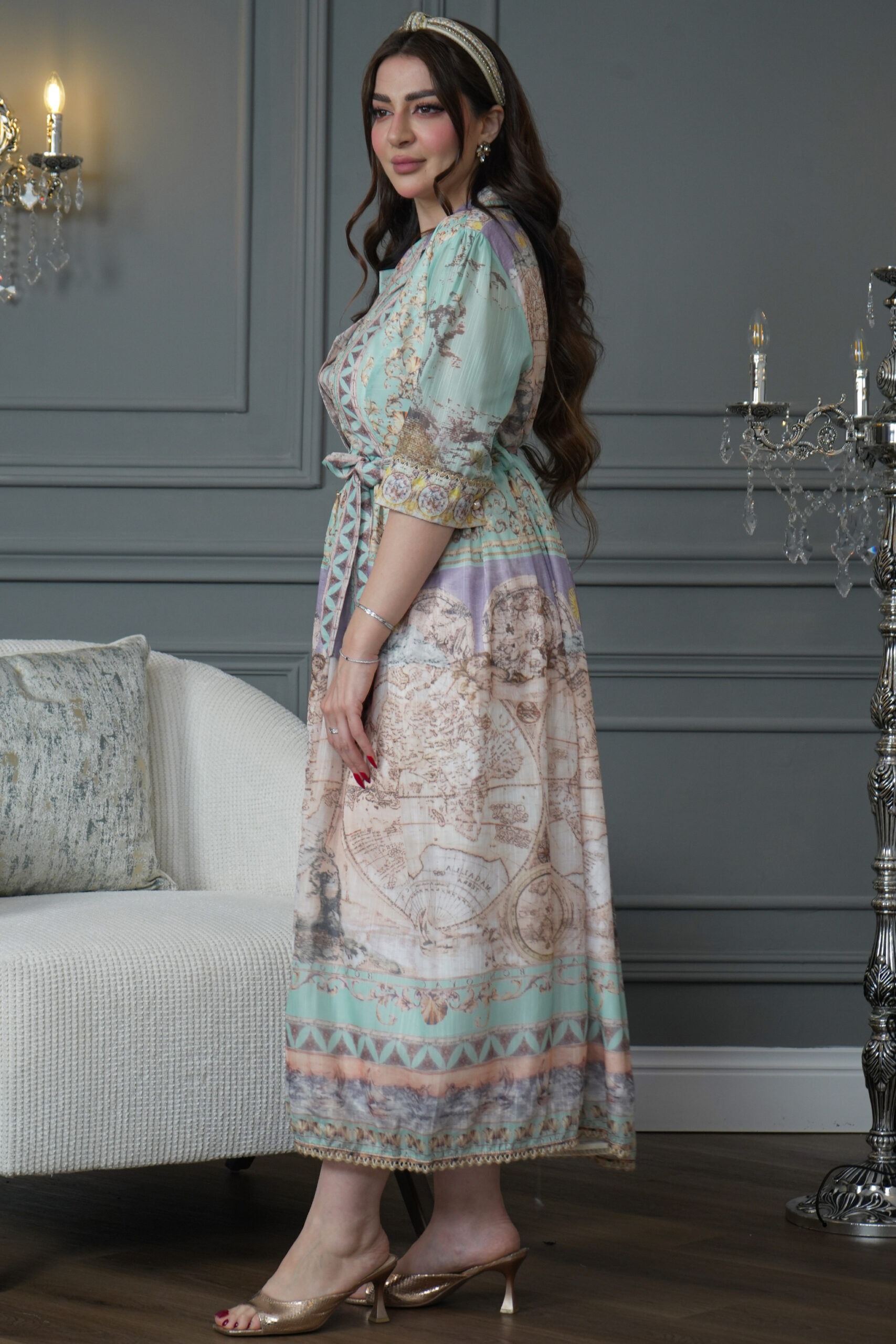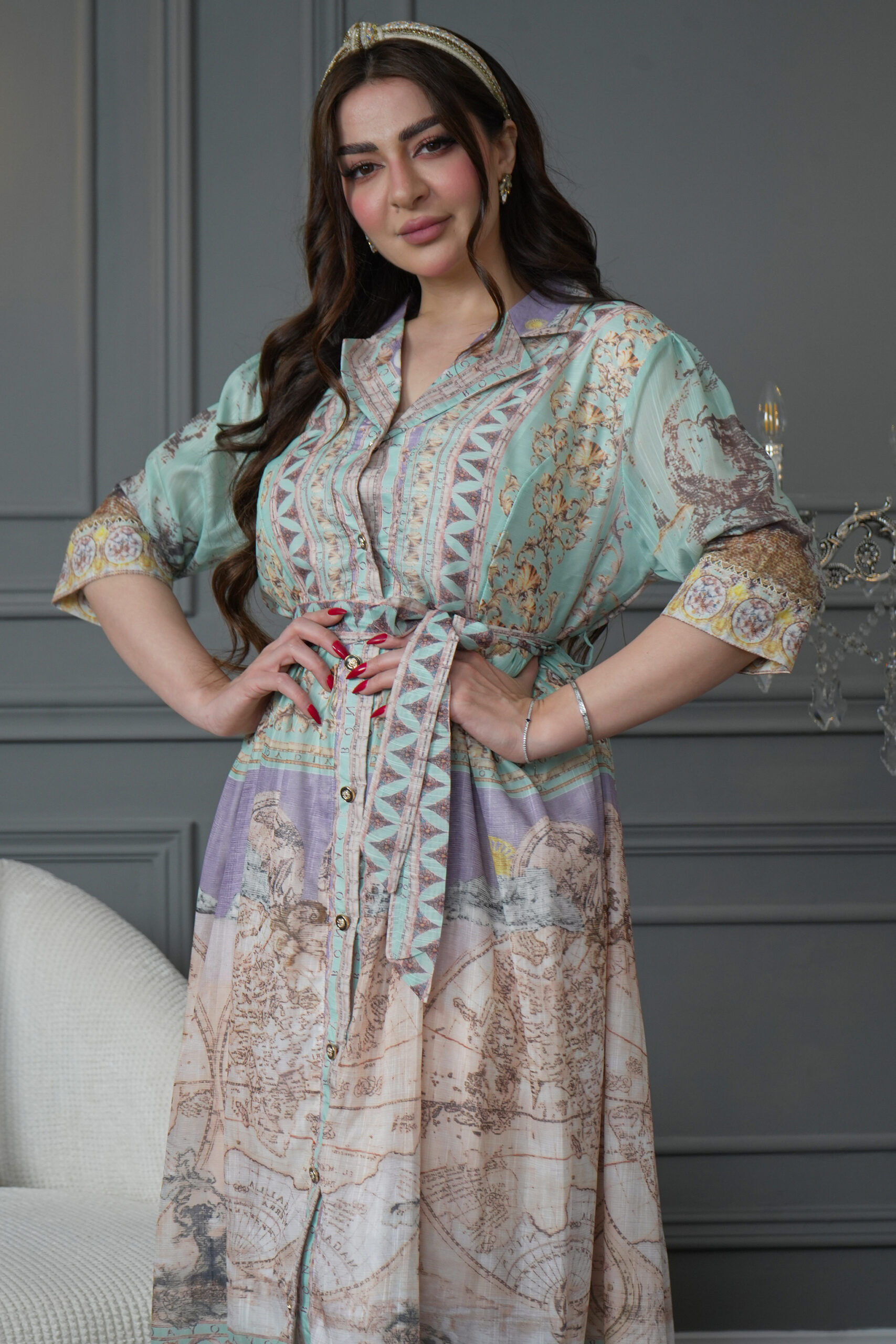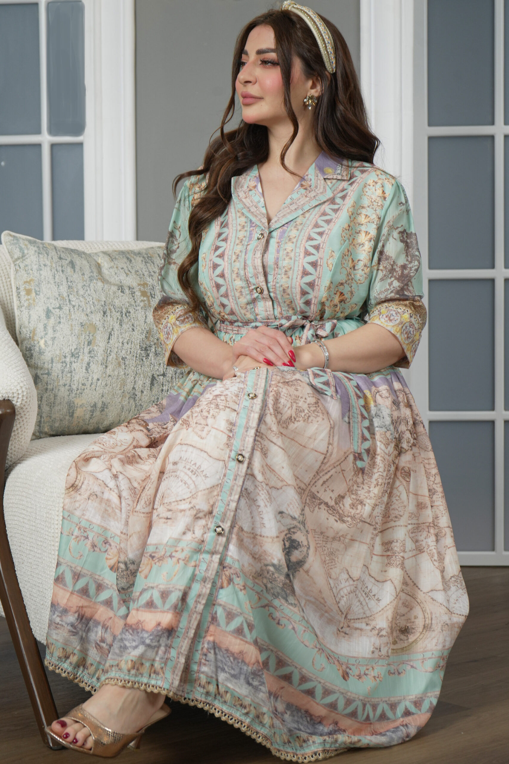 الجلابية مشجره برسم مبتكر مع ربطة على الخصر بنفس تشجيره .