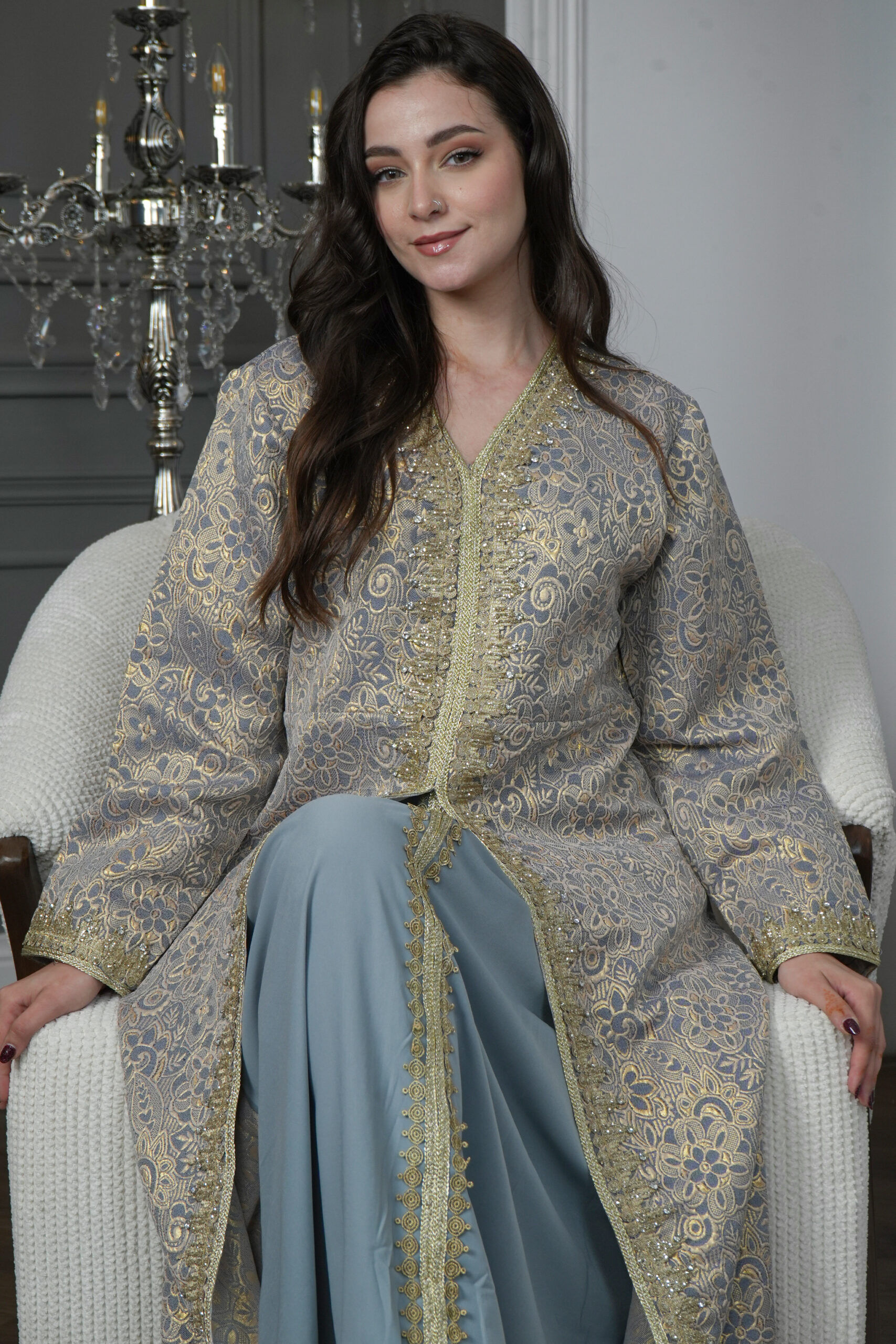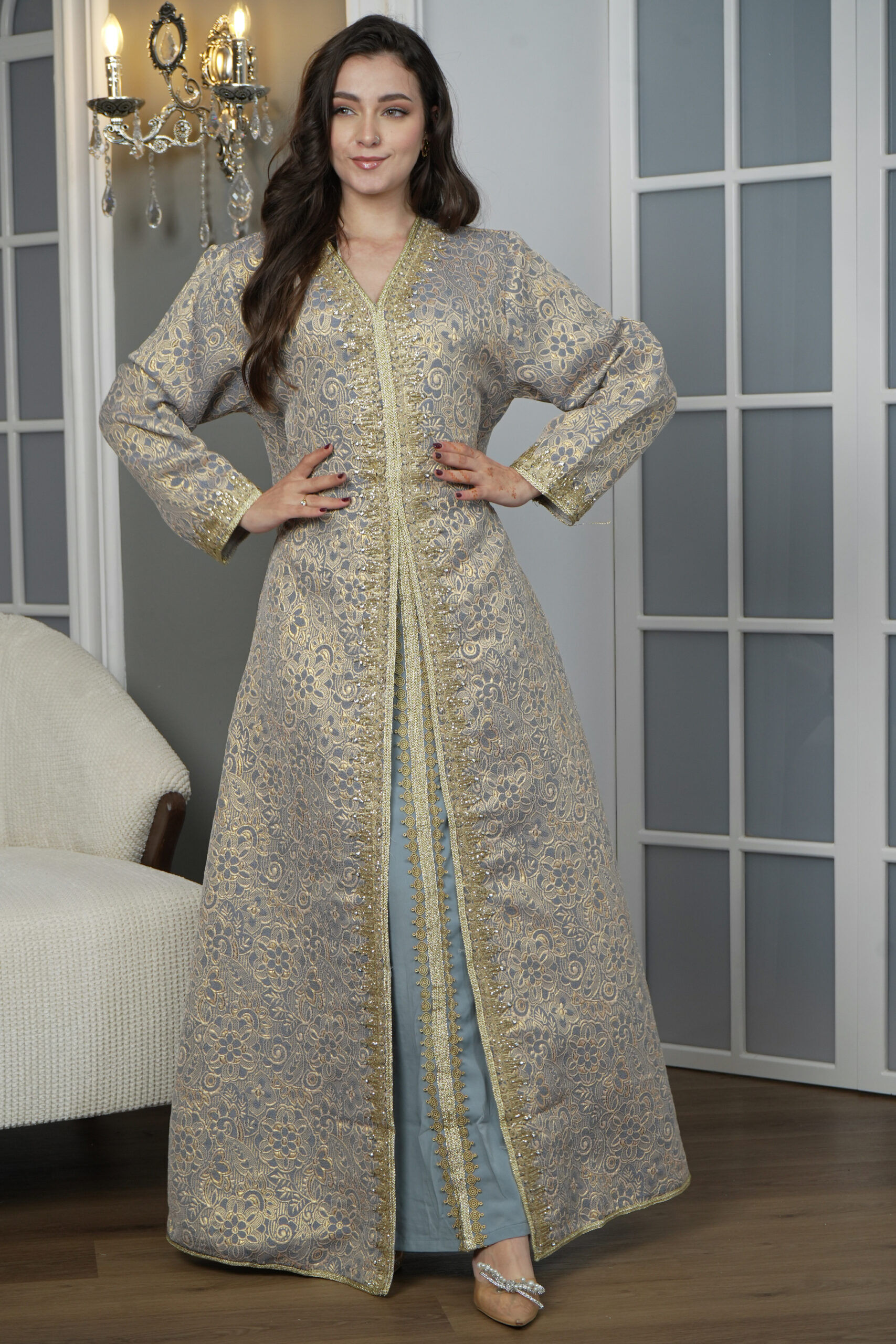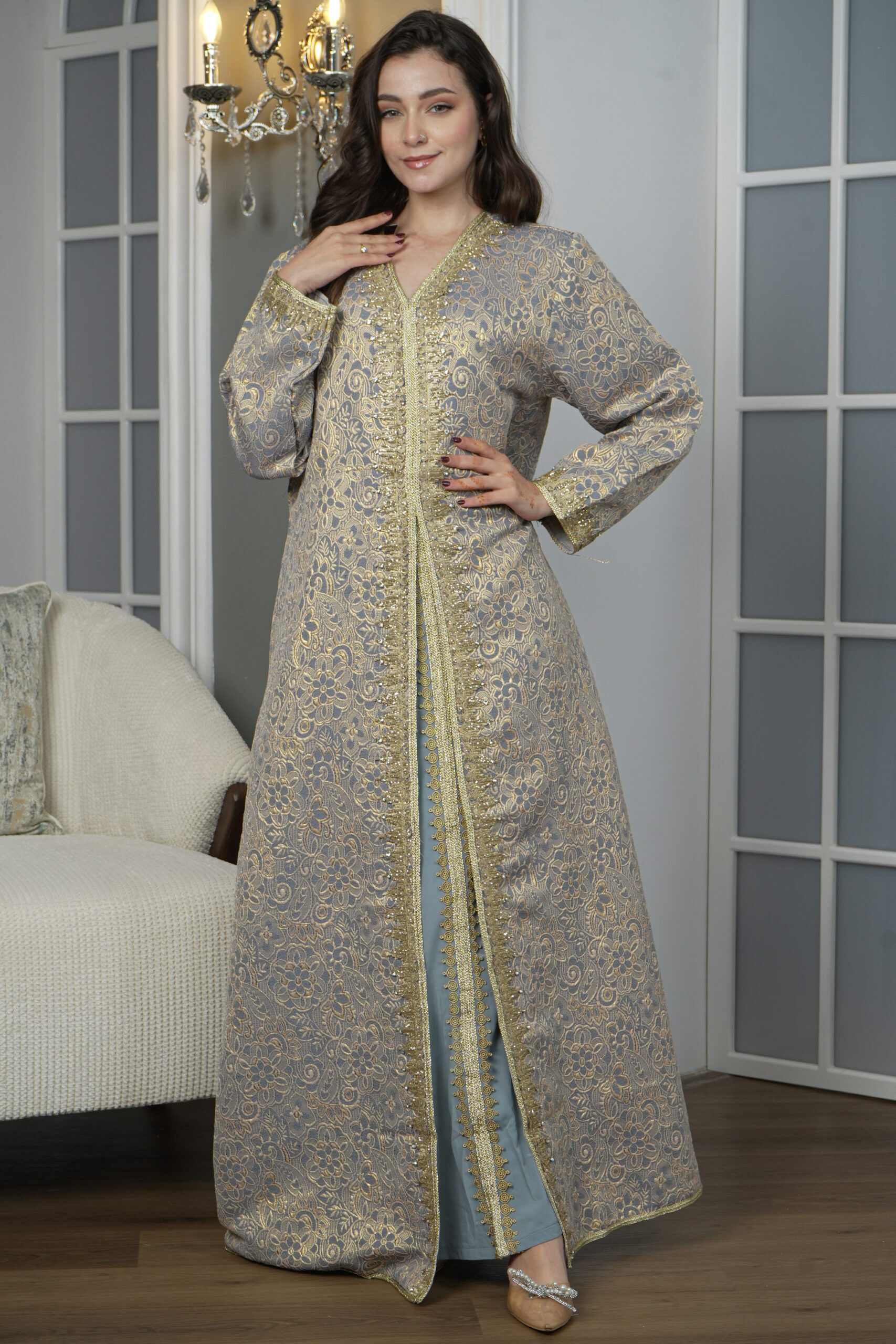 جلابيه تركواز مفتوح بطبقه داخليه مع شريط ذهبي
