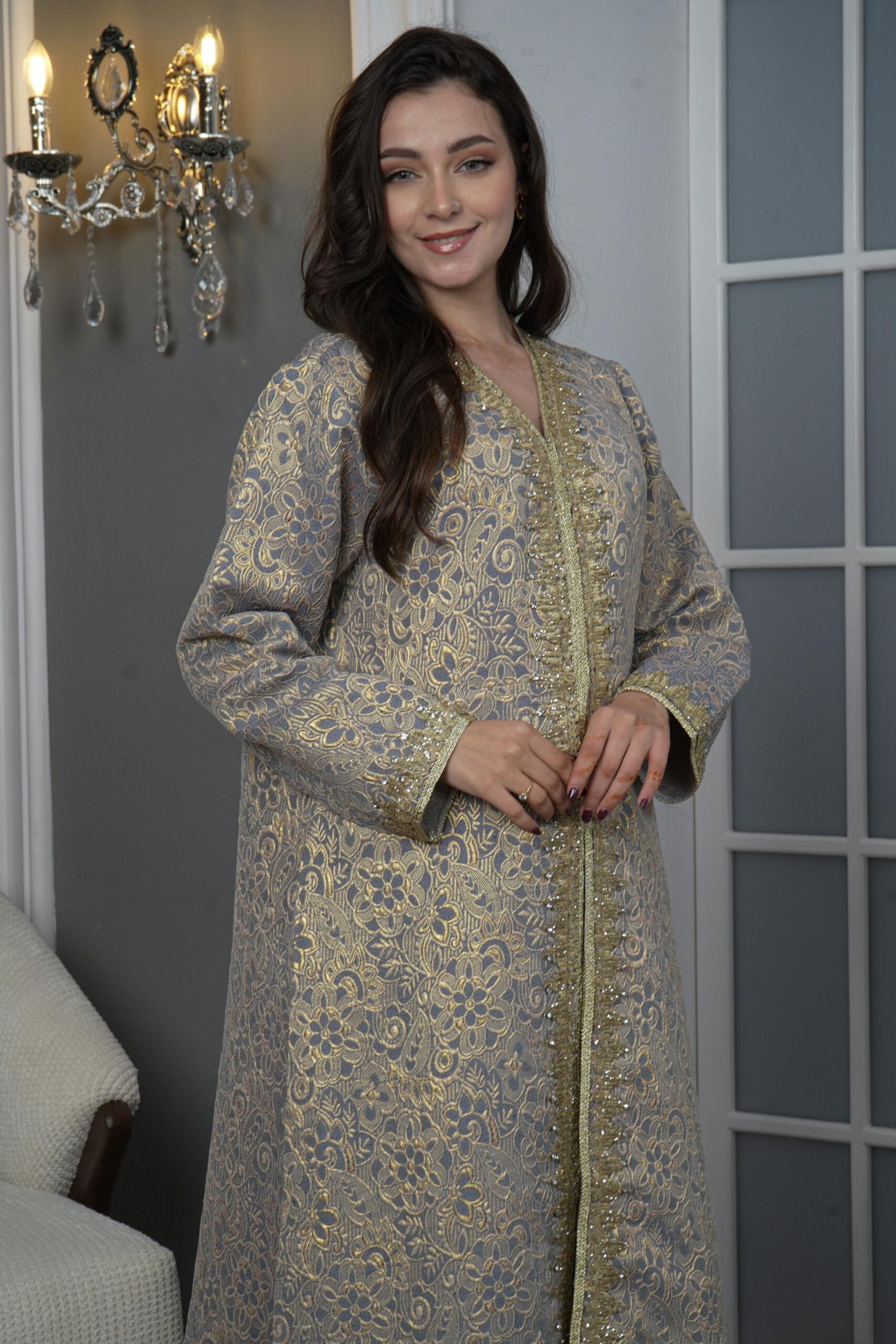 - اسم المنتج : جلابيه جاكار مطرزه بشريط ذهبي مع فصوص