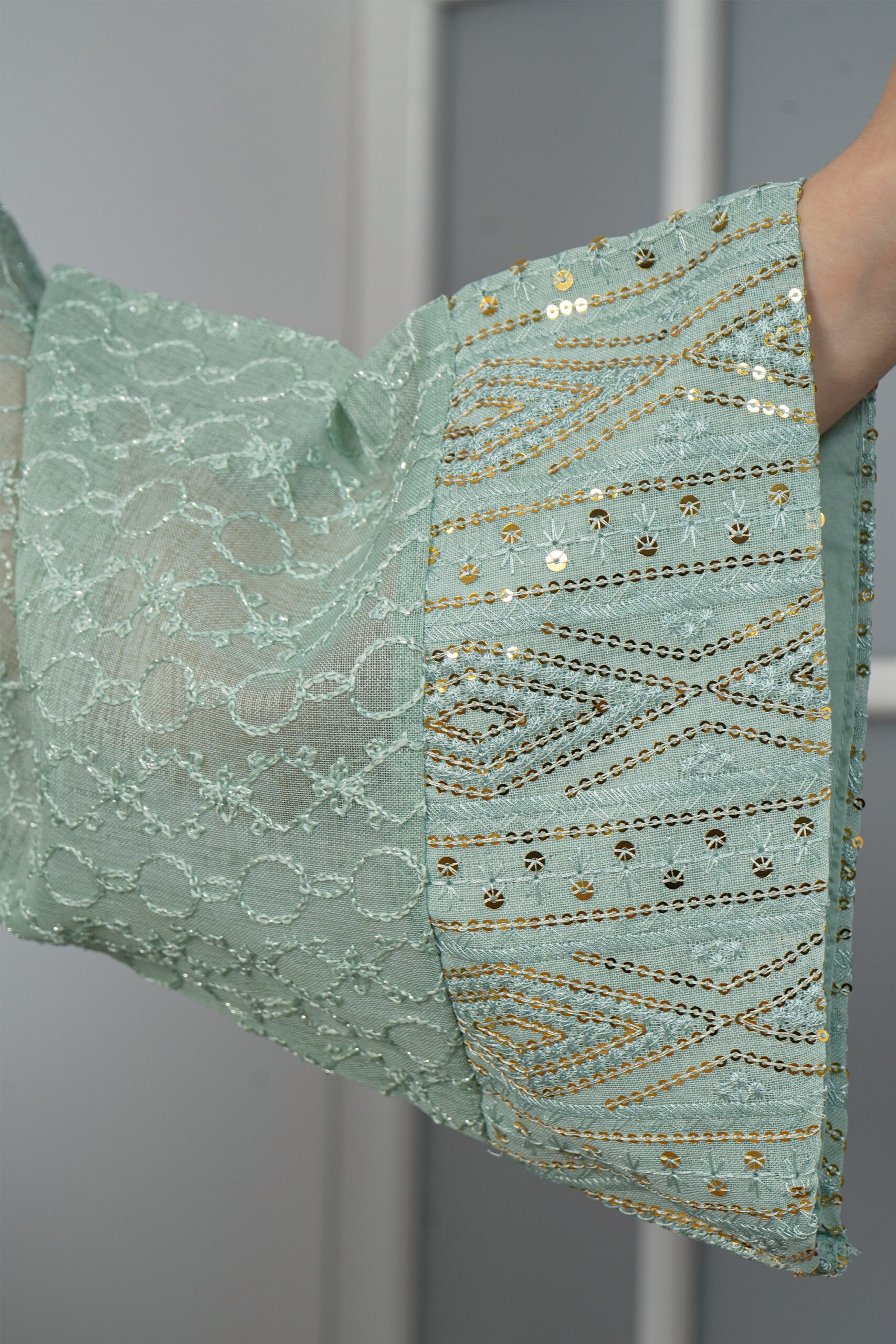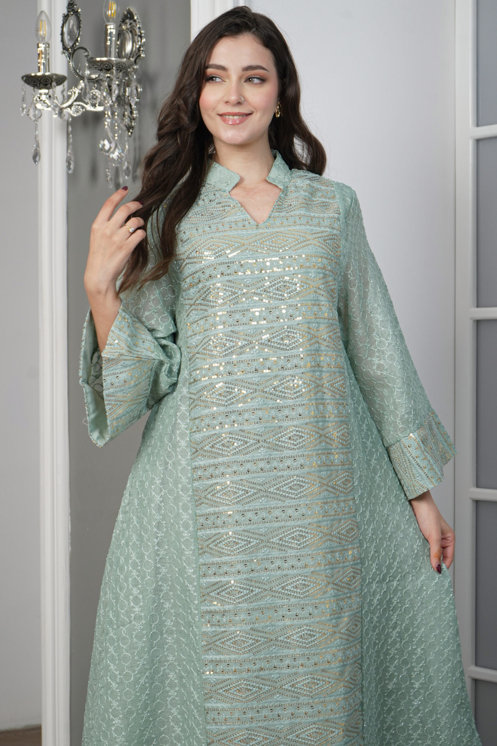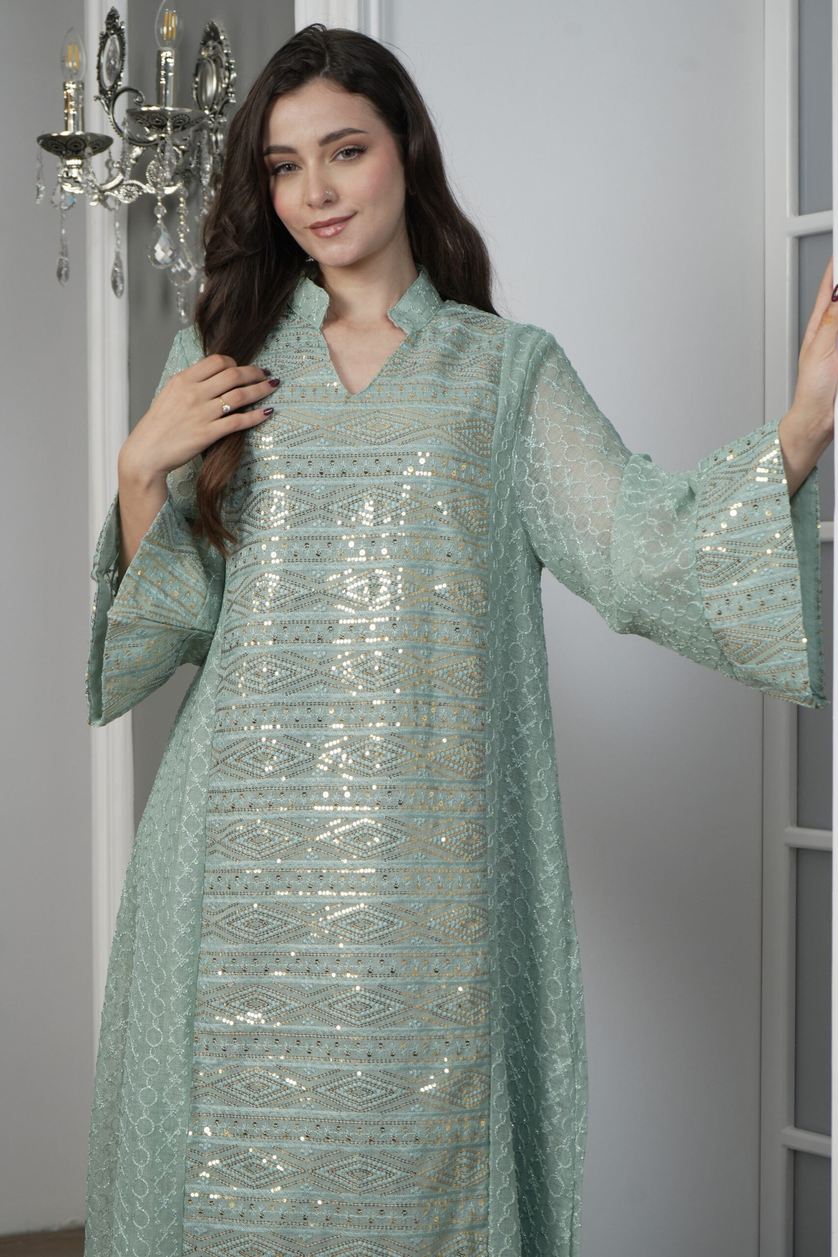 الجلابية نسجت من خامة قطن مطرز بذهبي مع خام ترتر من امام و خلف، صممت بلياقه و تطريز بلون ذهبي و باكمام ايظن ترتر لتمنحك إطلالة تستحقينها.