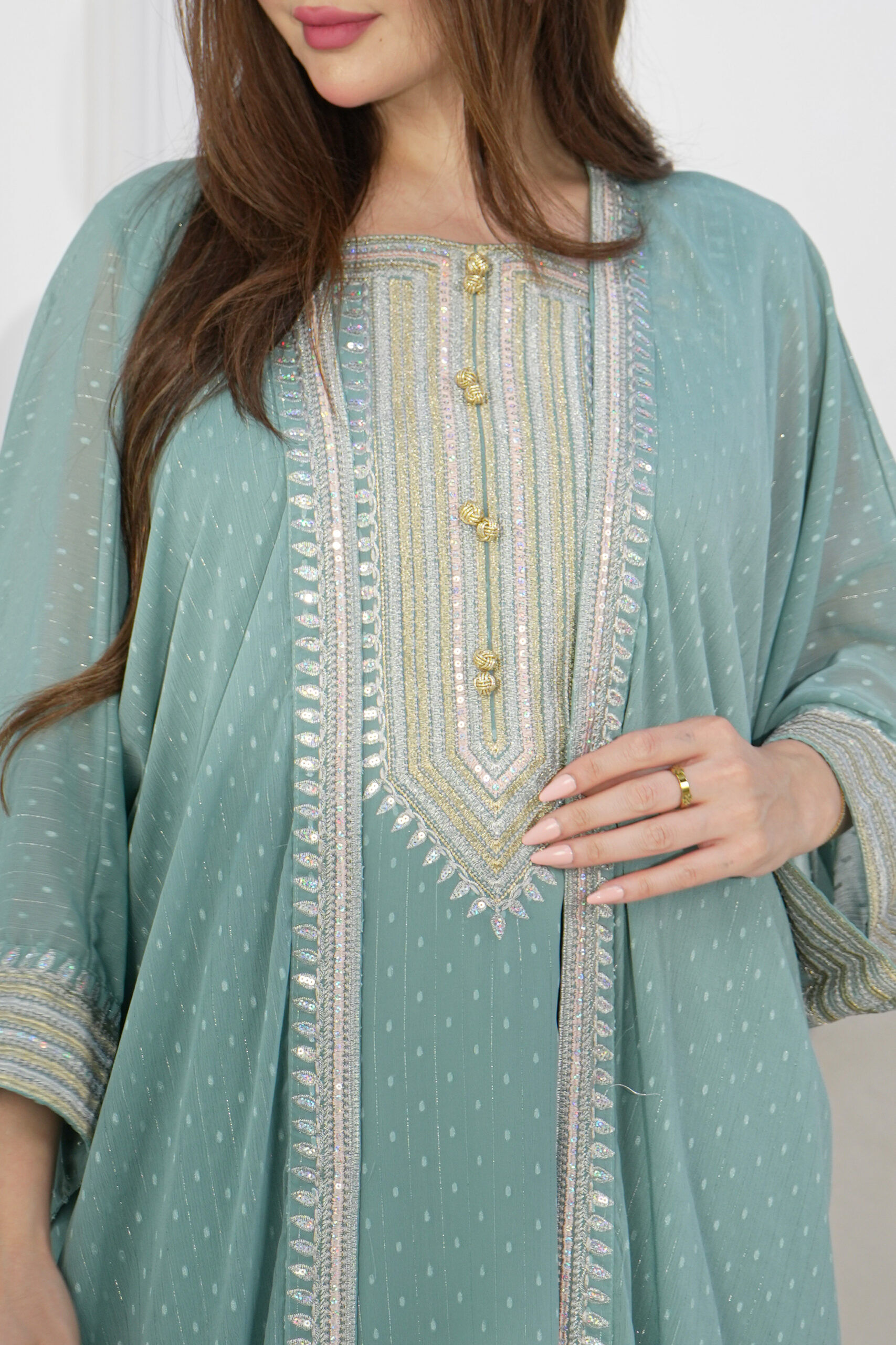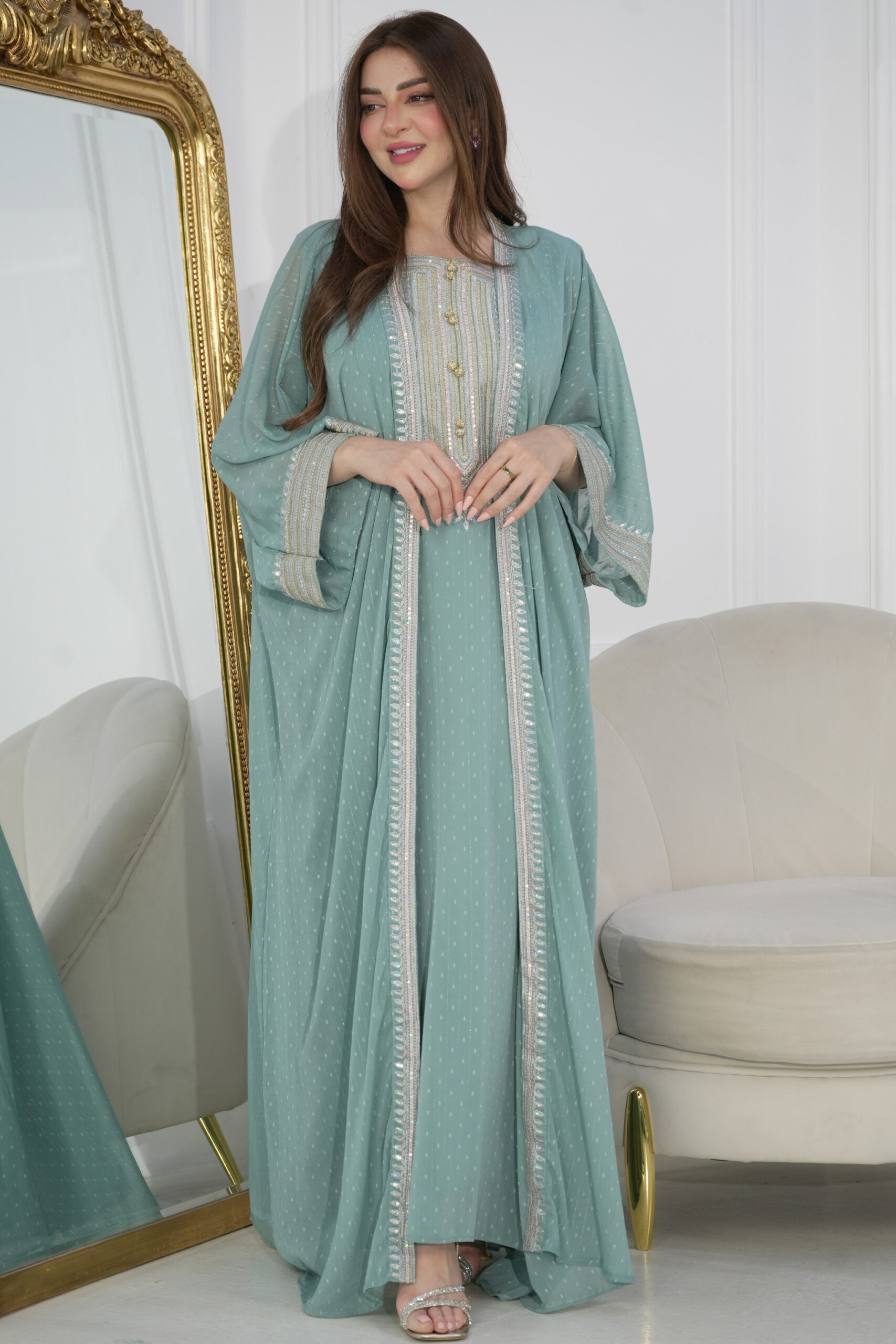 - الموديل: جلابية مفتوحة بلون تيفاني ذات تصميم جذاب ومميز