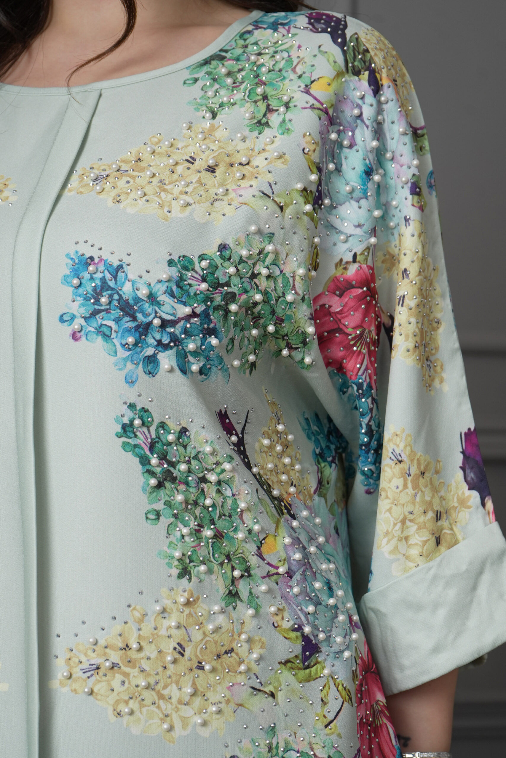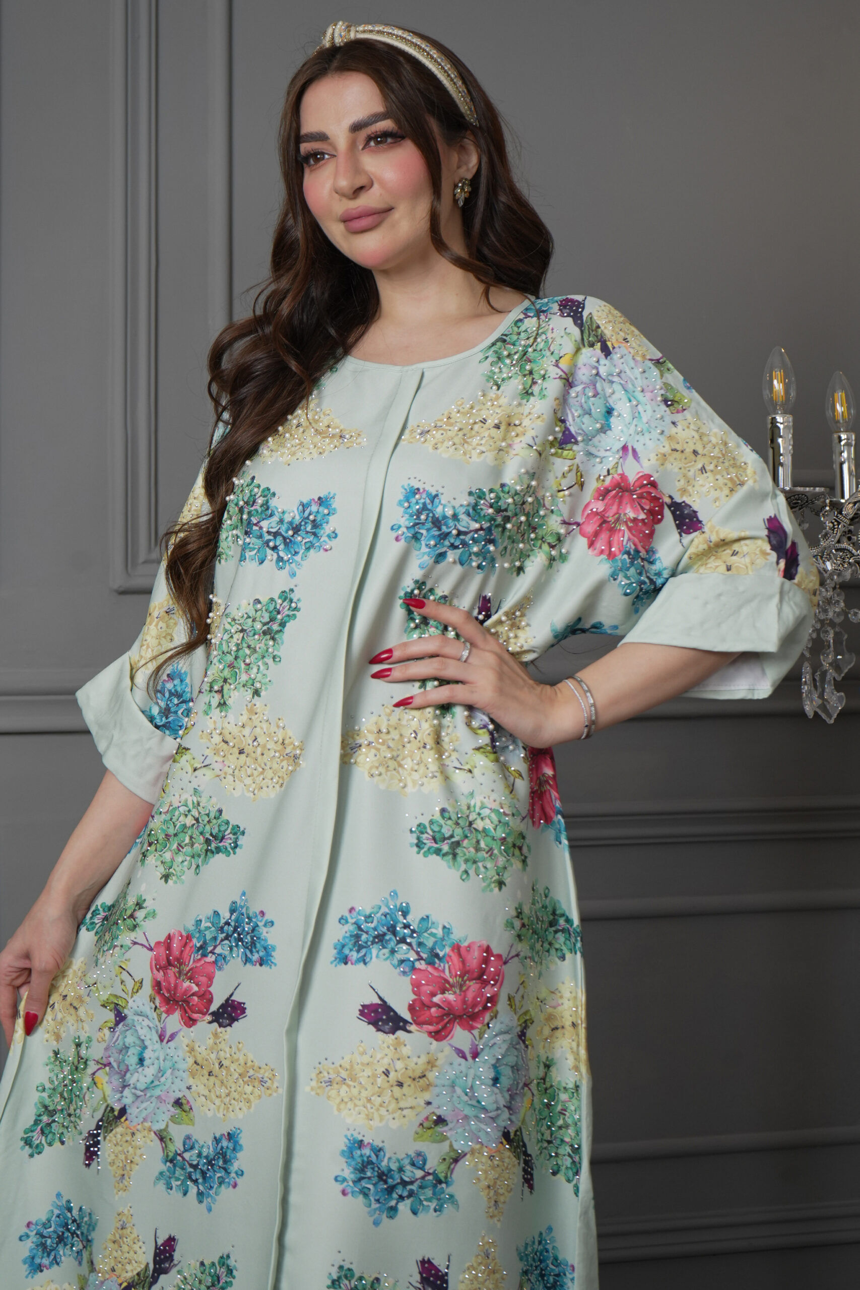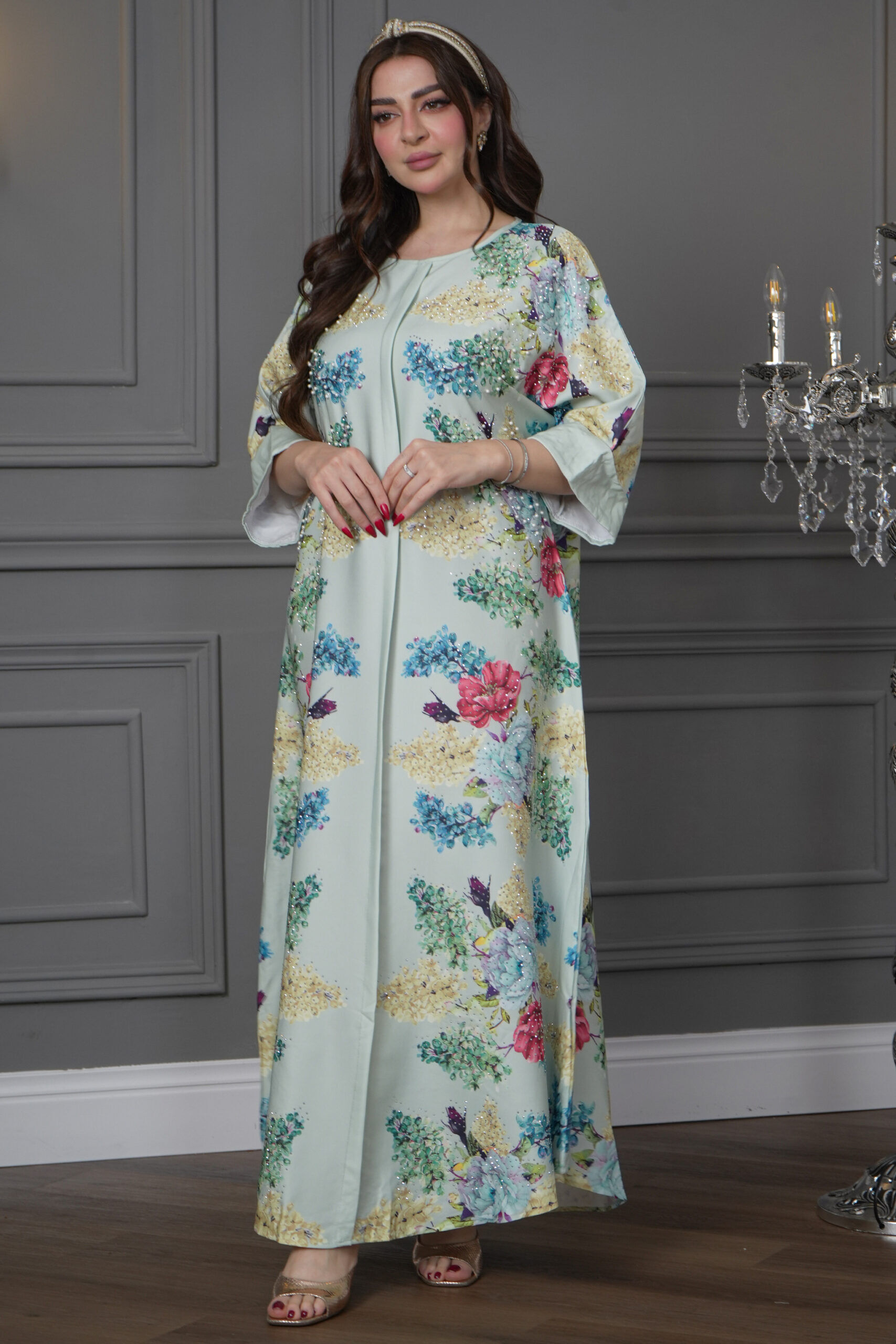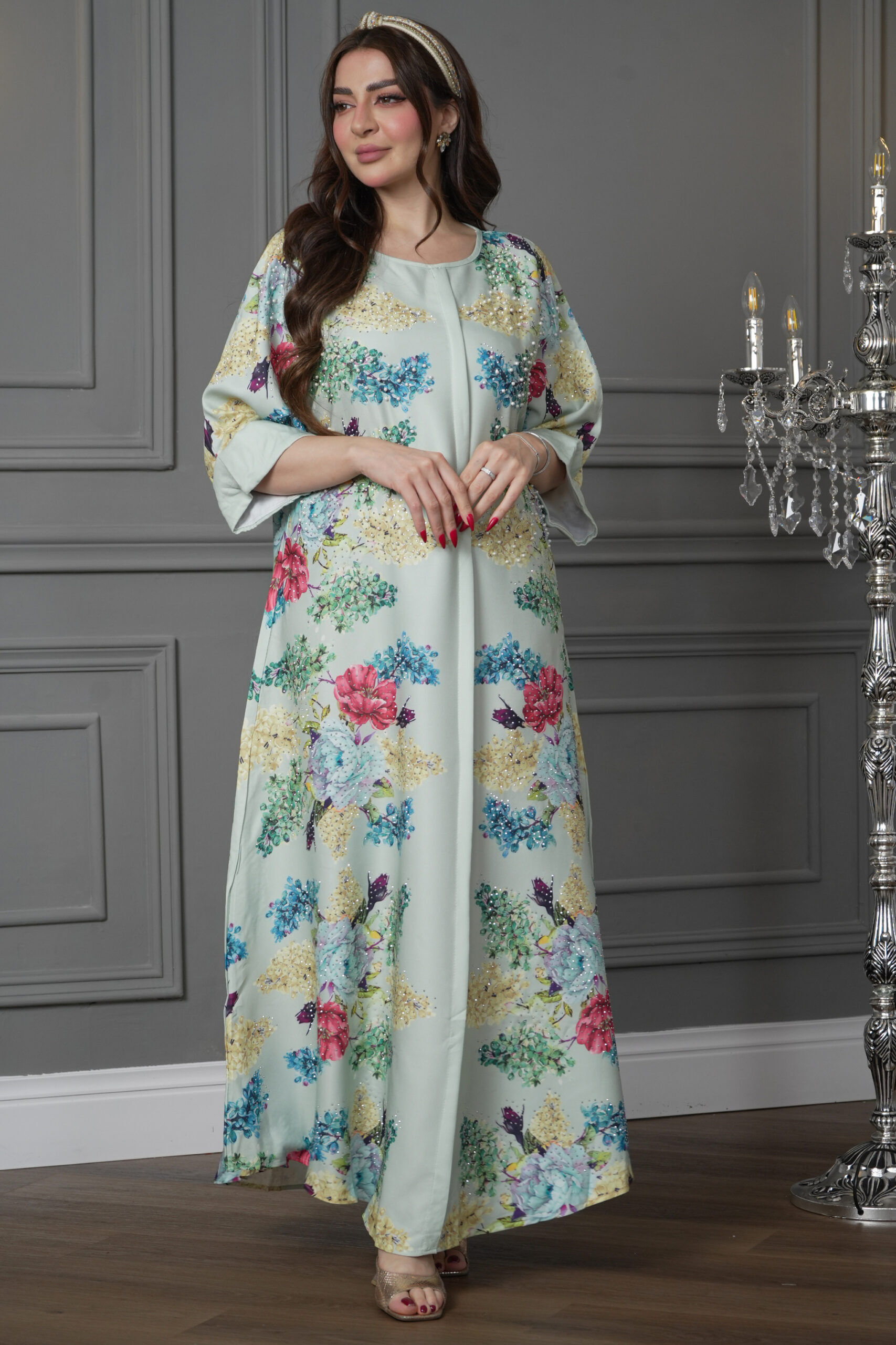 جلابيه تيفاني مرسومه بورود ملون و كبس لولو