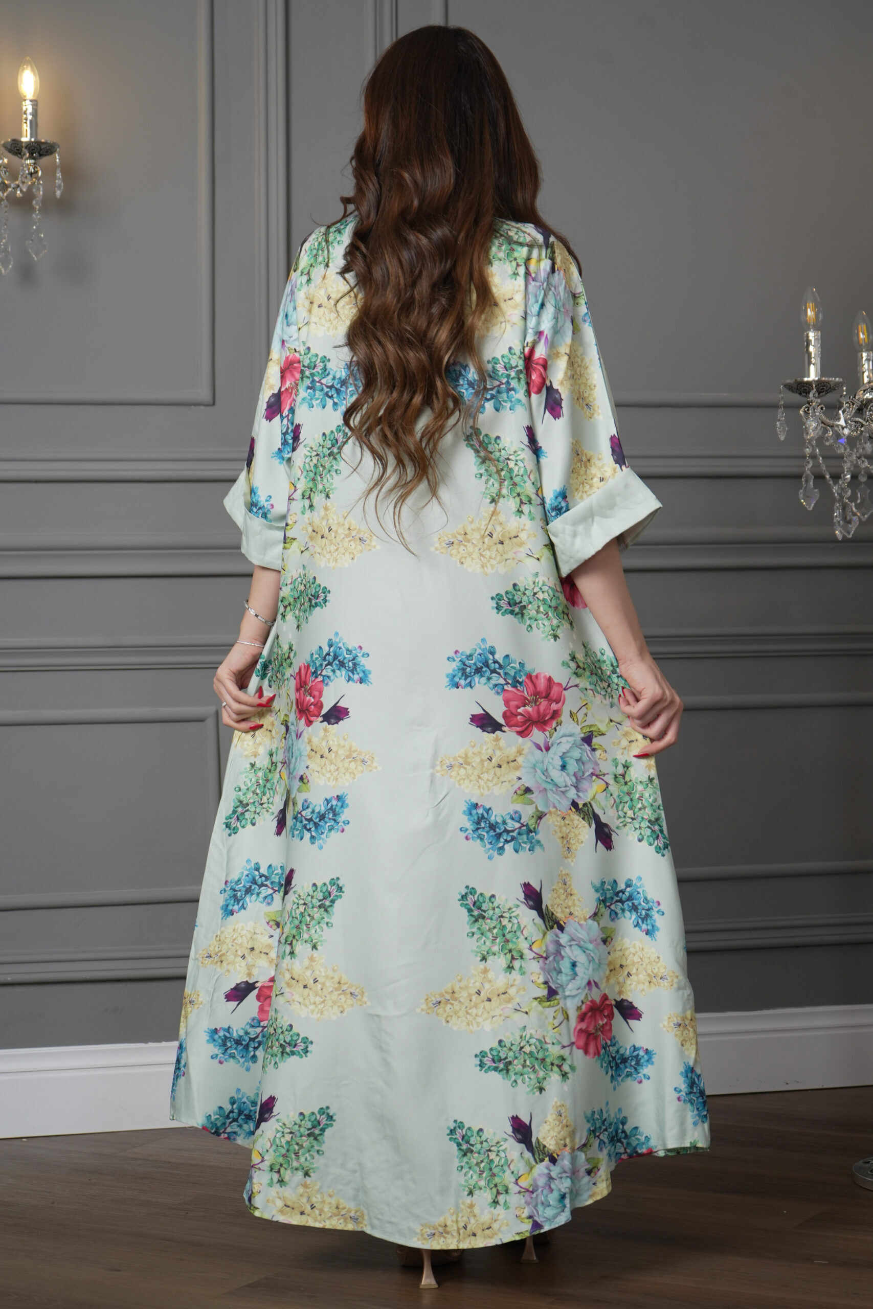 جلابية تيفاني مرسومه بورود ملونه جذابة تجعل إطلالتكِ تضجّ بلأناقة والجمال.