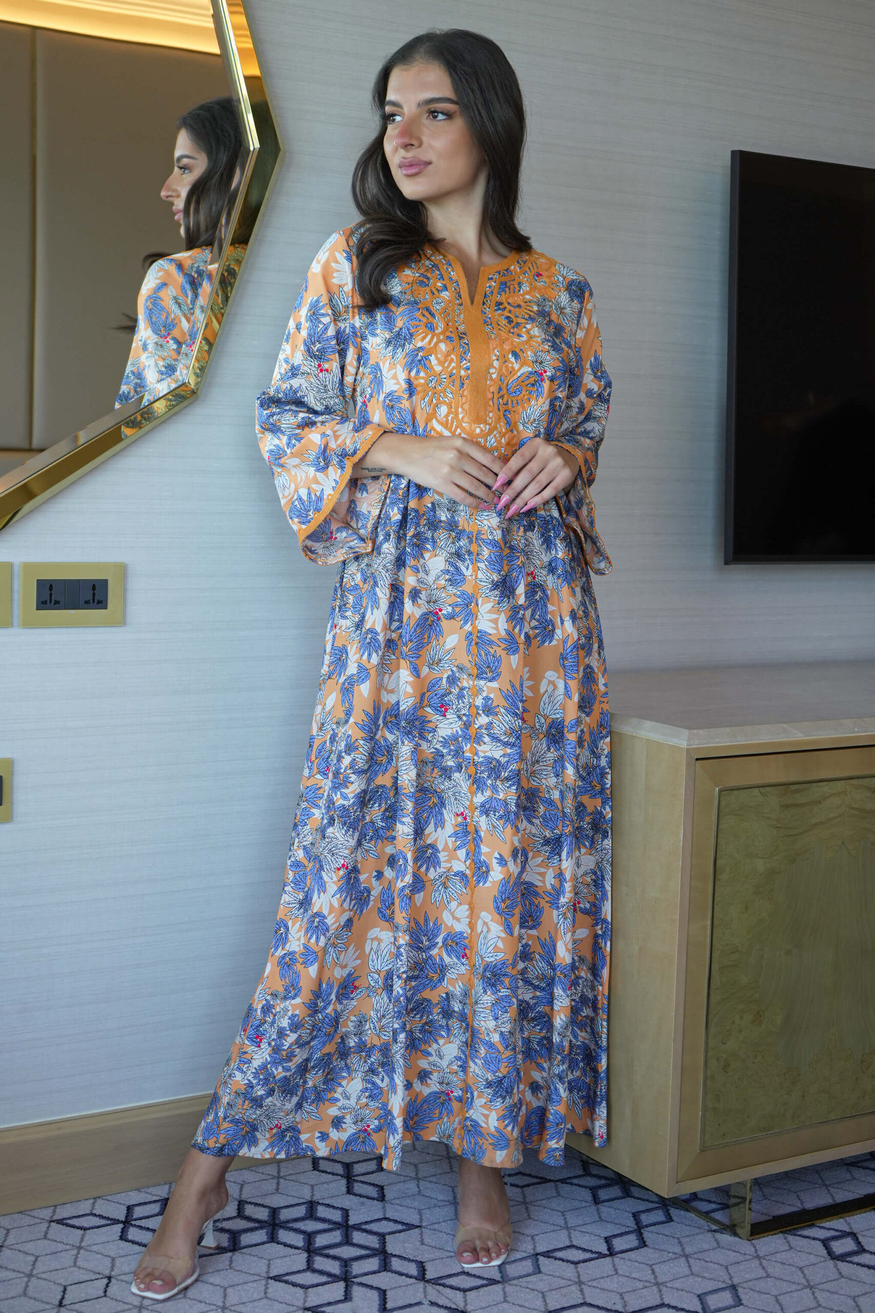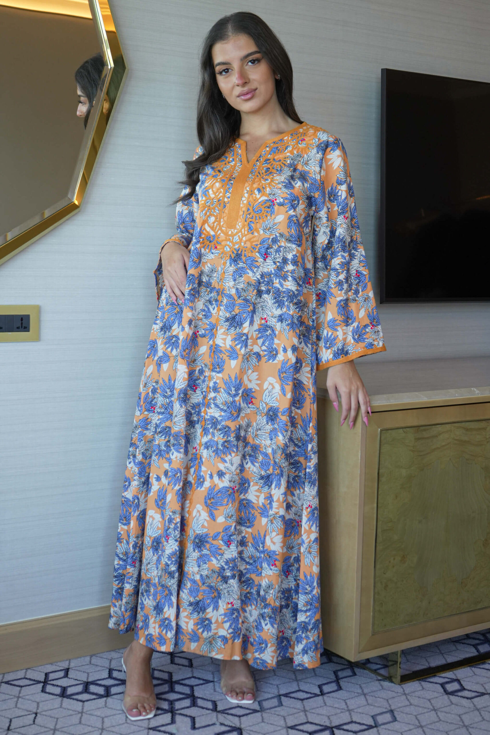 جلابيه خربزي مزينه بقماش زهور و شريط مدققه بلون خربزي من حلق و اكمام