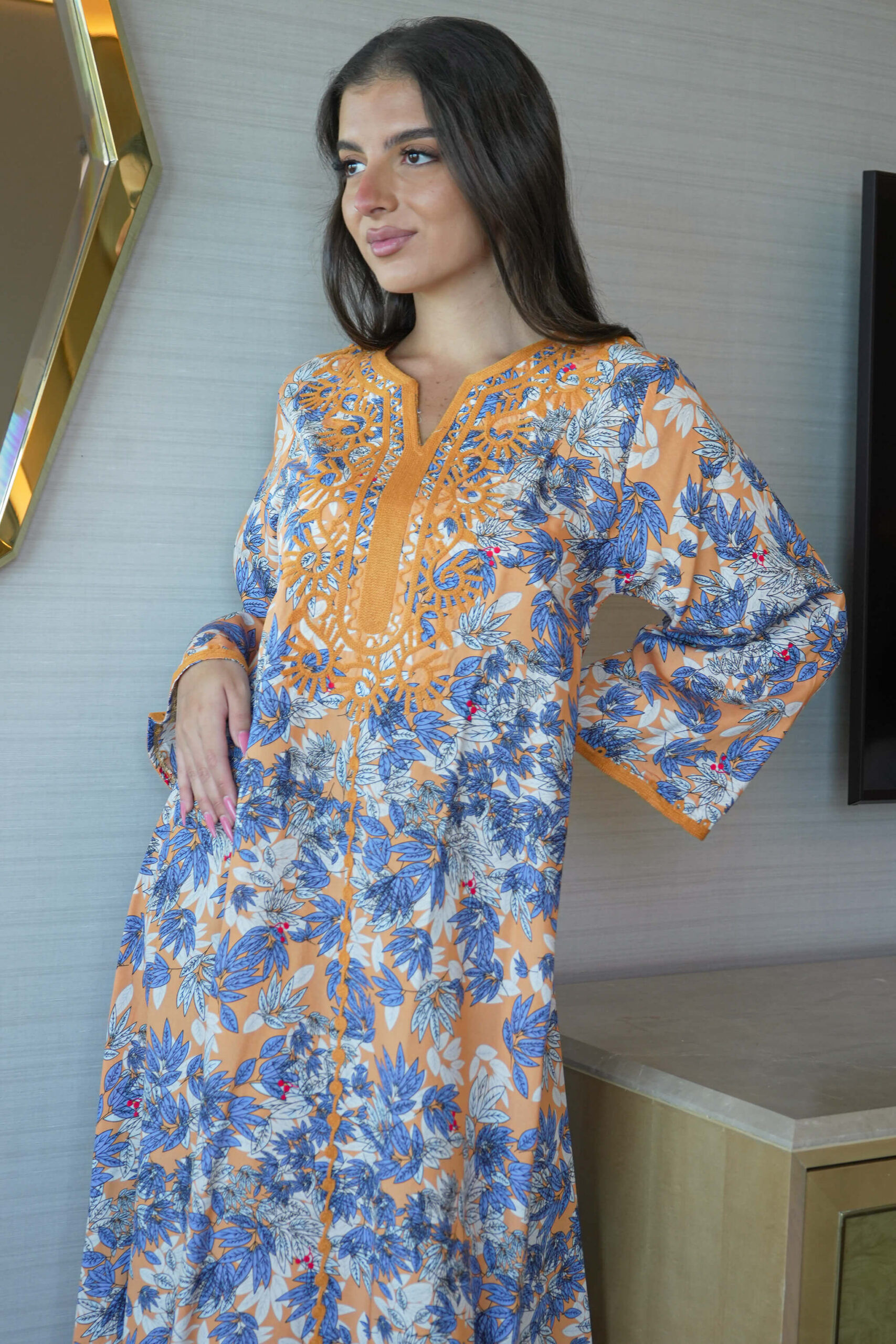 جلابية خربزي ساترة و محتشمة بتطريز على الصدر بدقات وعلى الاكمام بلون خربزي عندك مناسبة مهمة !؟ لا تتردين في إختيارها :