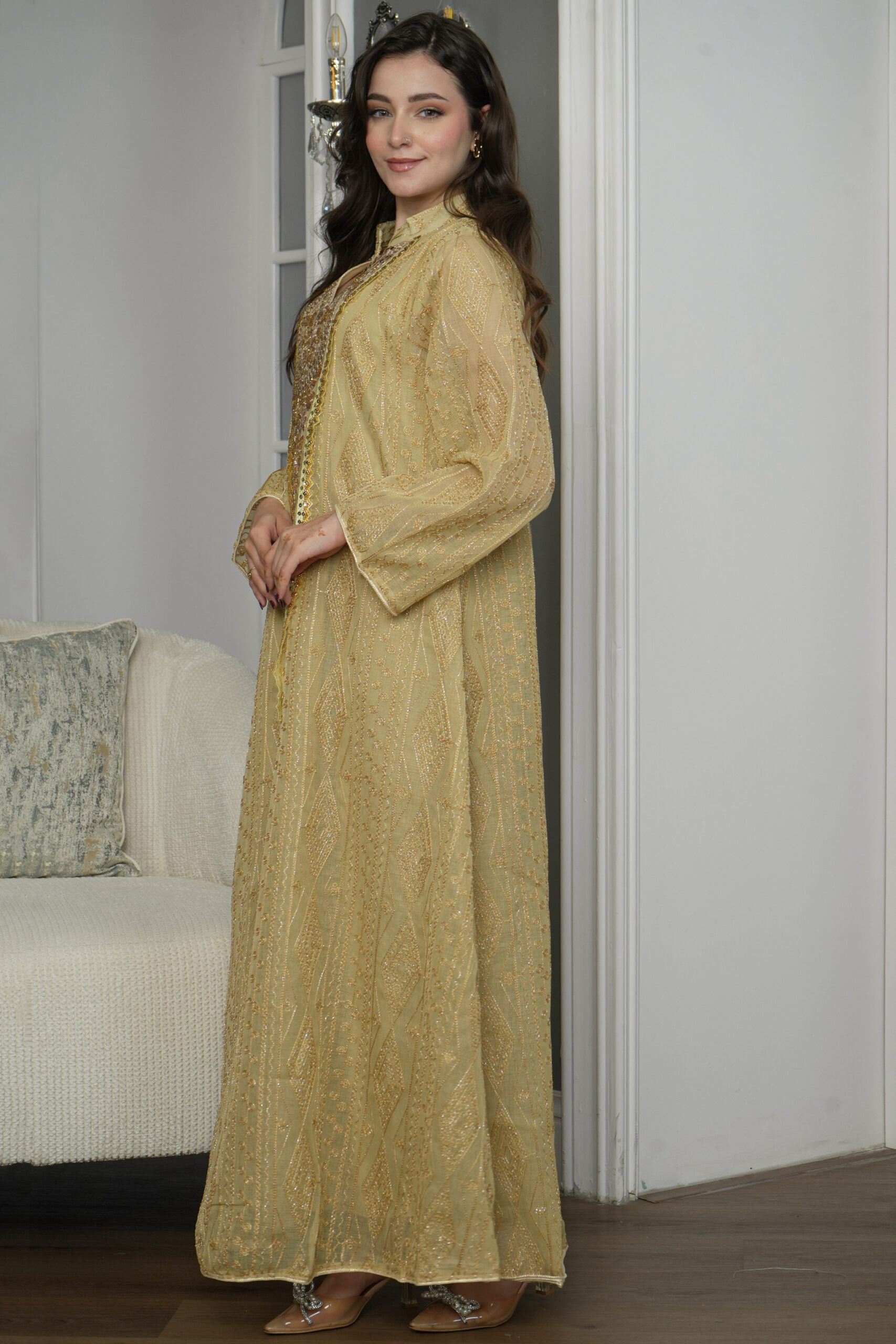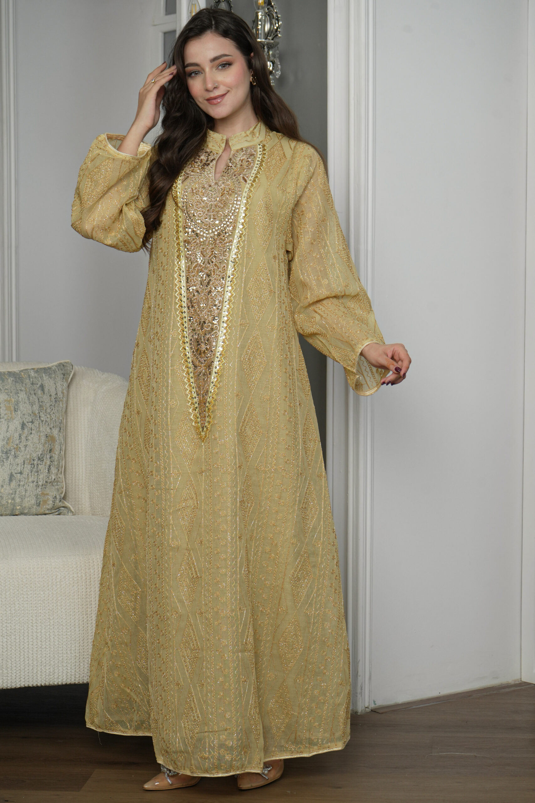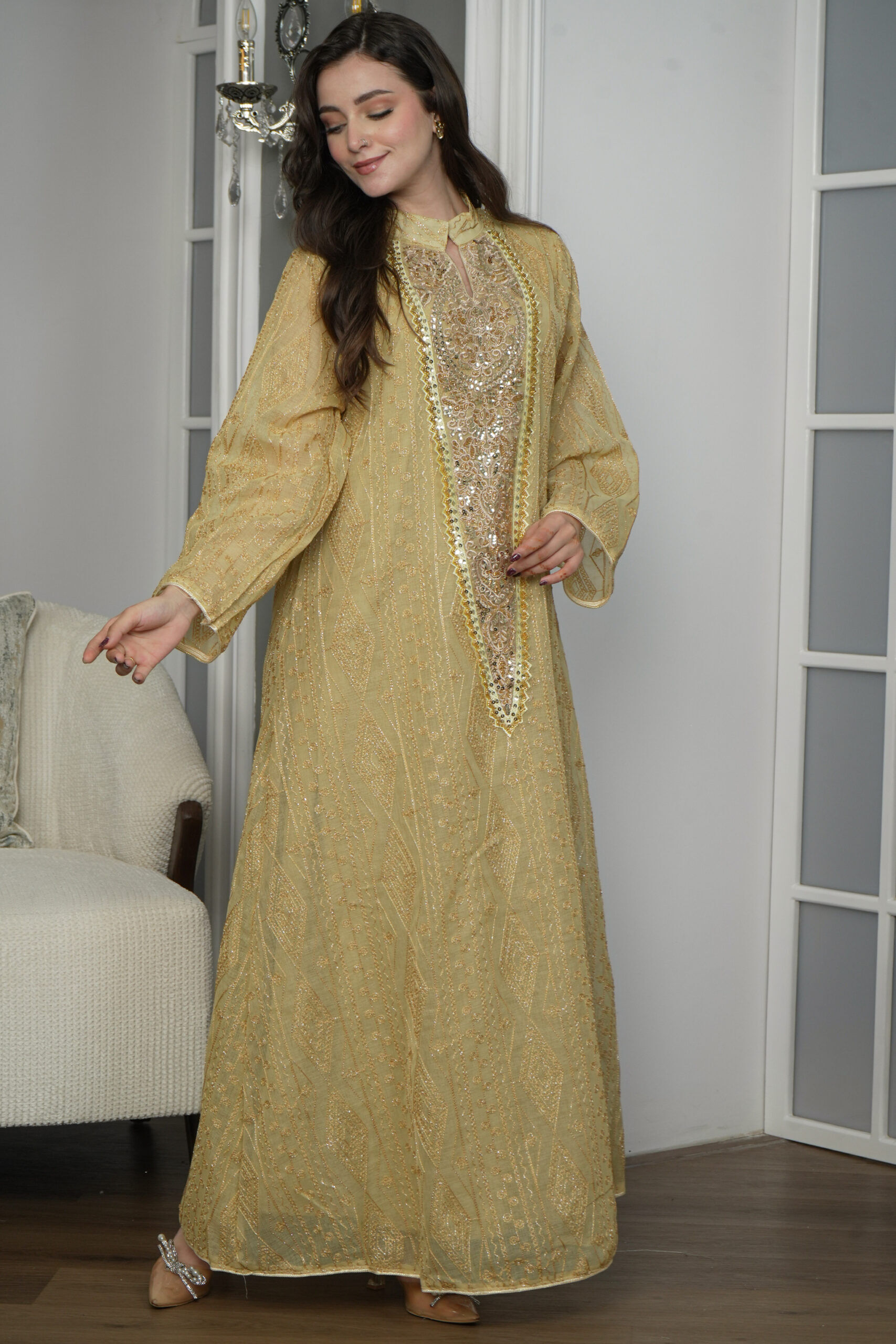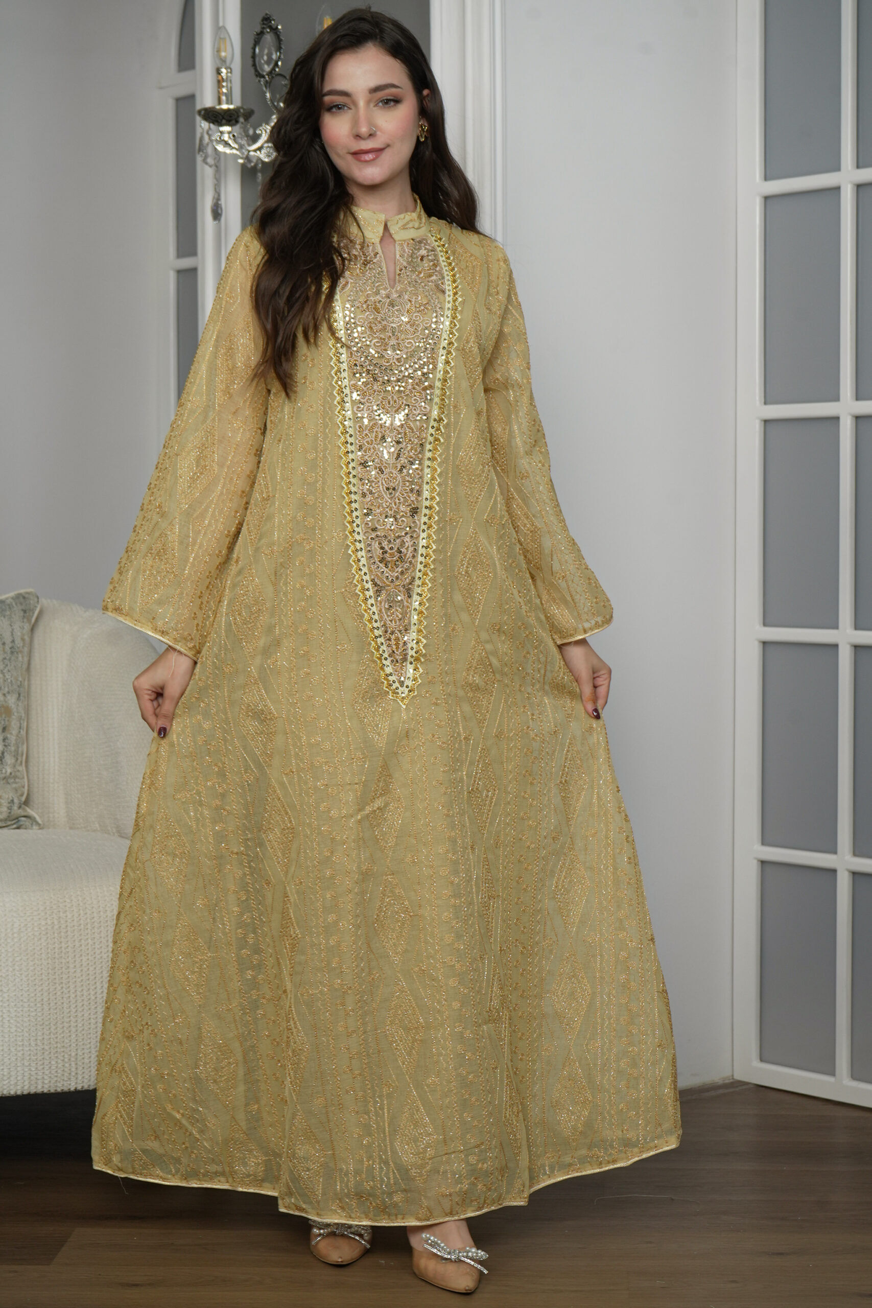 جلابية ذهبي مطرزة بذهبي فخمة تميز وجودك بين الحضور، خليها بخزانتك للمناسبات والجمعات العائلية.