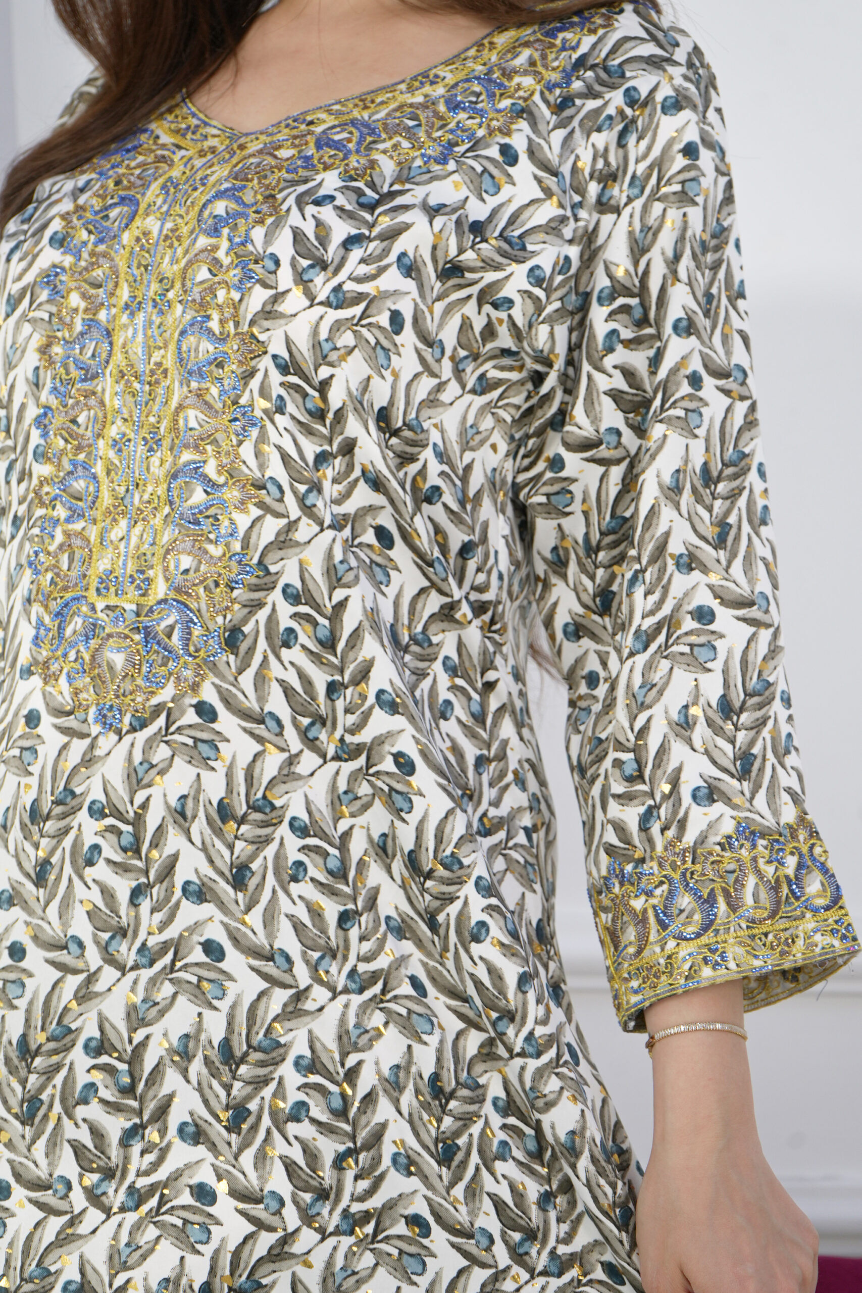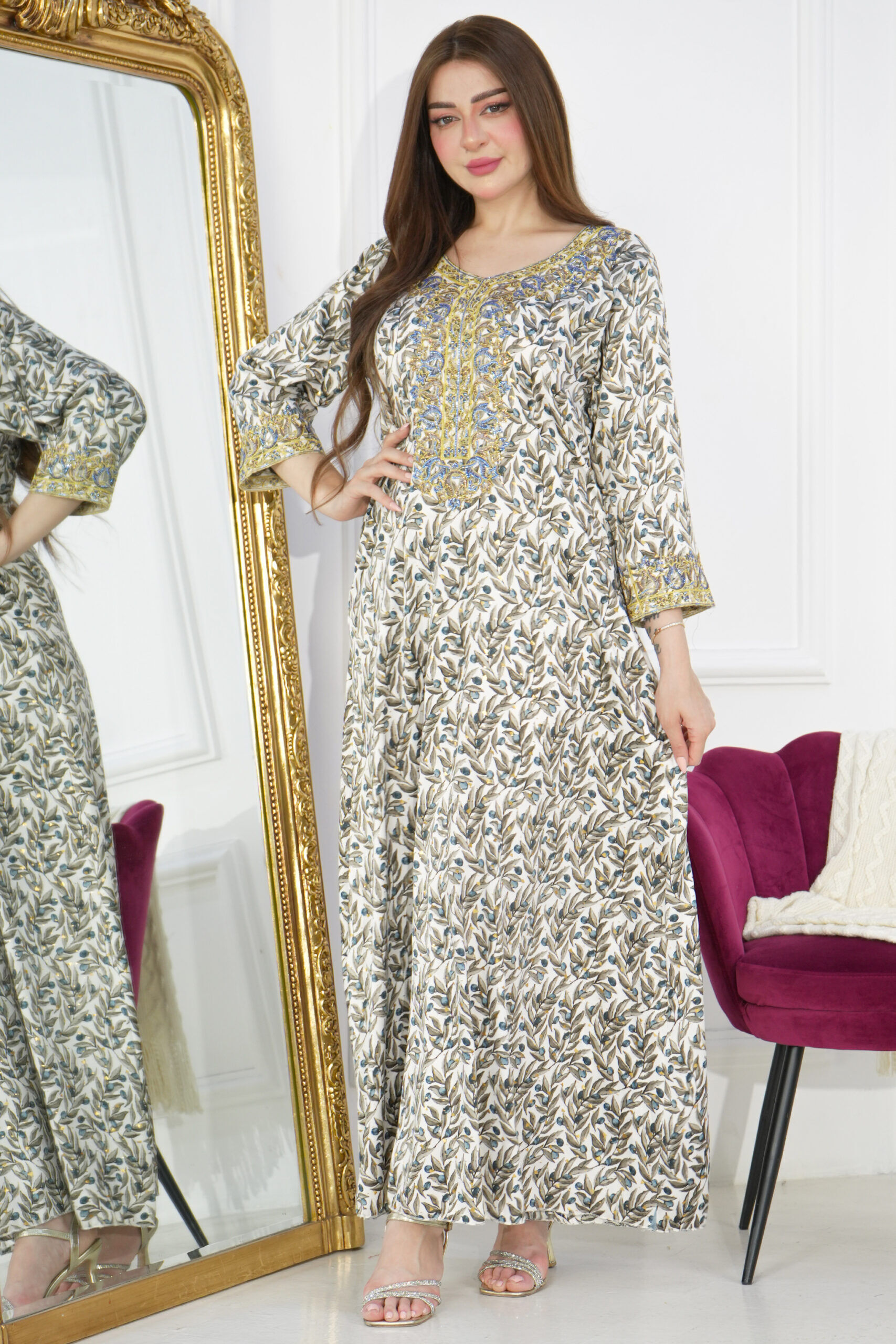 جلابيه اخضر بطبقه داخليه و تطريز من الصدر ممتده على اكتاف