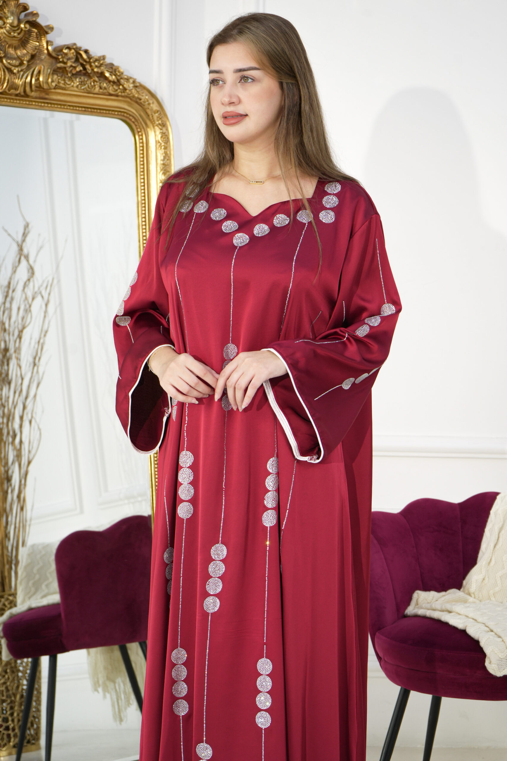 جلابية بلون عنابي مطرزه بفصوص كشخة أنيقة ومميزة لكافة أوقاتك ومناسباتك، لا غنى عنها بخزانتك لأنها:
