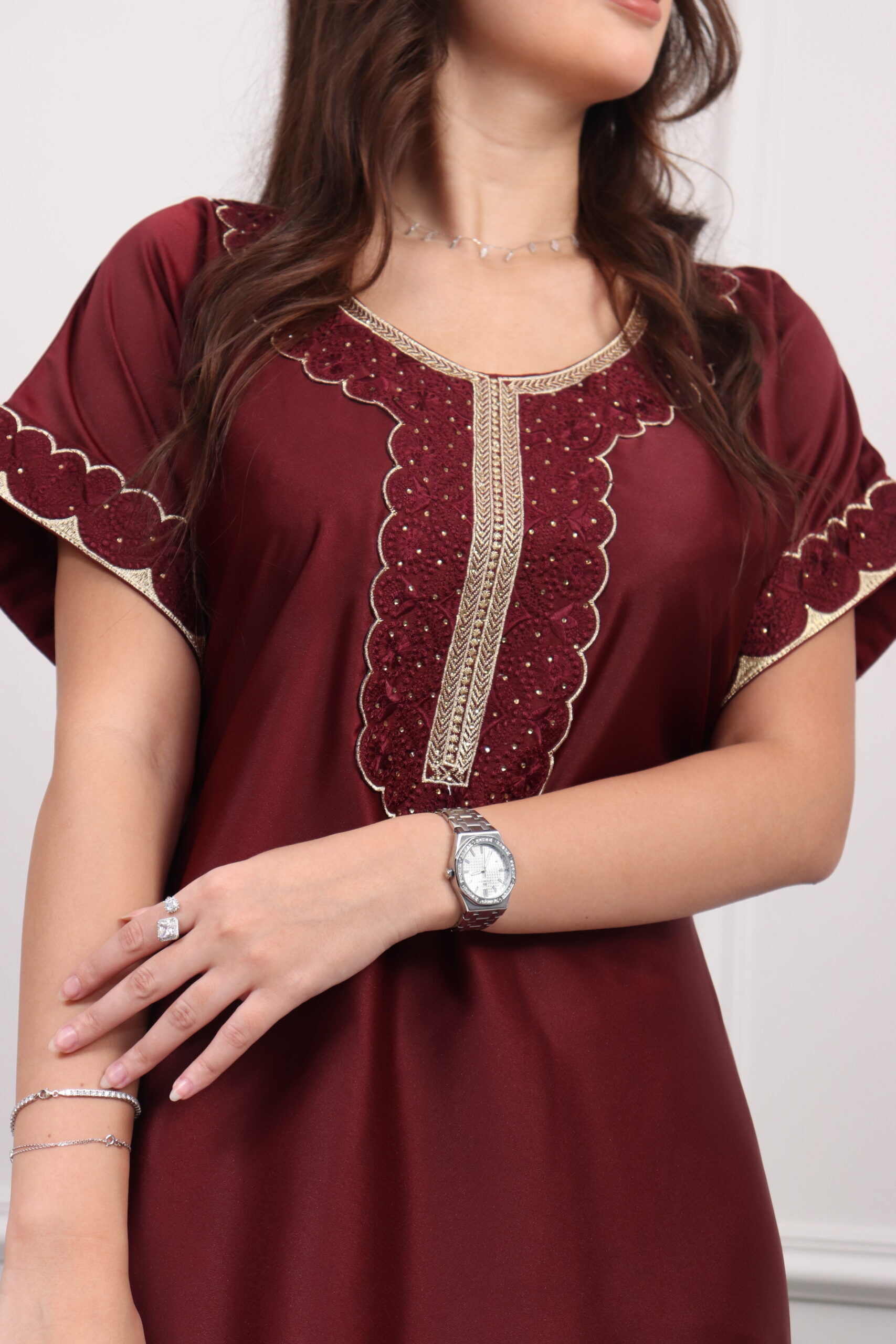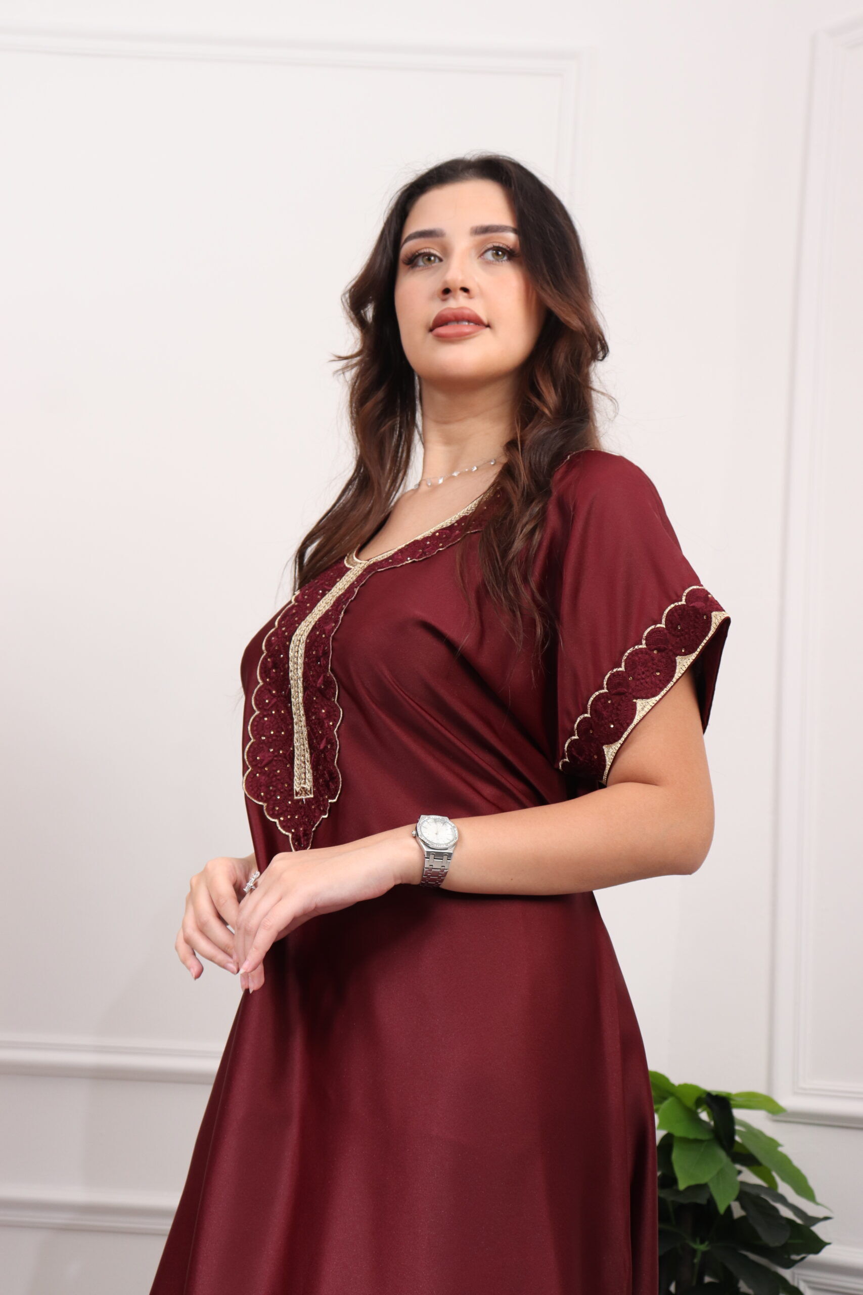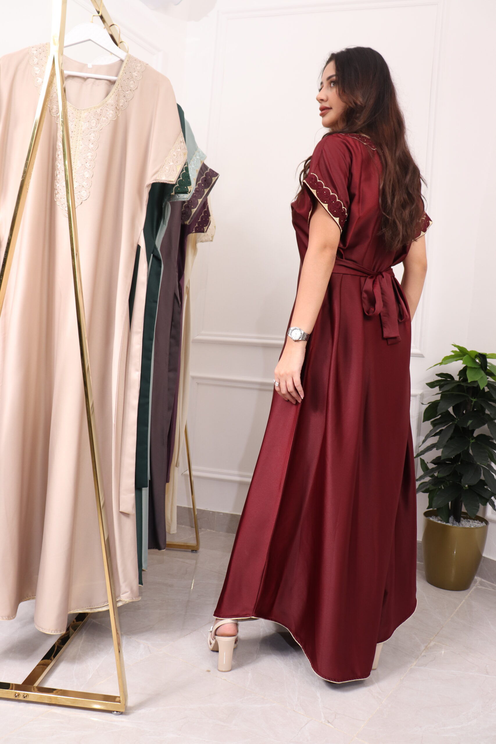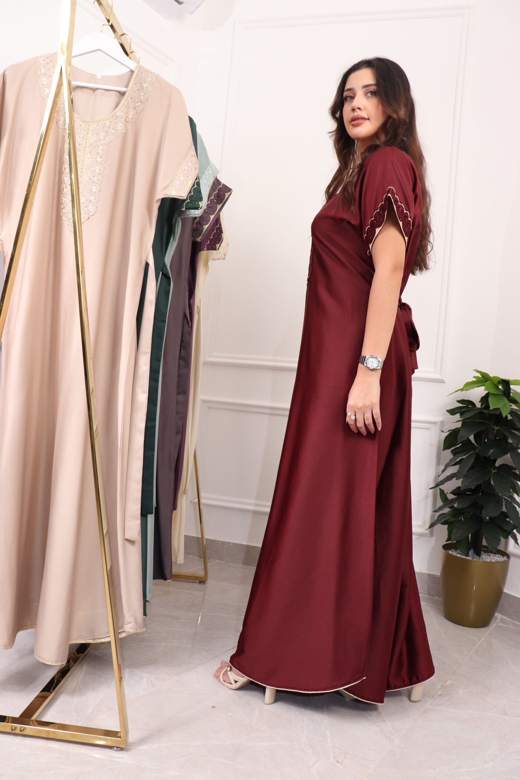جلابية عنابي بتطريز ذهبي بتصميم أنثوي ناعم ولافت، لا تتردين في اختيارها للمناسبات والجمعات العائلية.