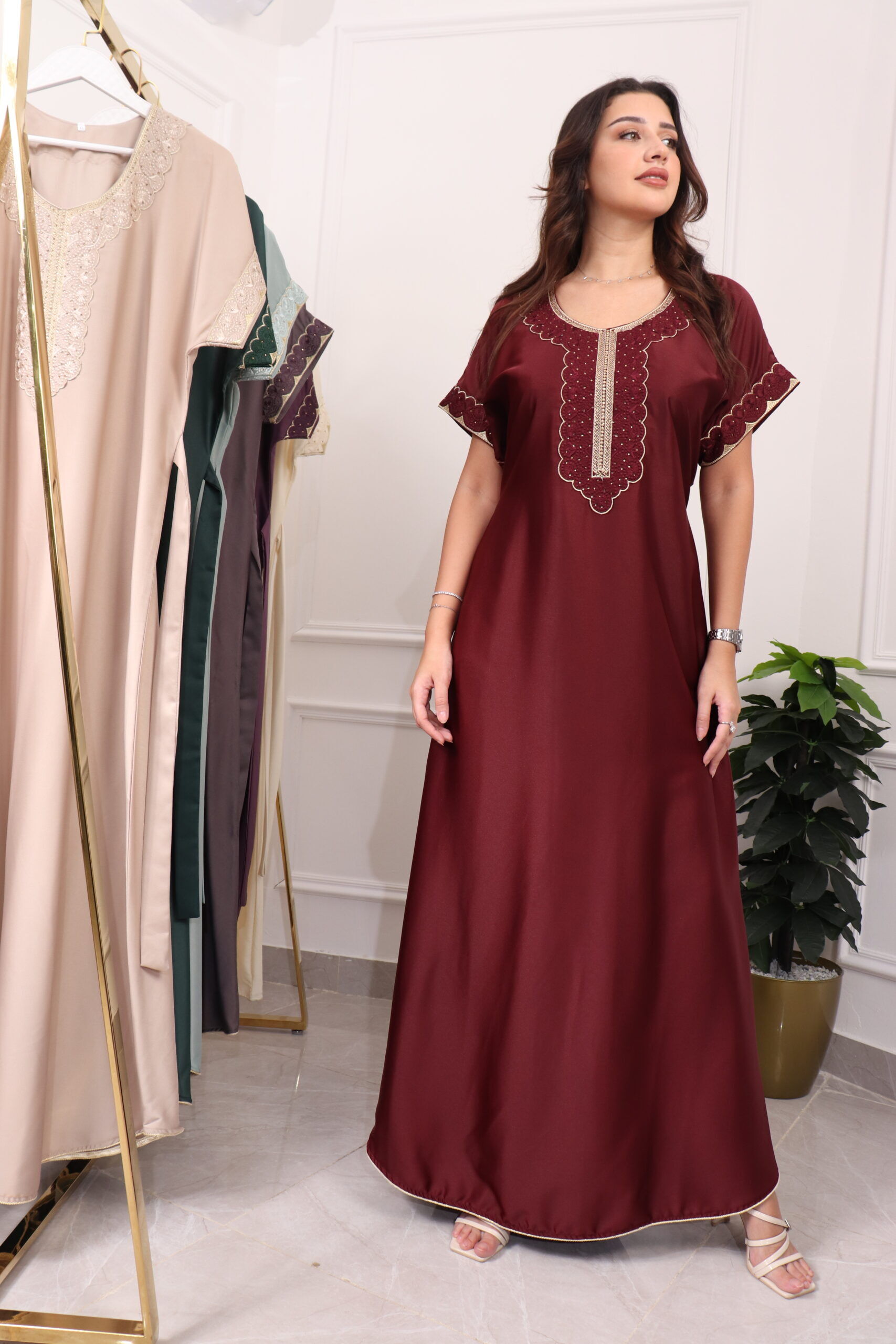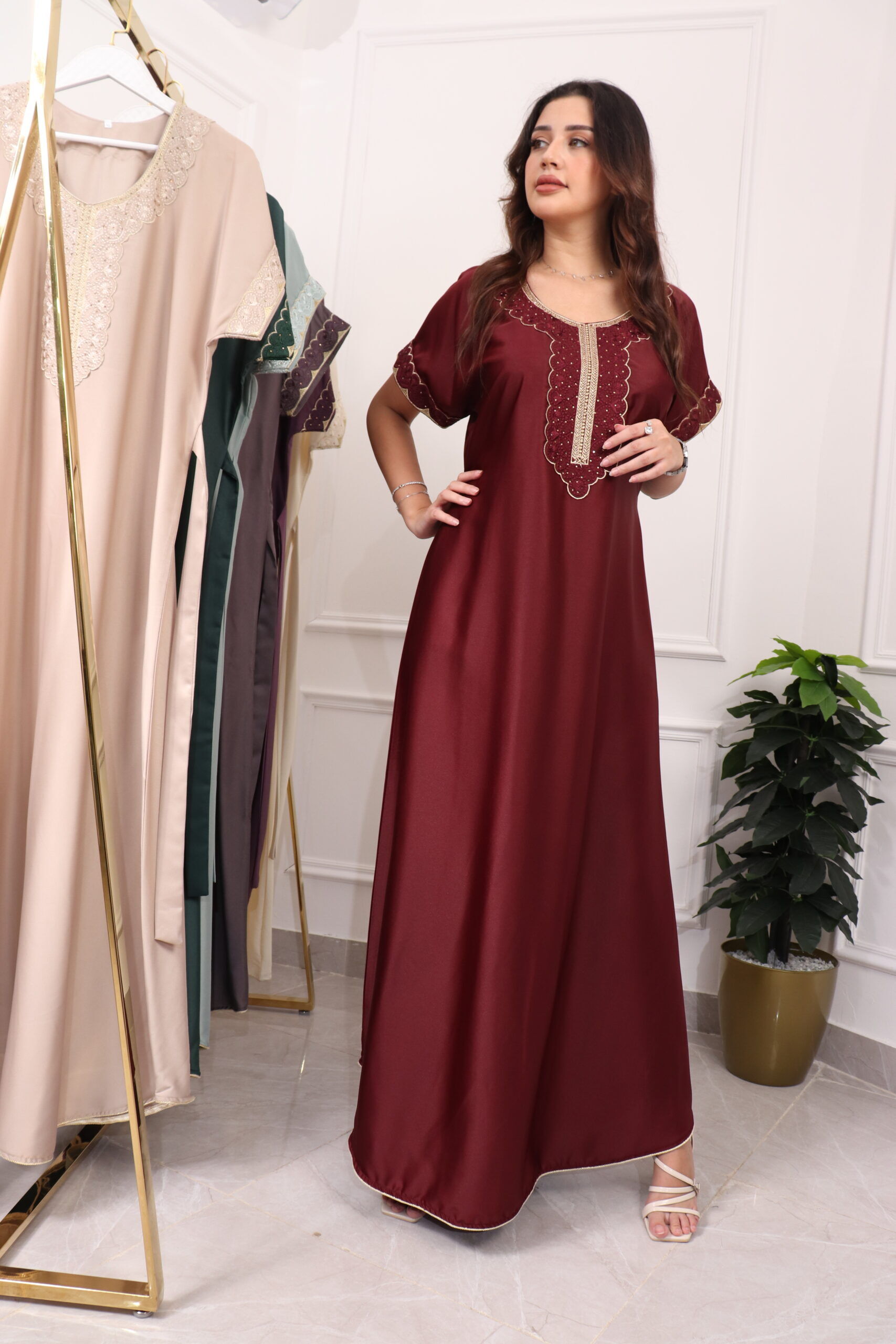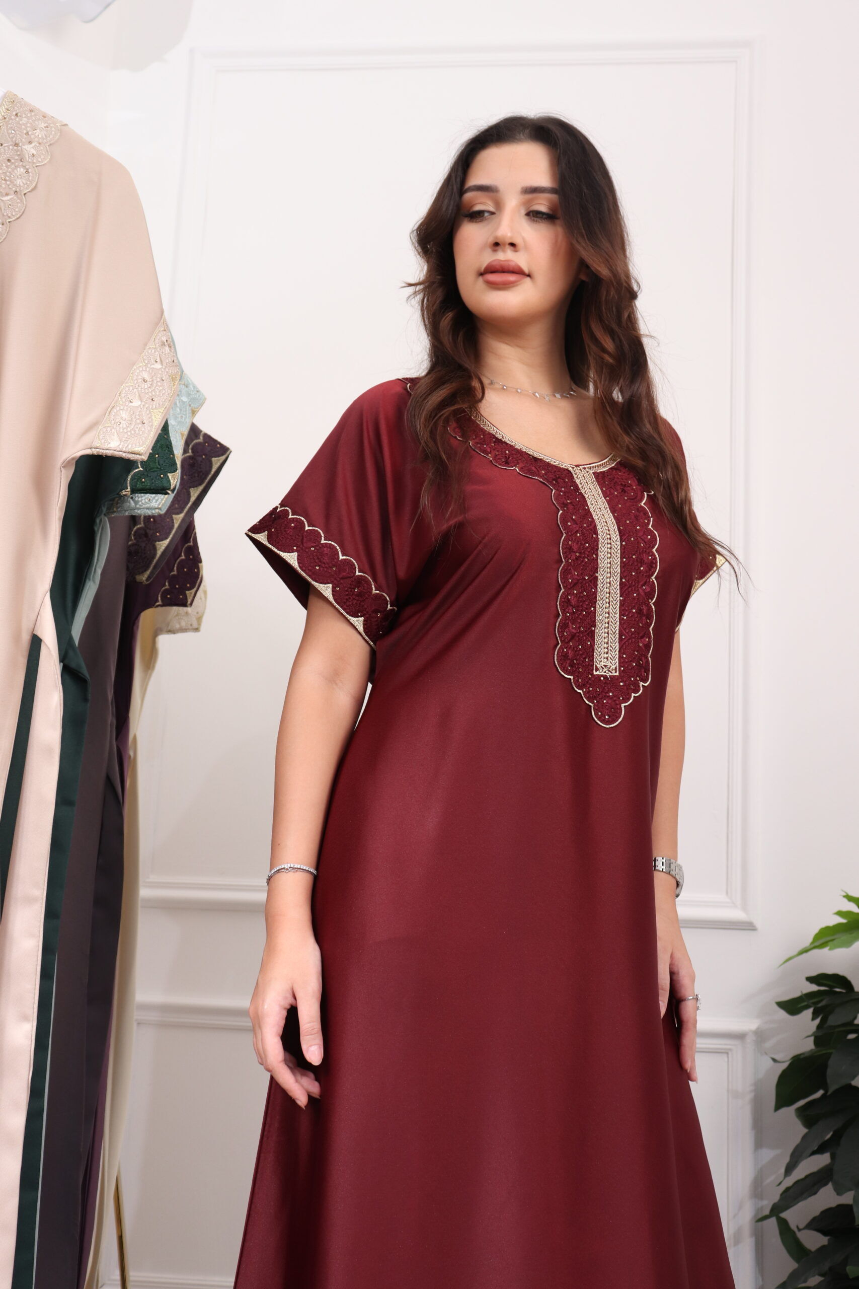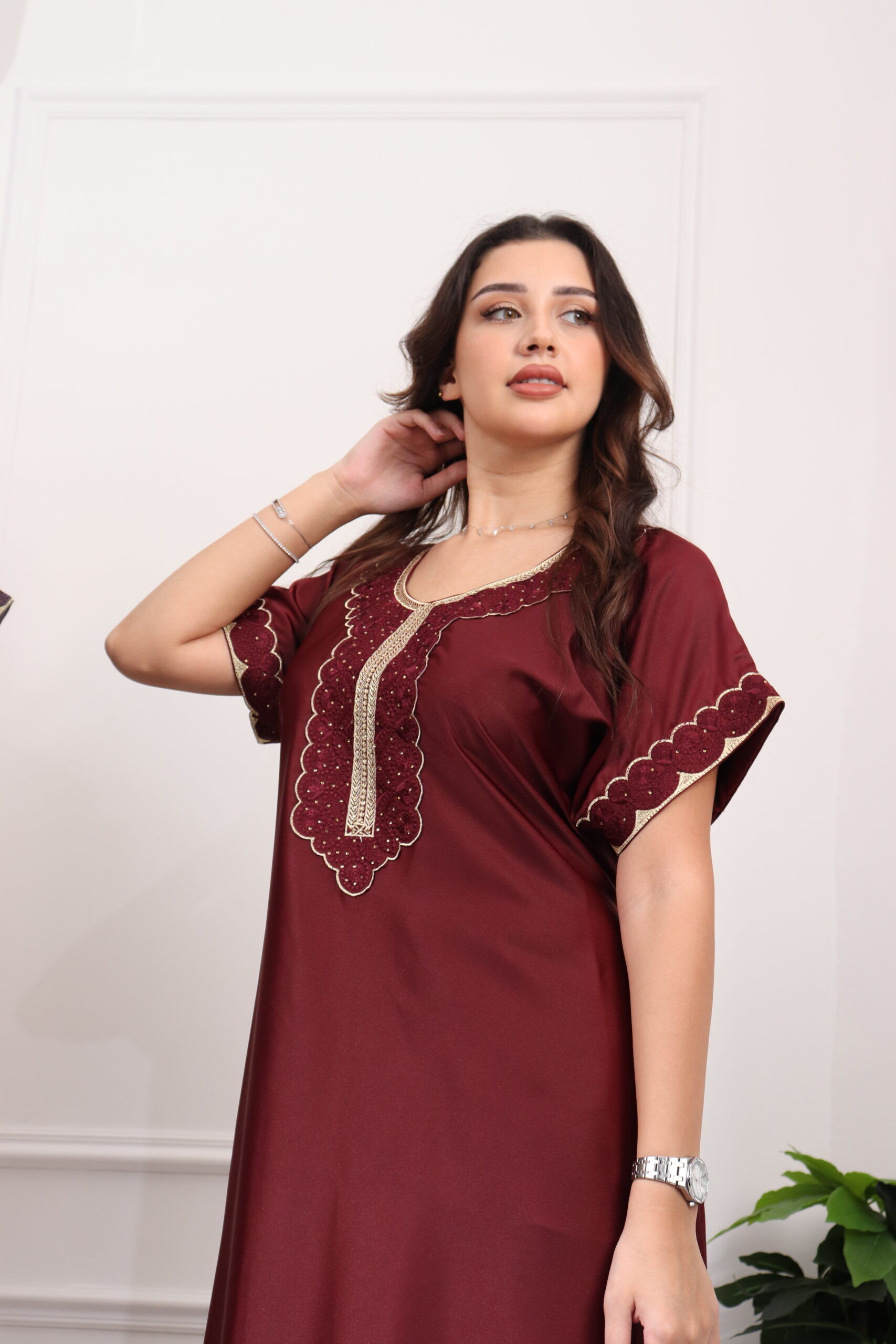 جلابية عنابي بتطريز ذهبي بتصميم أنثوي ناعم ولافت، لا تتردين في اختيارها للمناسبات والجمعات العائلية.
