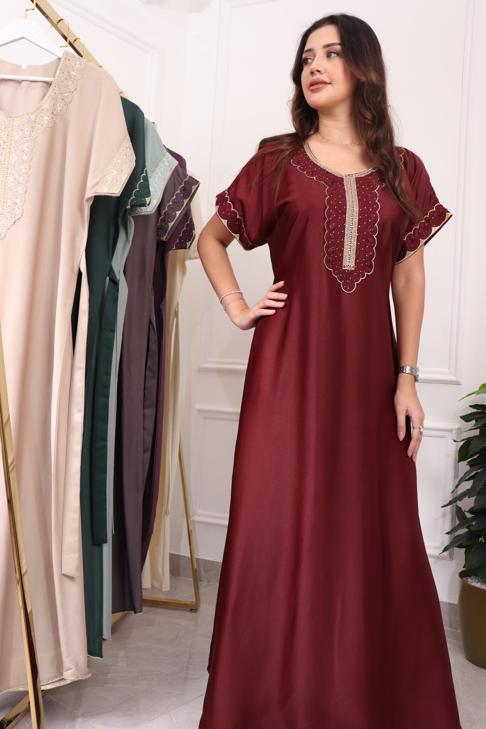 جلابيه عنابي مطرزه تطريز كبيوتر من امام مع فصوص