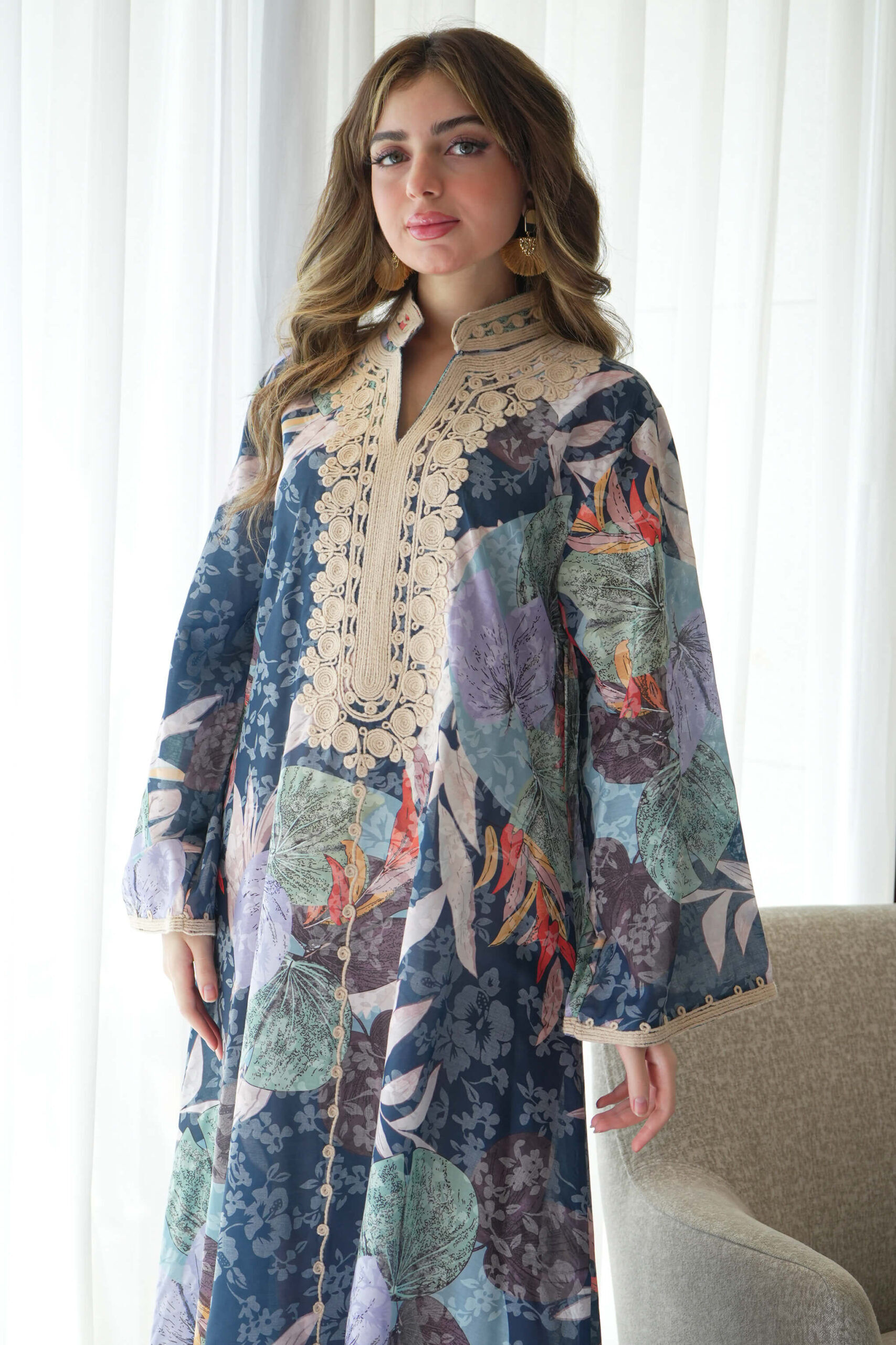 جلابيه لياقة كحلي مزينه بشريط بيج من حلق و اكمام