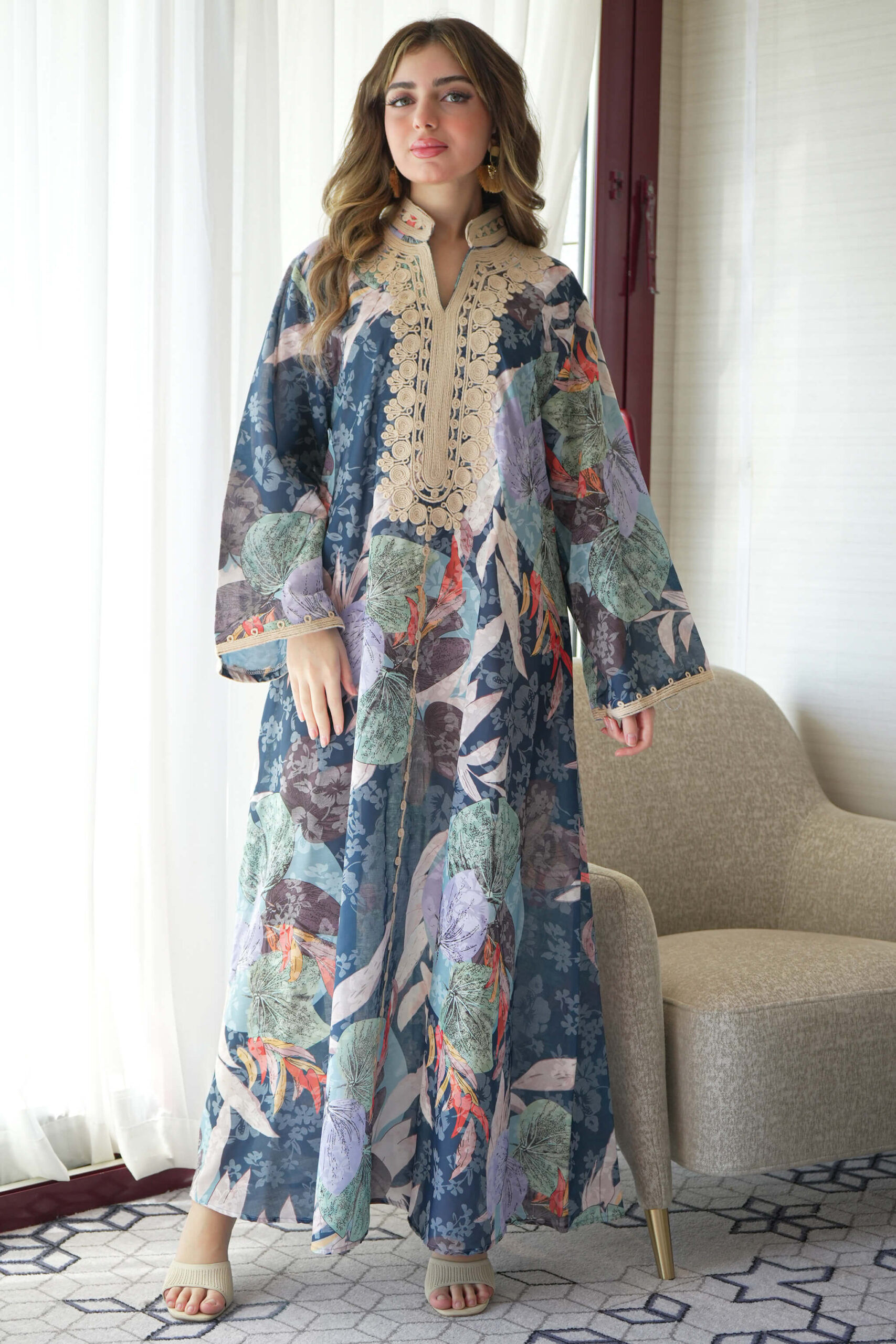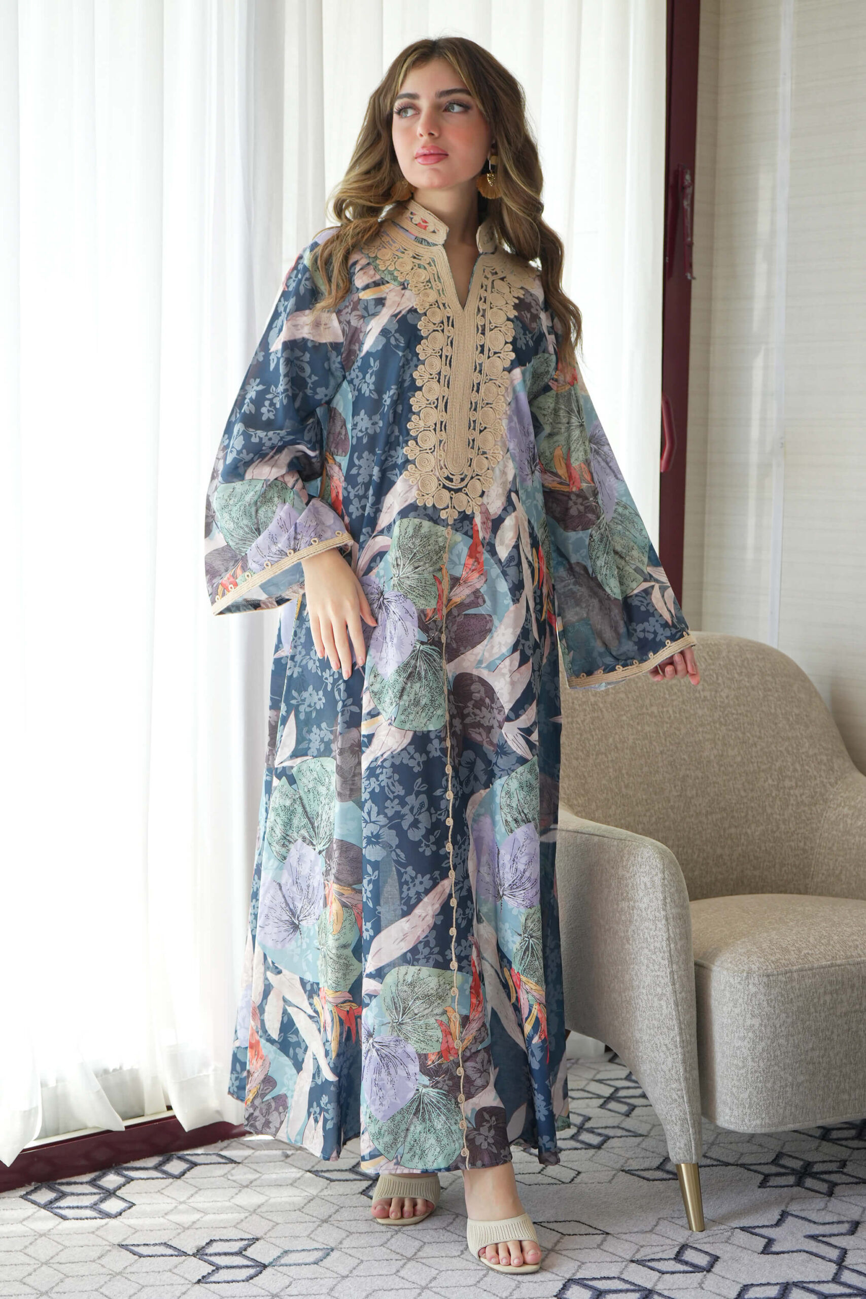 جلابية جاكار مشجره تيفاني بطبقة داخلية و شريط فصوص
