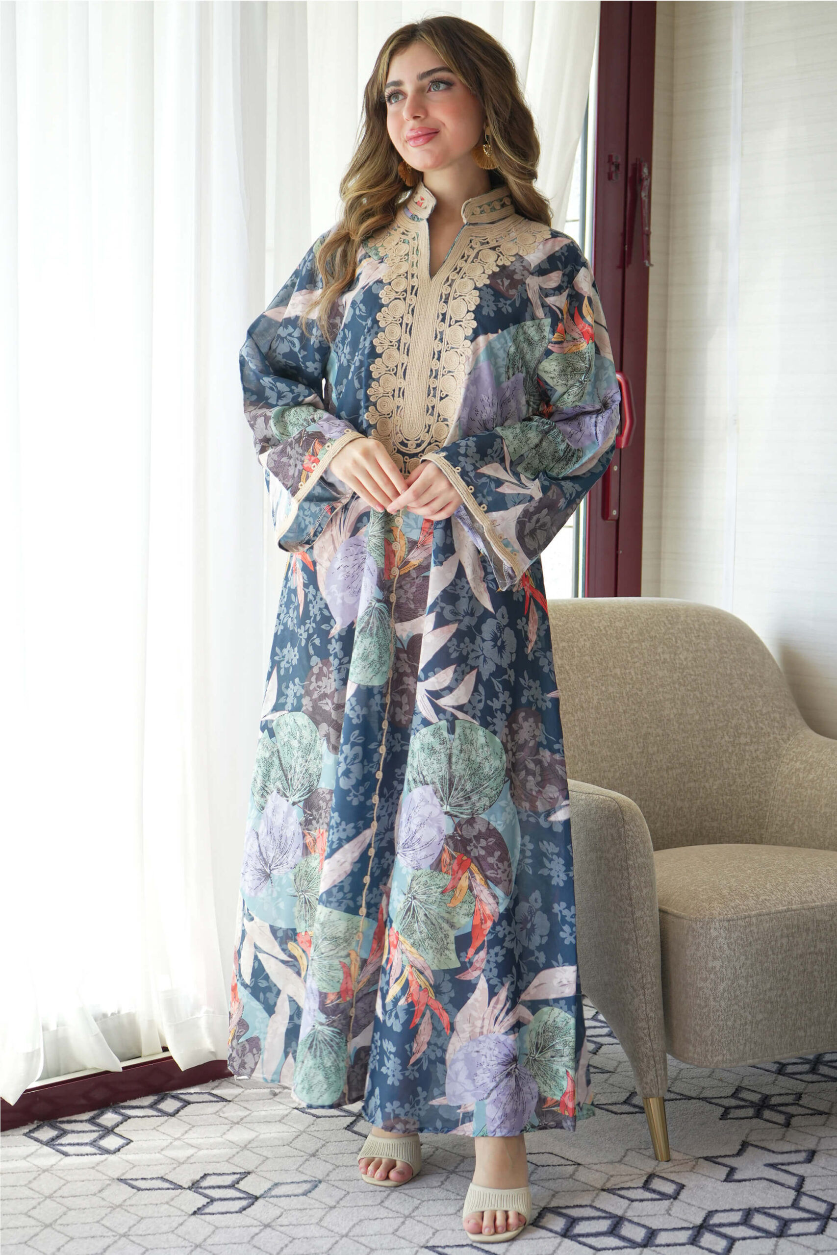 جلابية بلون كحلي ساترة و محتشمة بتطريز على الصدر بدقات بيج وعلى الاكمام عندك مناسبة مهمة !؟ لا تتردين في إختيارها :