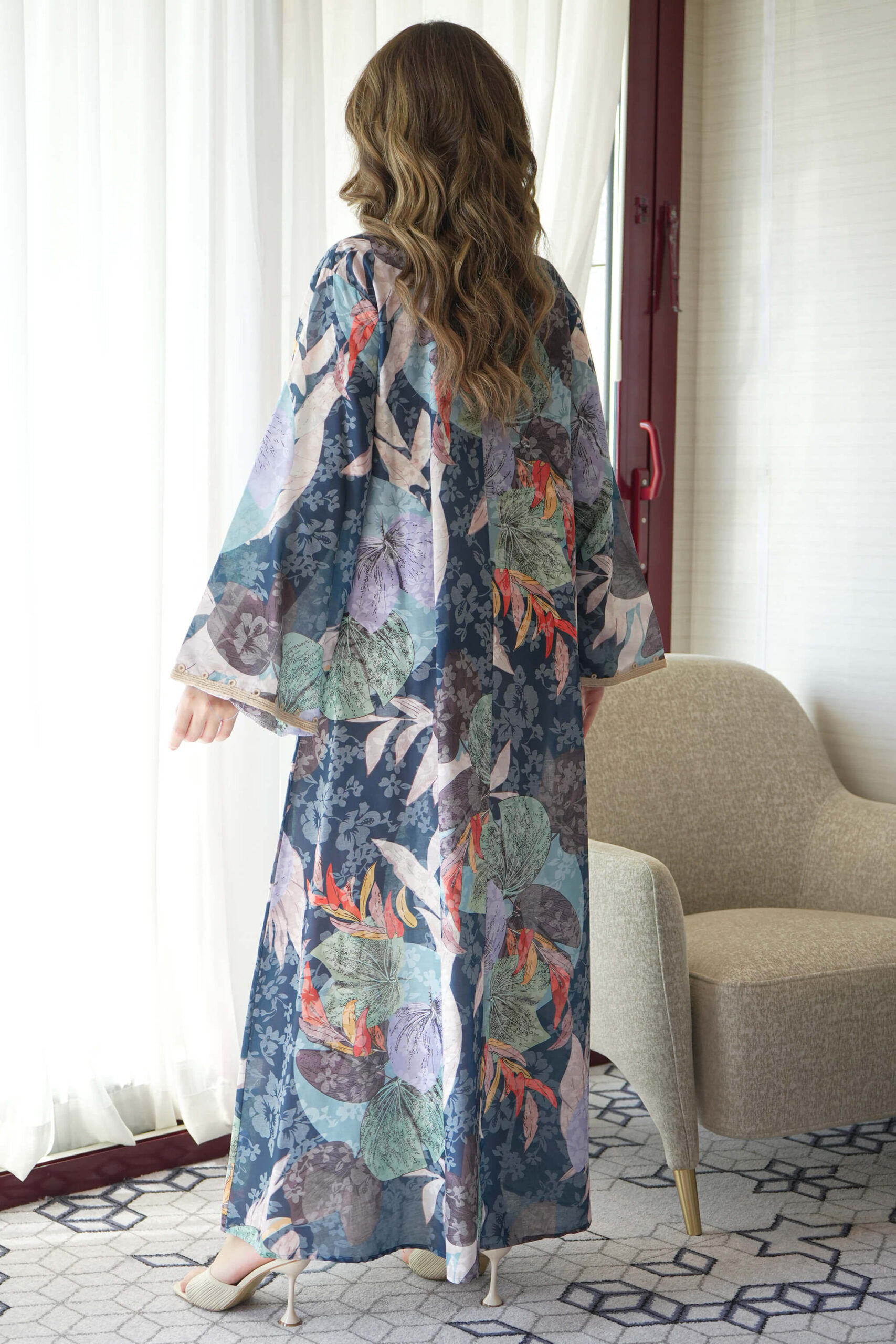 سادة من الخلف مصممة بياقة عالية و بقصة كلوش صغير و باكمام طويلة