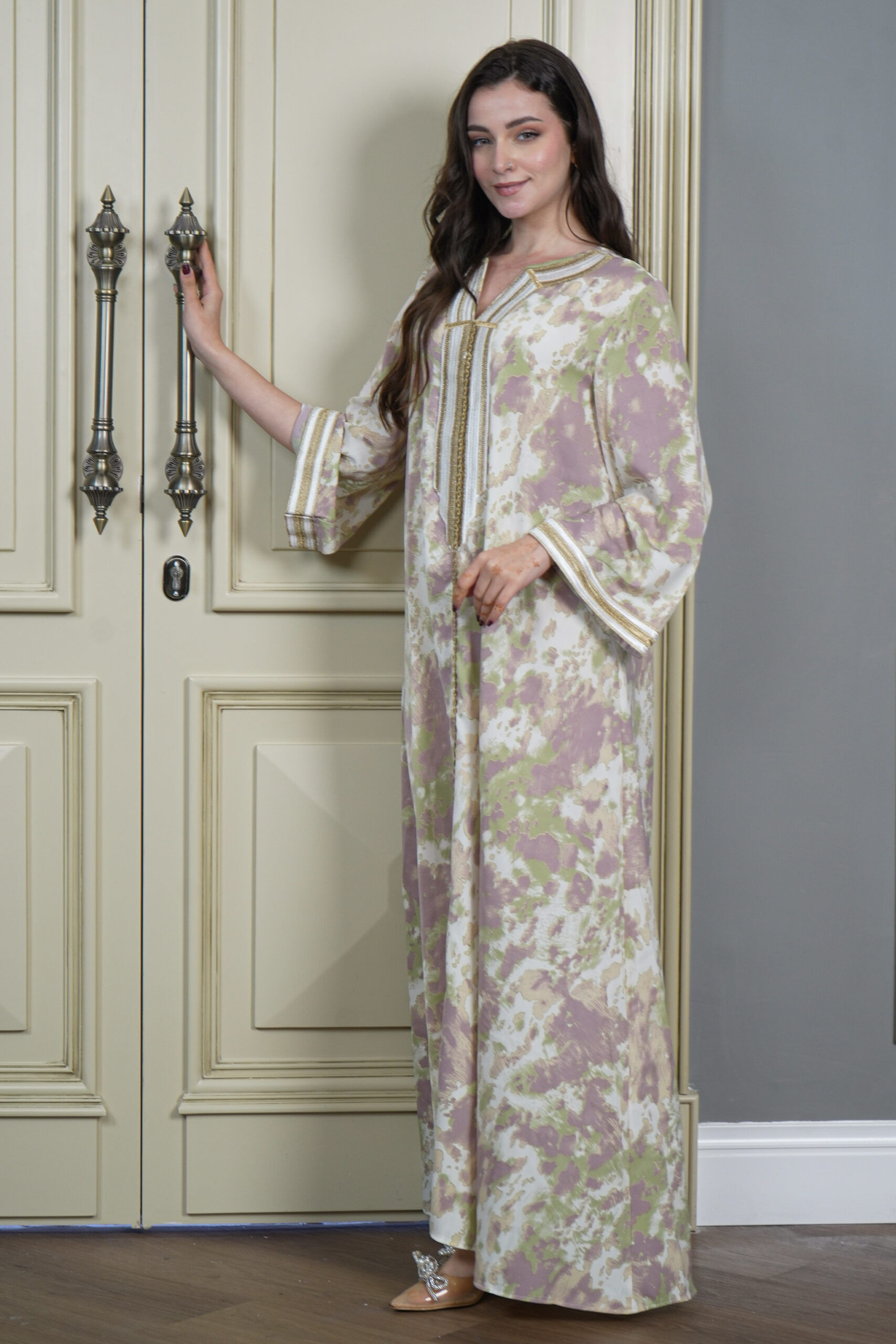 جلابيه موف حرير و شريط شك بخيوط ذهبي من امام