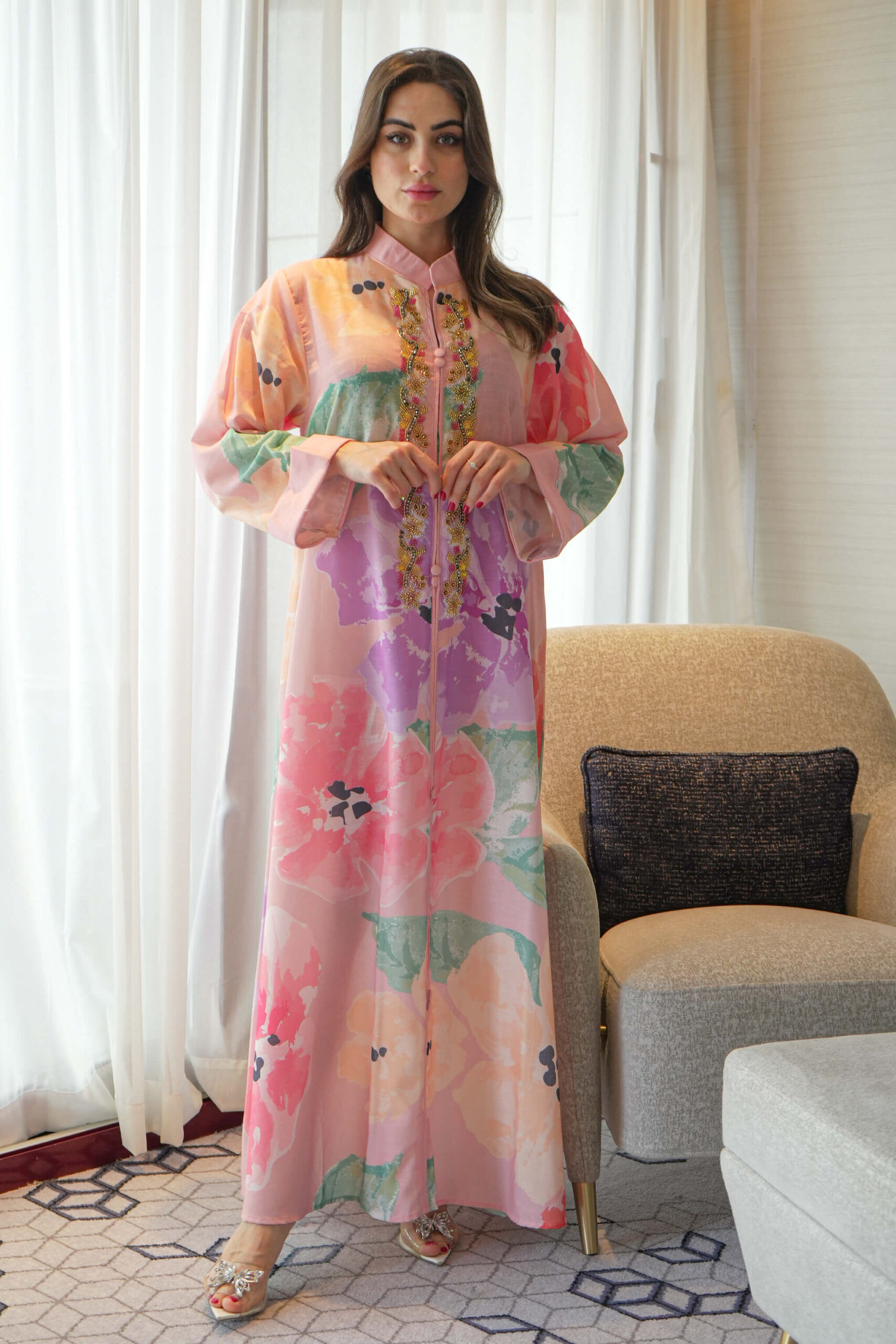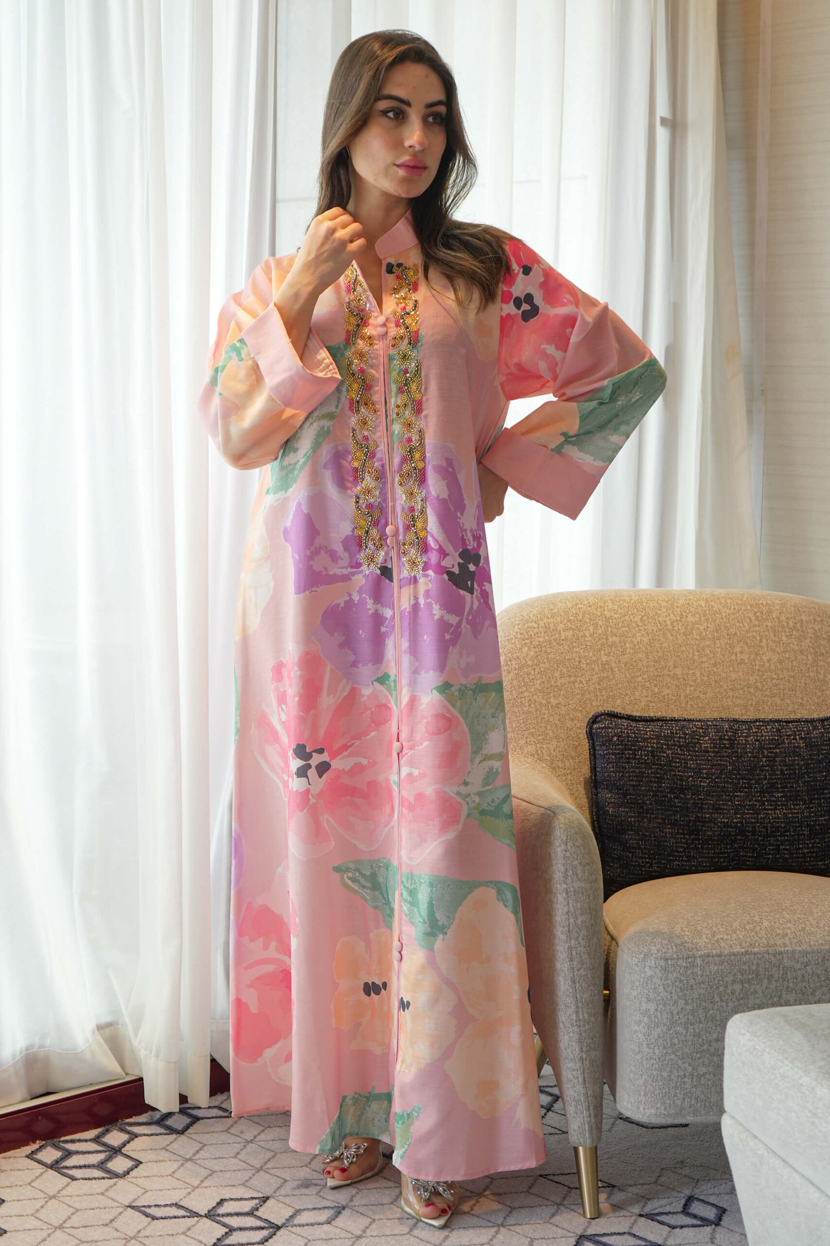 الجلابية نسجت من خامة كتان مطرز بشك ذهبي مع خام مرسومه بلكامل بورود كامل جلابية ، صممت بلياقه و تطريز شك بلون ذهبي و لتمنحك إطلالة تستحقينها.