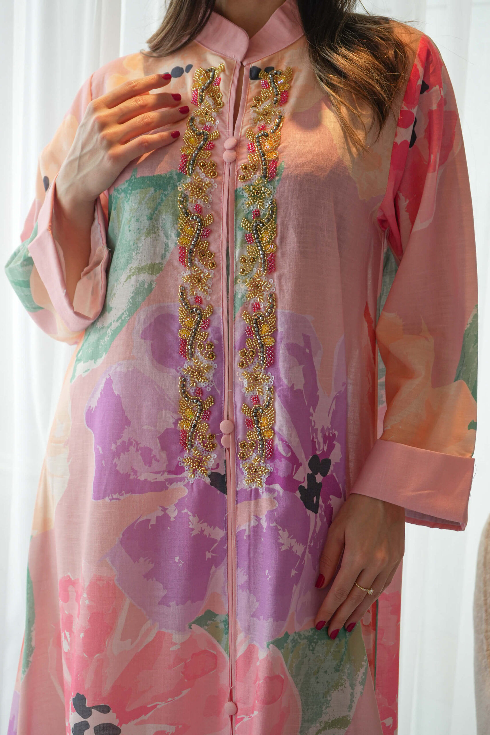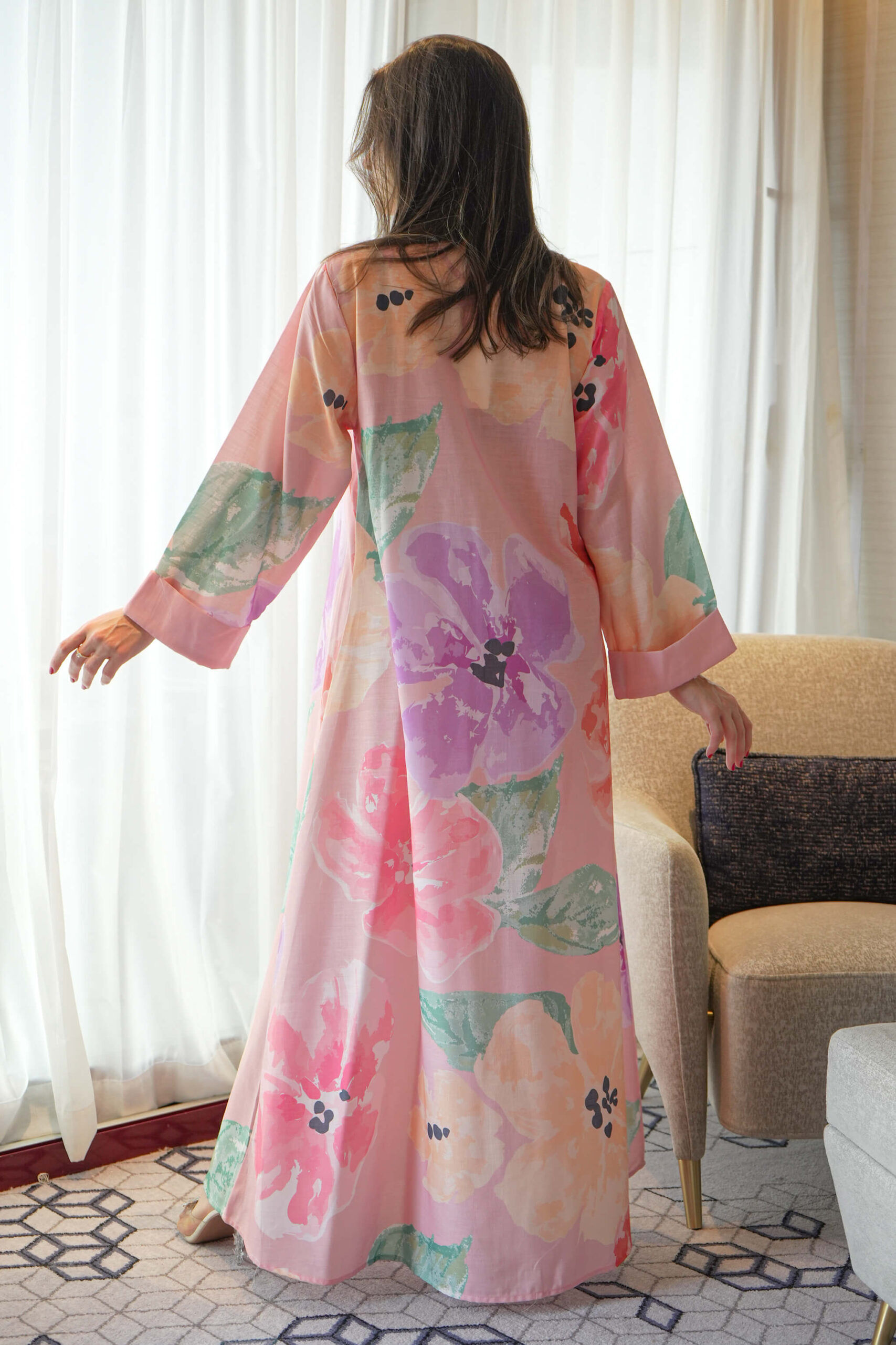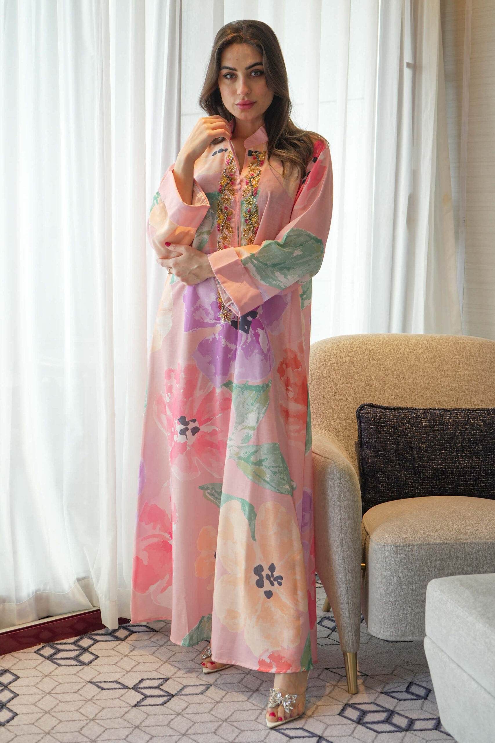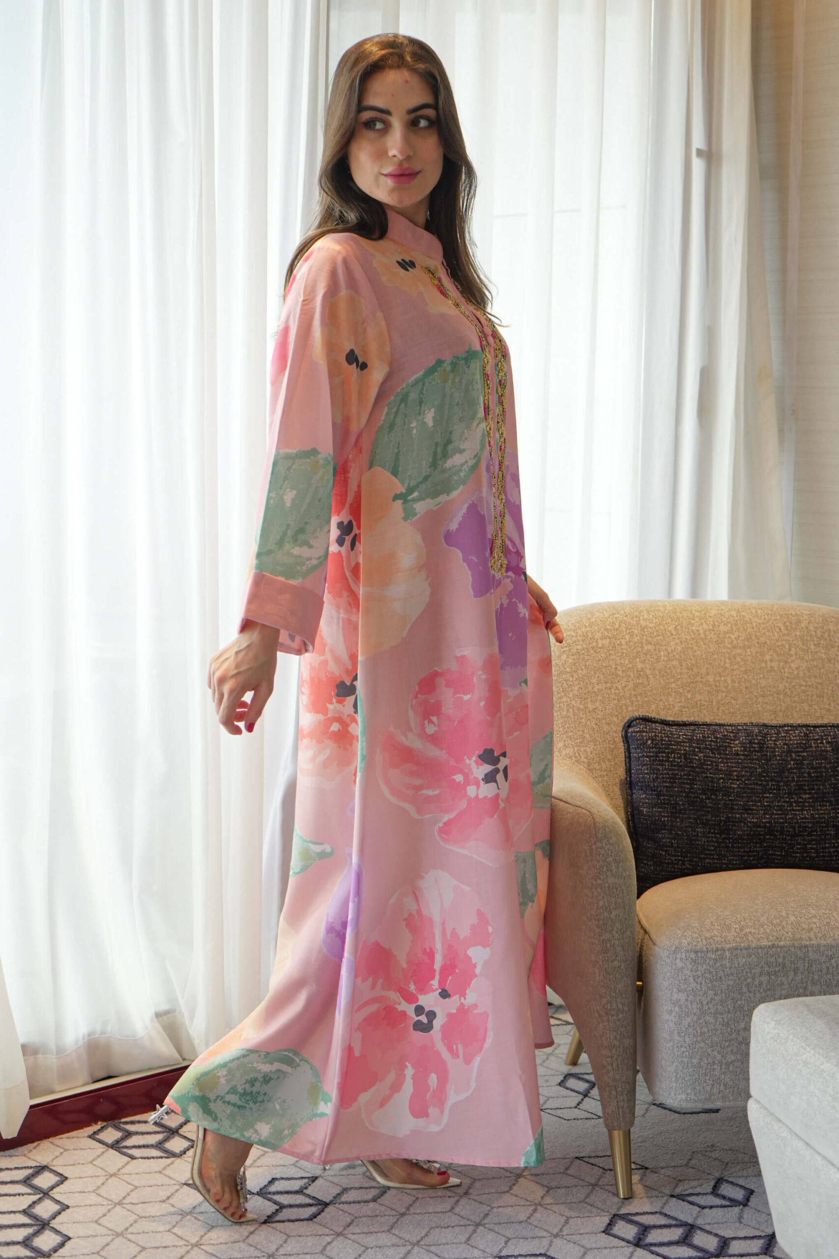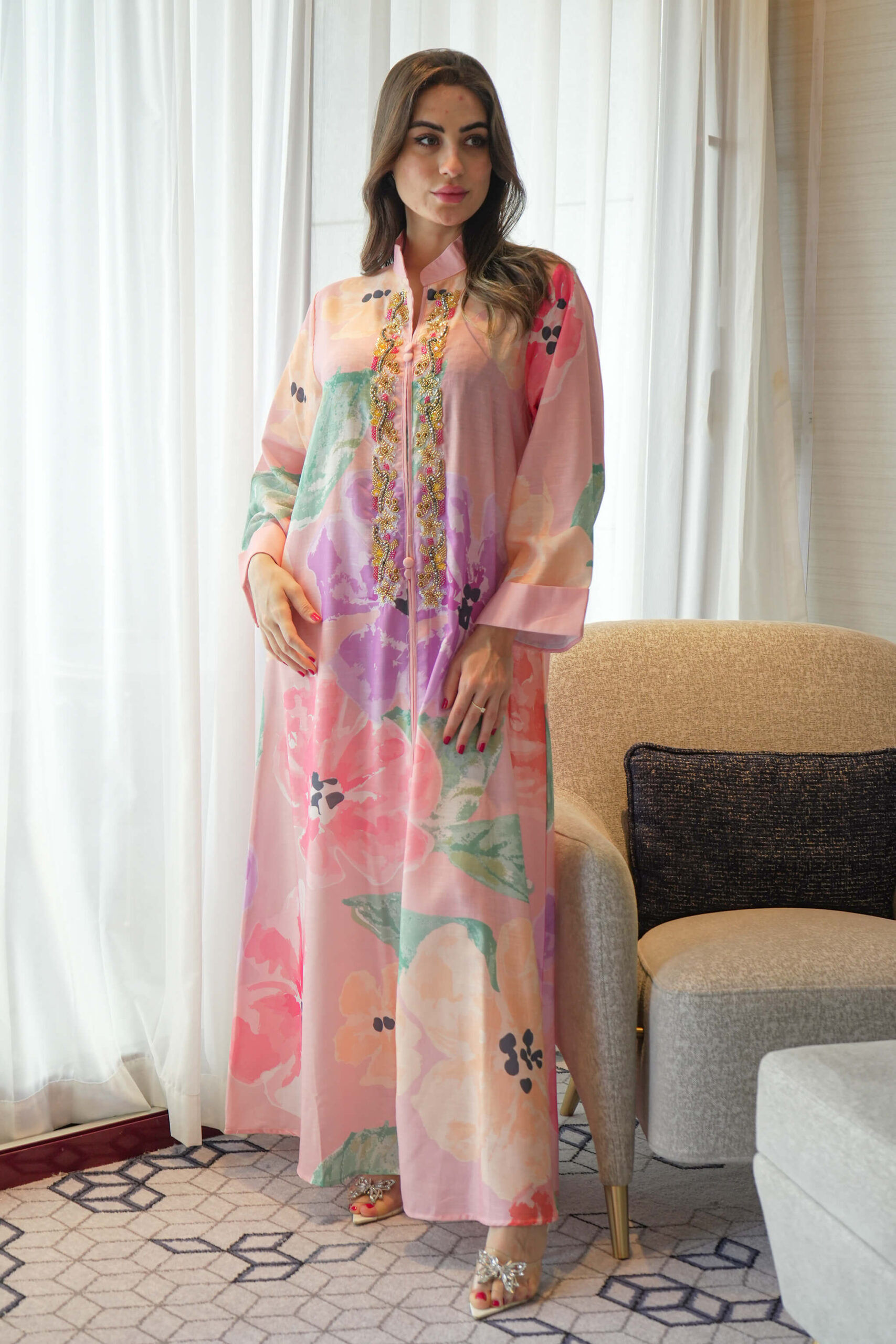 جلابيه وردي خليجيه بلياقه و شك ذهبي من امام