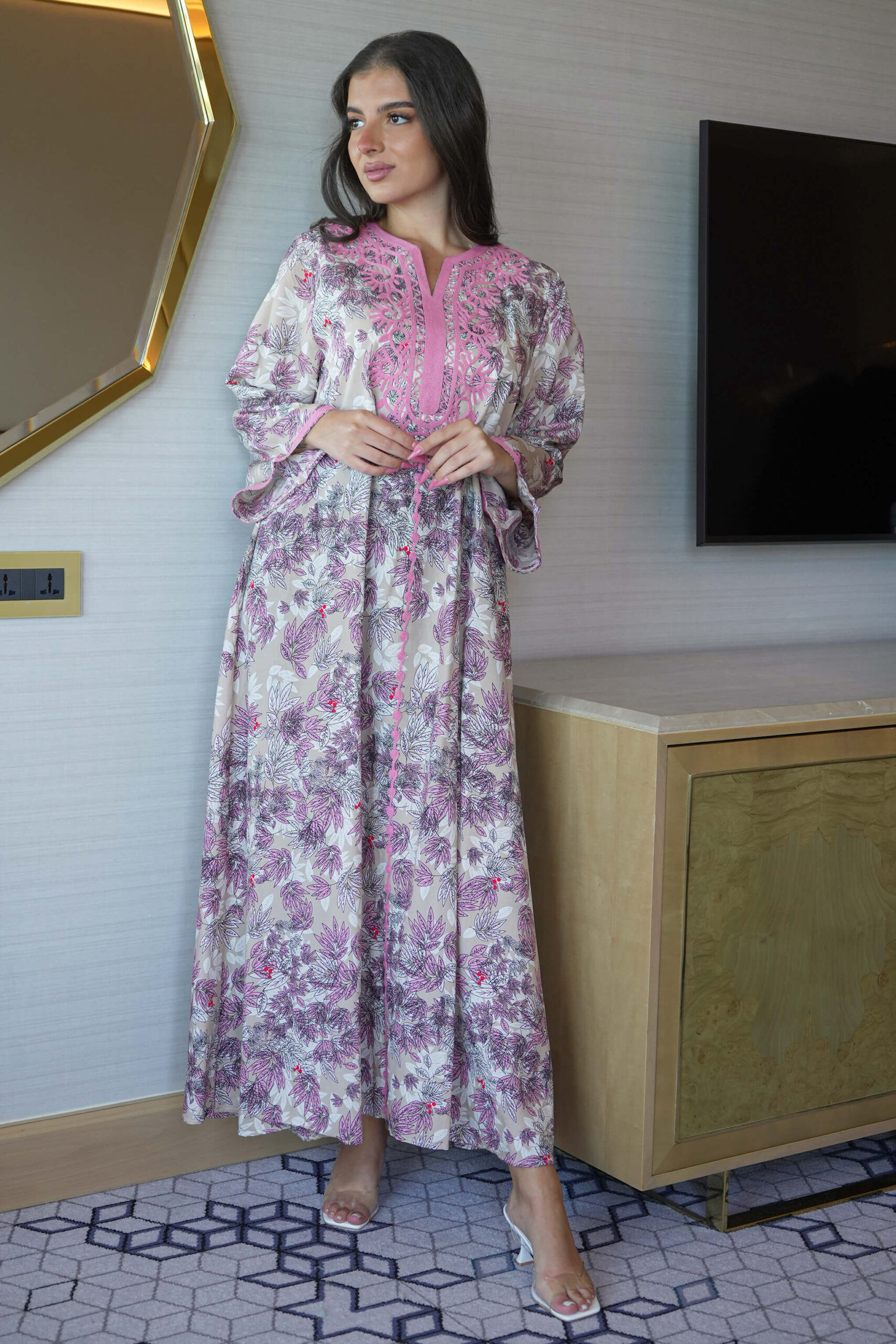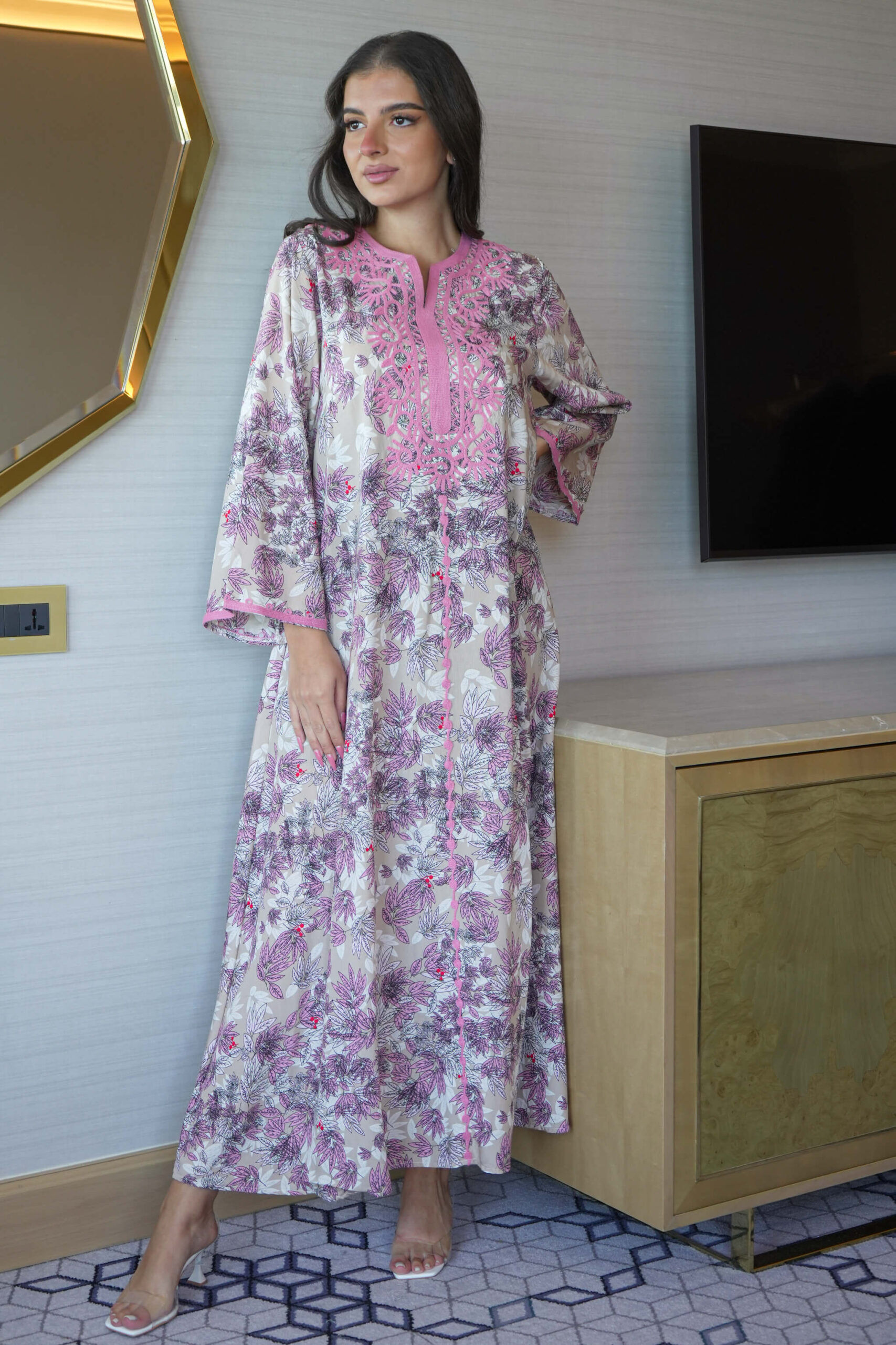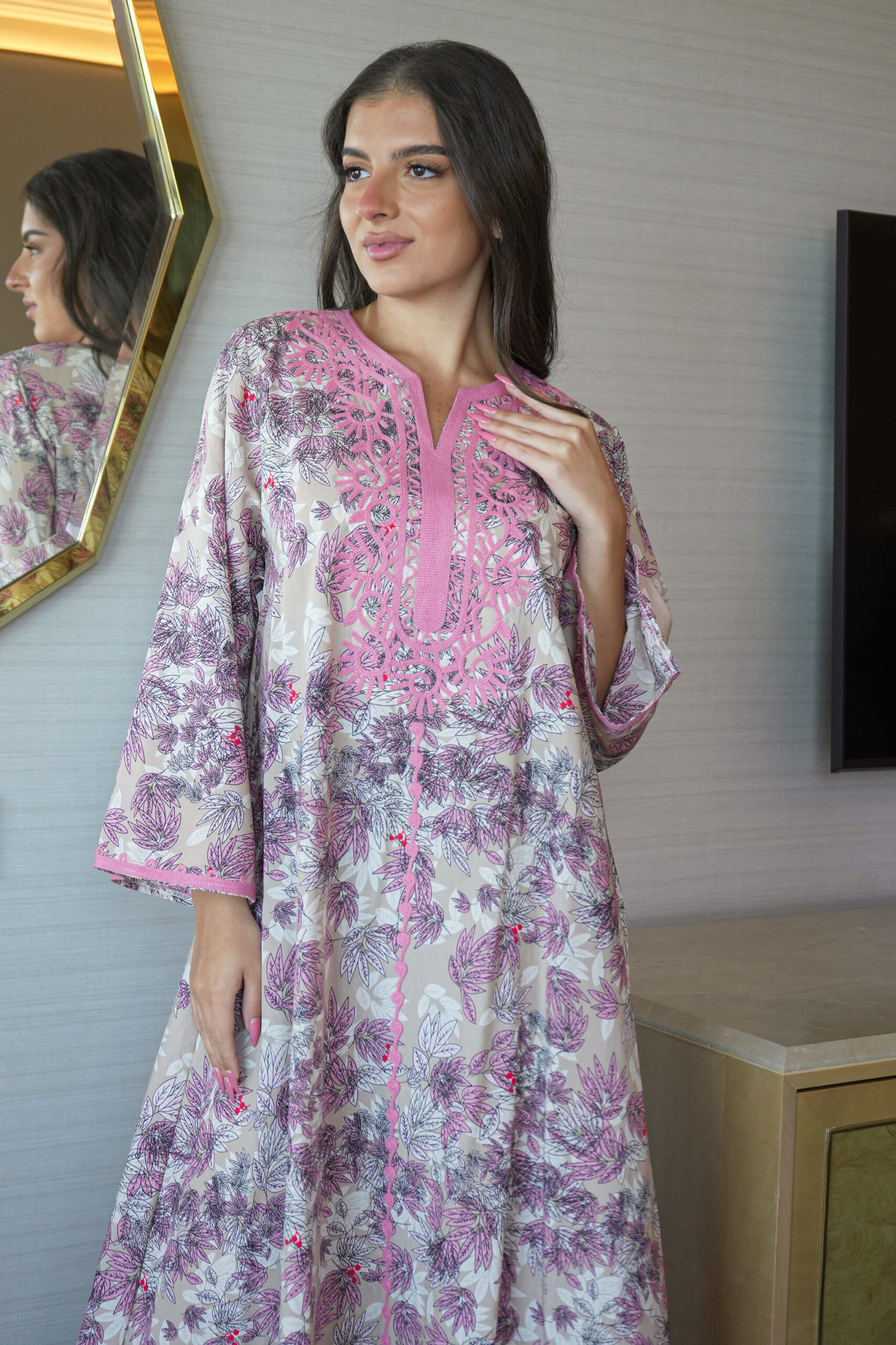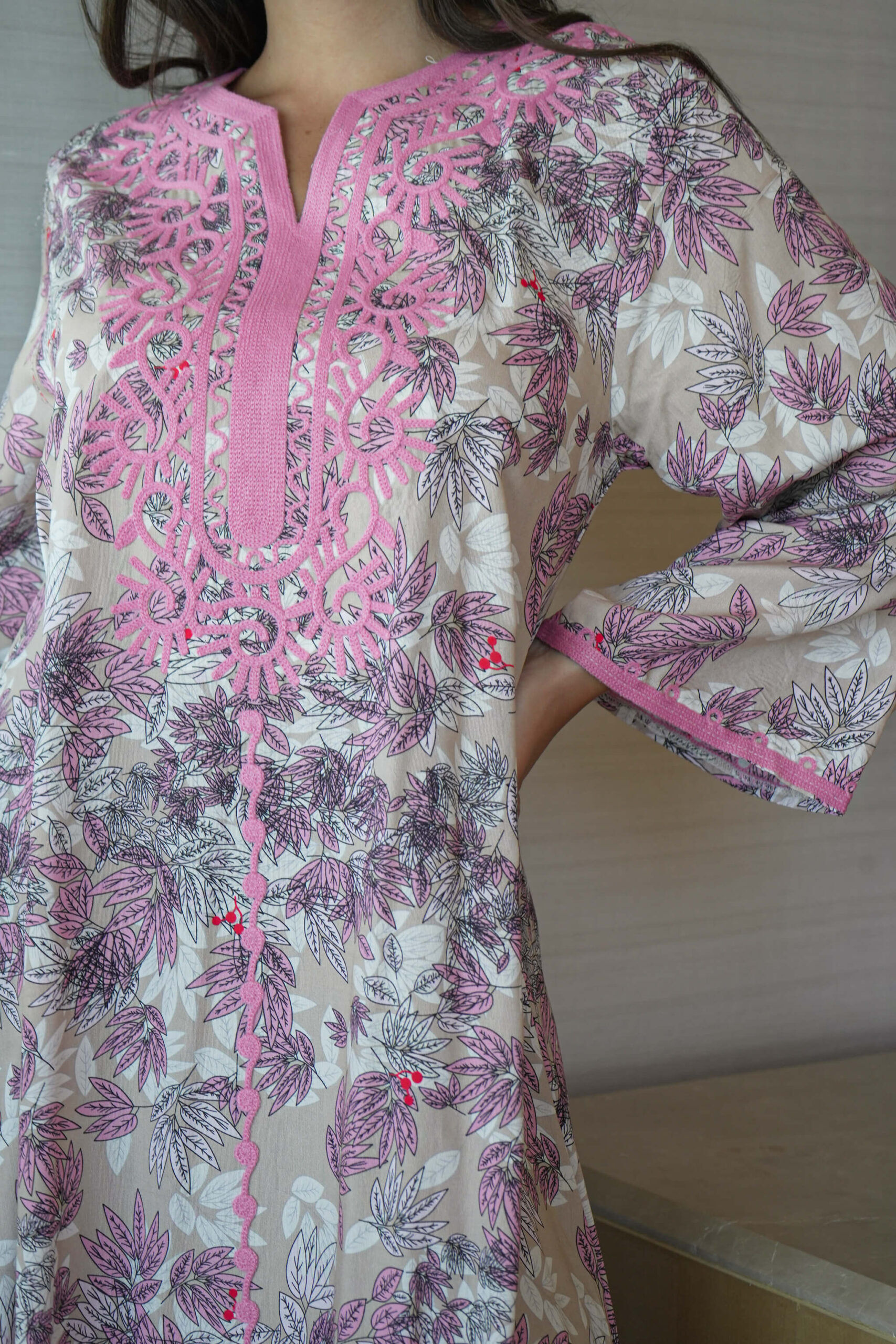 جلابية بلون وردي ساترة و محتشمة بتطريز على الصدر بدقات وعلى الاكمام عندك مناسبة مهمة !؟ لا تتردين في إختيارها :