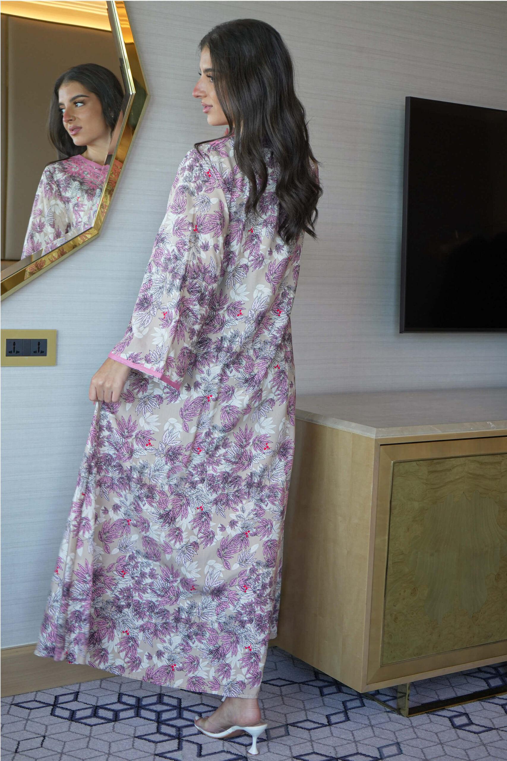 جلابية مشجرة باكمام كلوش لون وردي مع شريط شك