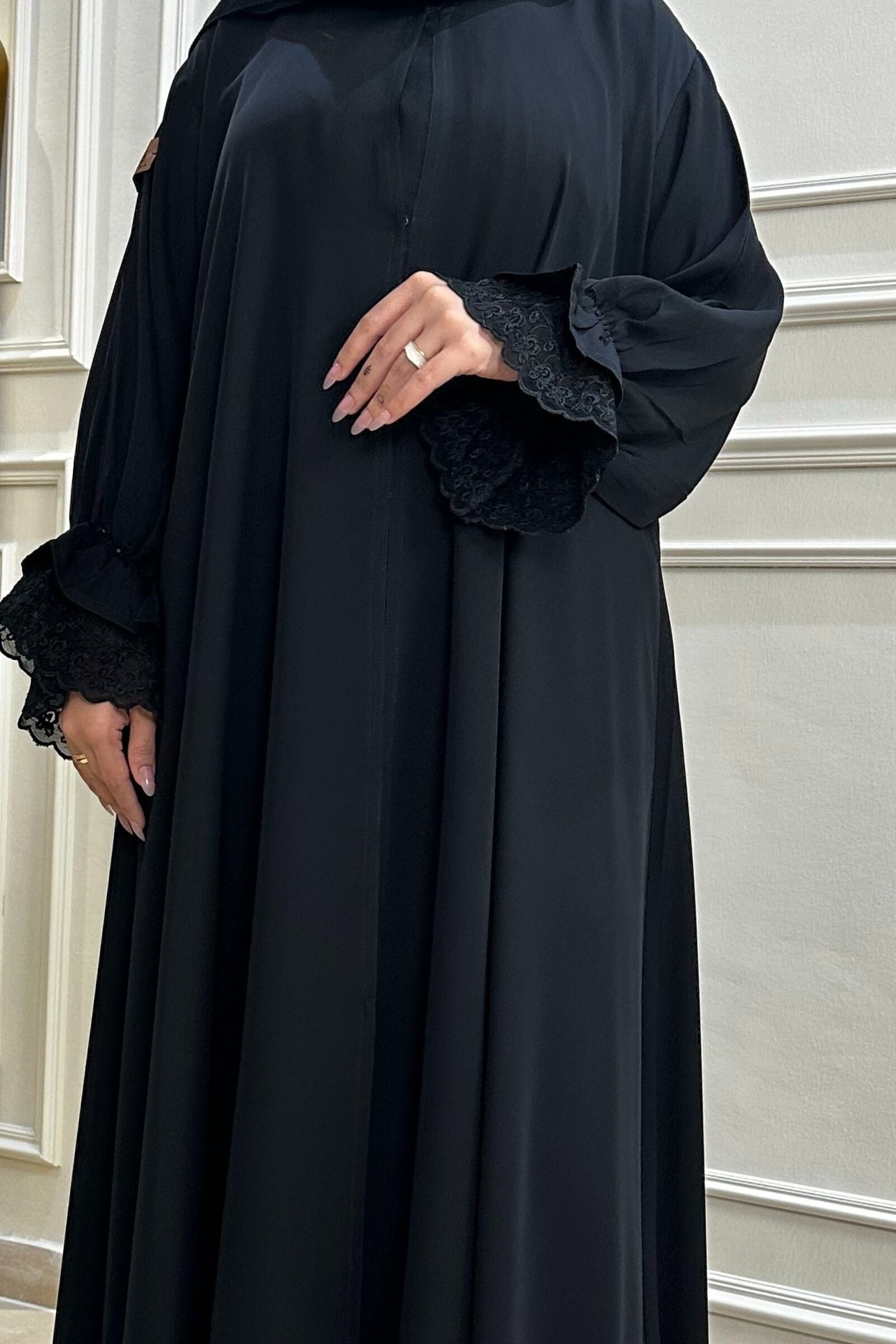 عباية بأكمام دانتيل مطاط و شك على الأكمام نص كلوش