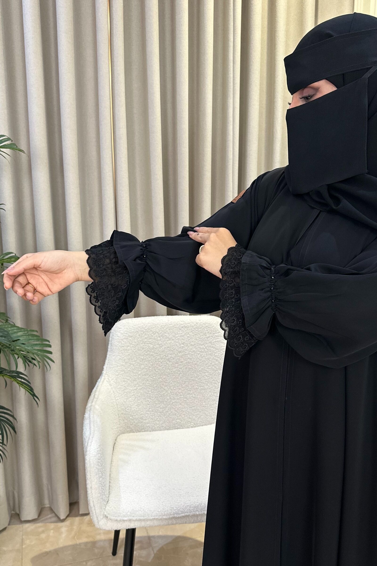 عباية بأكمام دانتيل مطاط و شك – تجسيد الأناقة السعودية