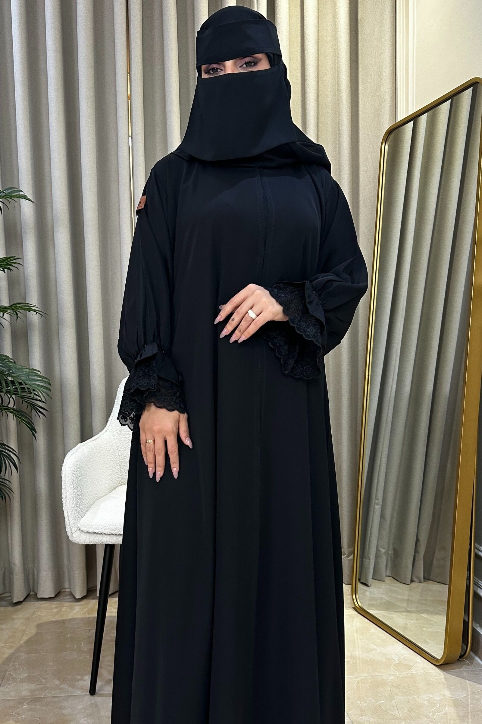نهتم في زارينا بكل عباية مع تفاصيلها الدقيقة وجودتها العالية، كما تبرز العباية بأكمام دانتيل كرمز للذوق السعودي الأصيل. كذلك الدانتيل المستخدم ليس فقط يضيف لمسة جمالية، بل يعكس أيضًا التزامنا بتقديم أفضل ما في عالم الأقمشة والتصاميم.