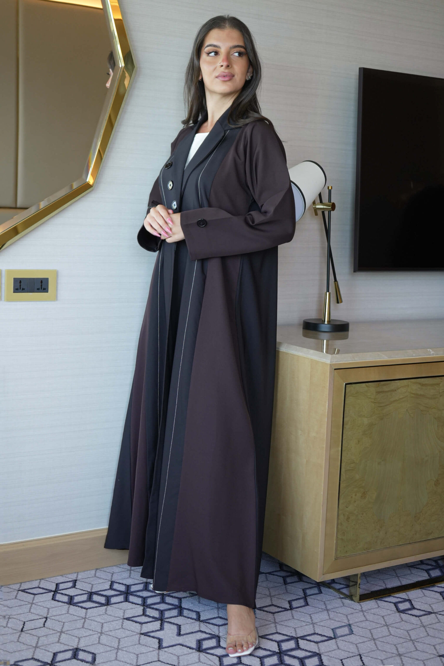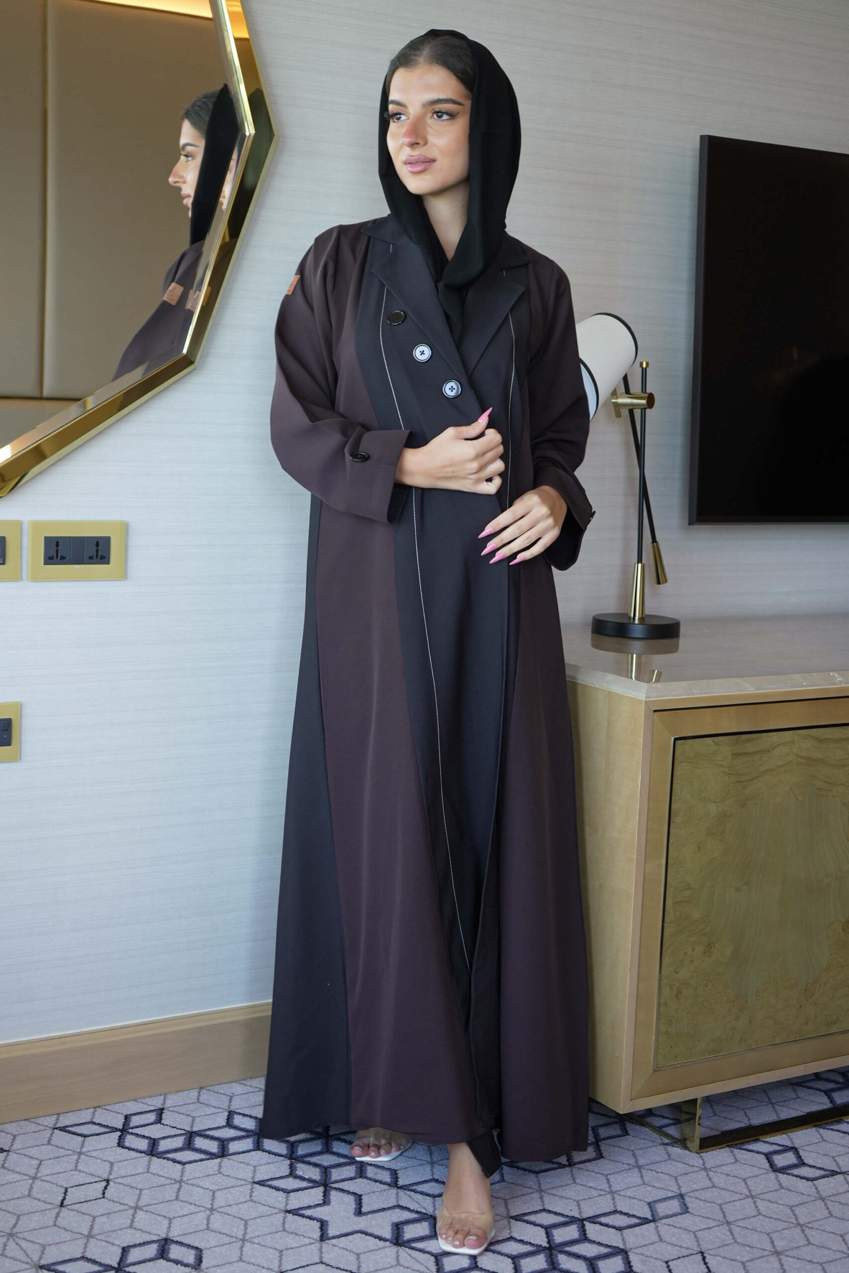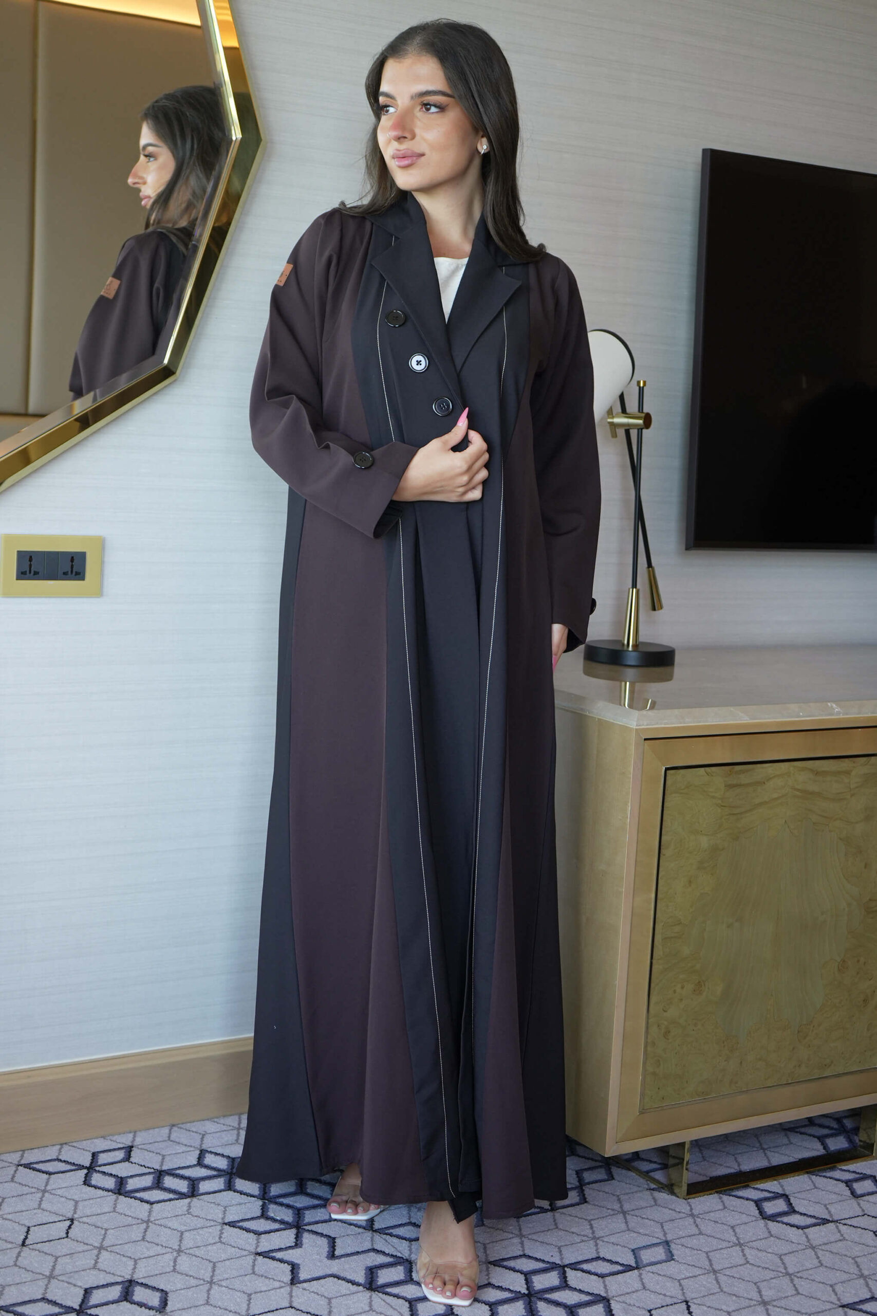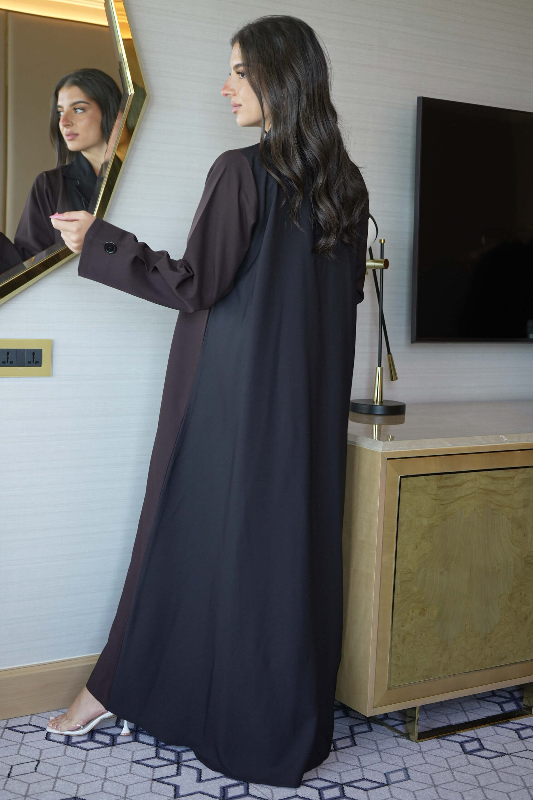 عباية رسمية مصنوعة من قماش كتان أسود فخم، تتسم بتصميم يجمع بين البساطة والفخامة.مما يضيف لها لمسة من الانسيابية والأناقة. الجزء من اجناب عباية مزين بقماش بني ناعم، ليضفي لمسة فريدة ومميزة. الإطلالة بأسلوب راقٍ وأنيق، مما يجعلها مثالية للمناسبات الرسمية.