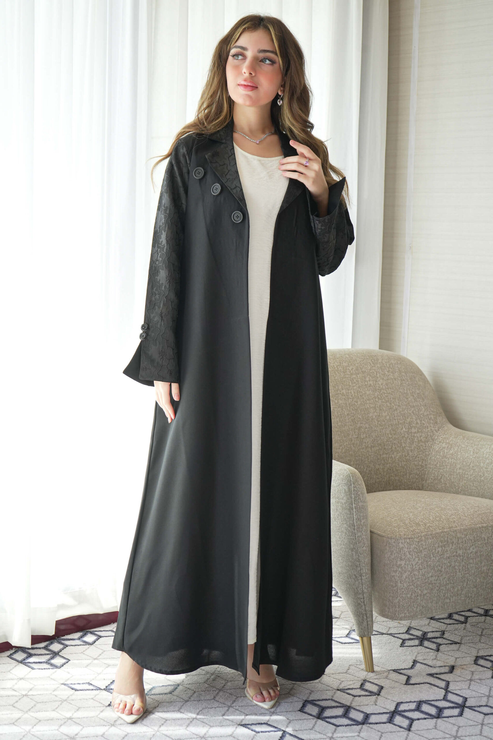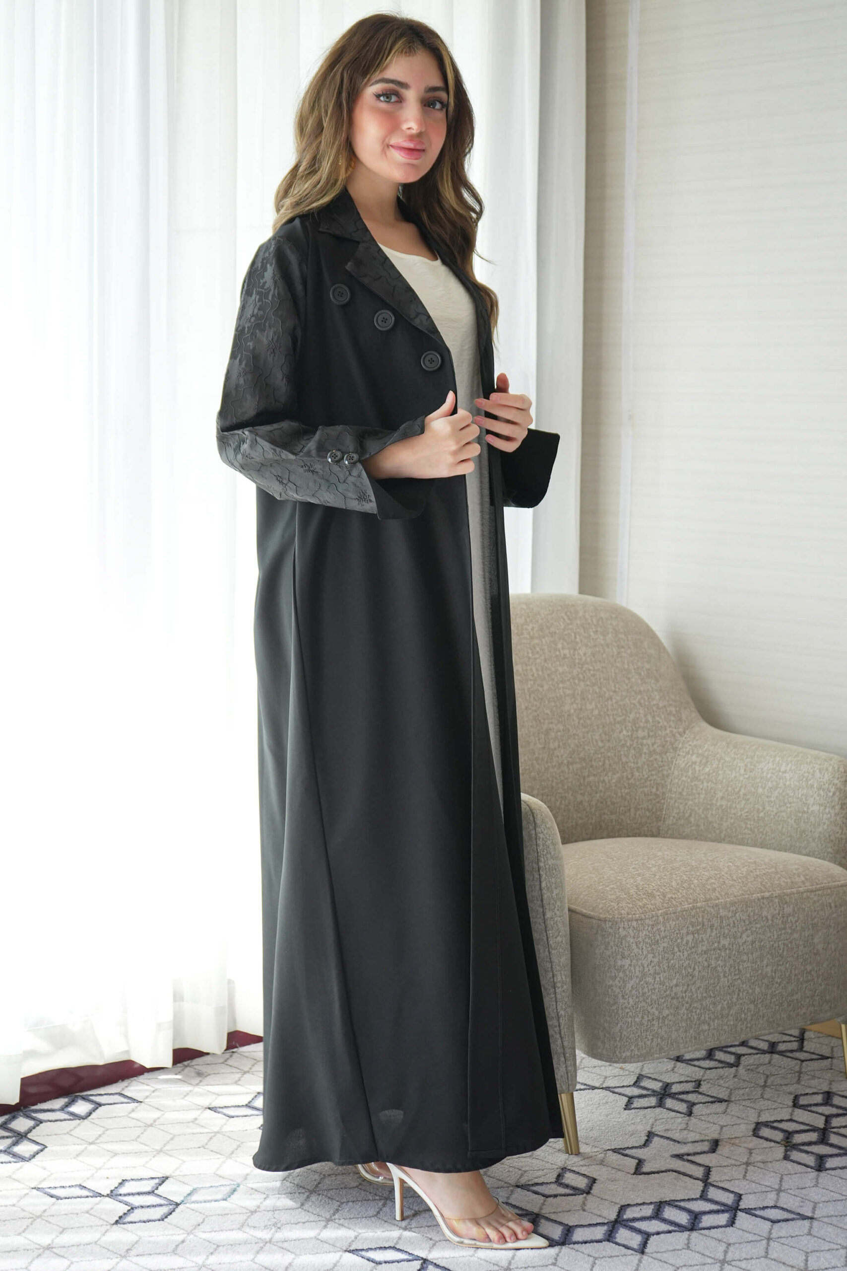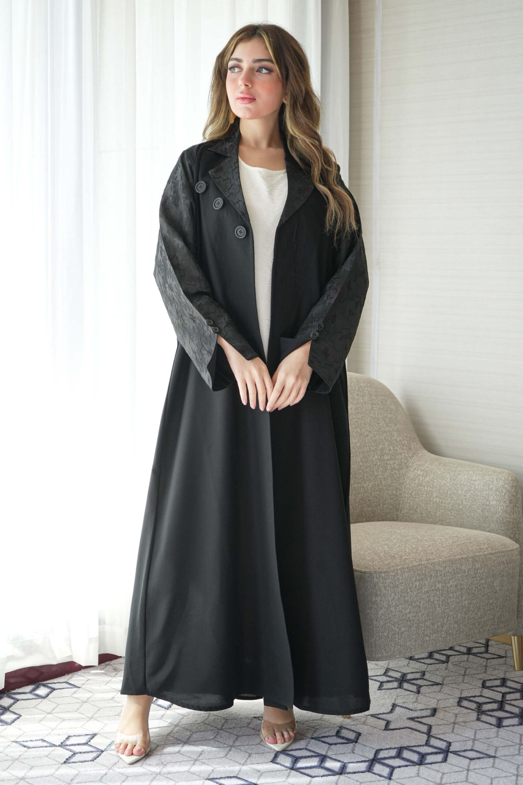 عباية بليزر مندمجة معها قماش جاكار اسود مشجره نوع اكمام ساده فتحة بداية الكم فخمة و انيقة