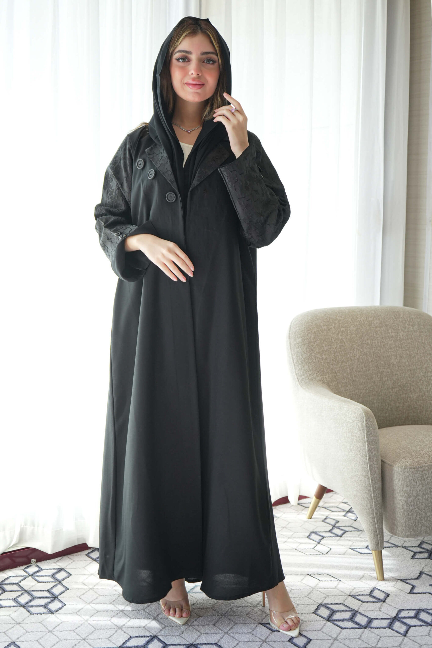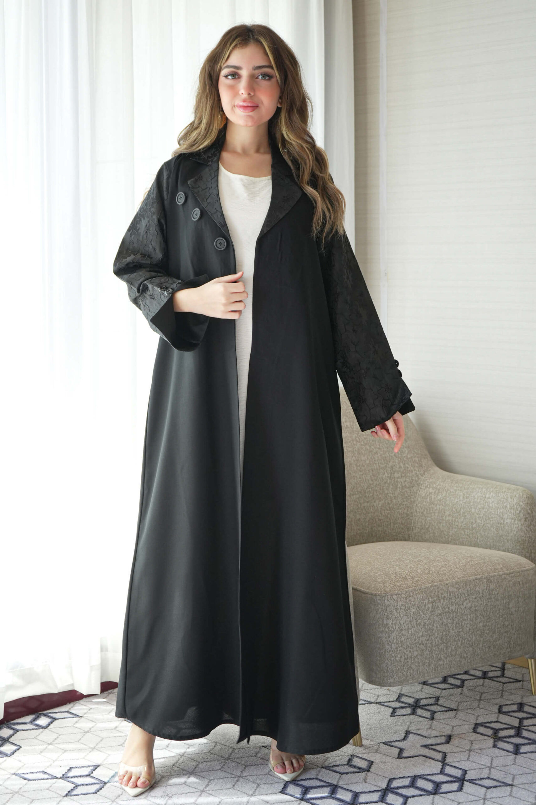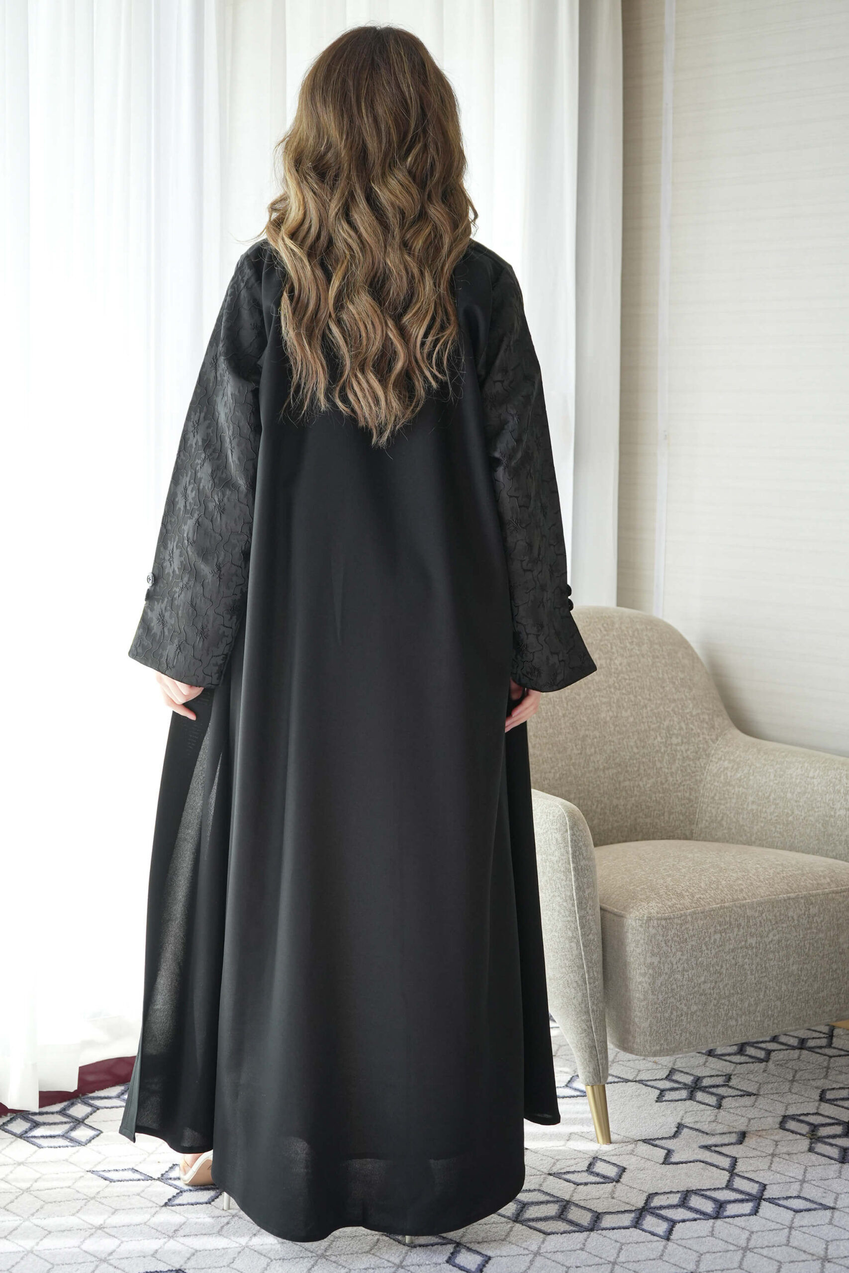 عباية بليزر مندمجة معها قماش جاكار اسود مشجره نوع اكمام ساده فتحة بداية الكم فخمة و انيقة