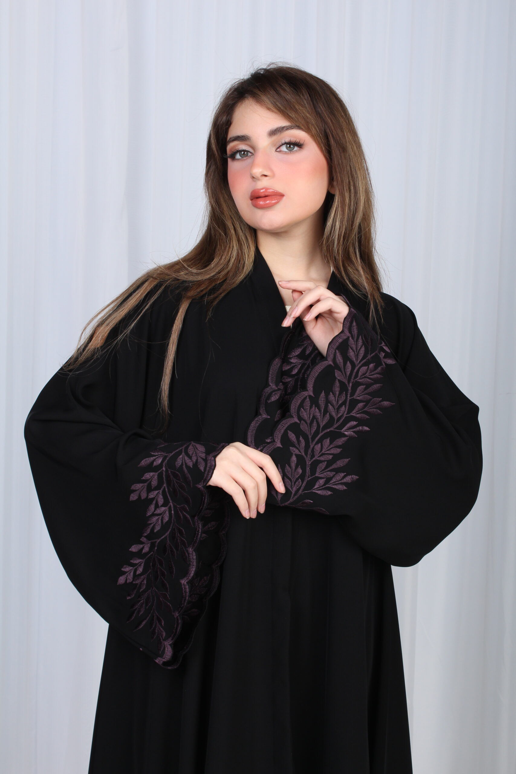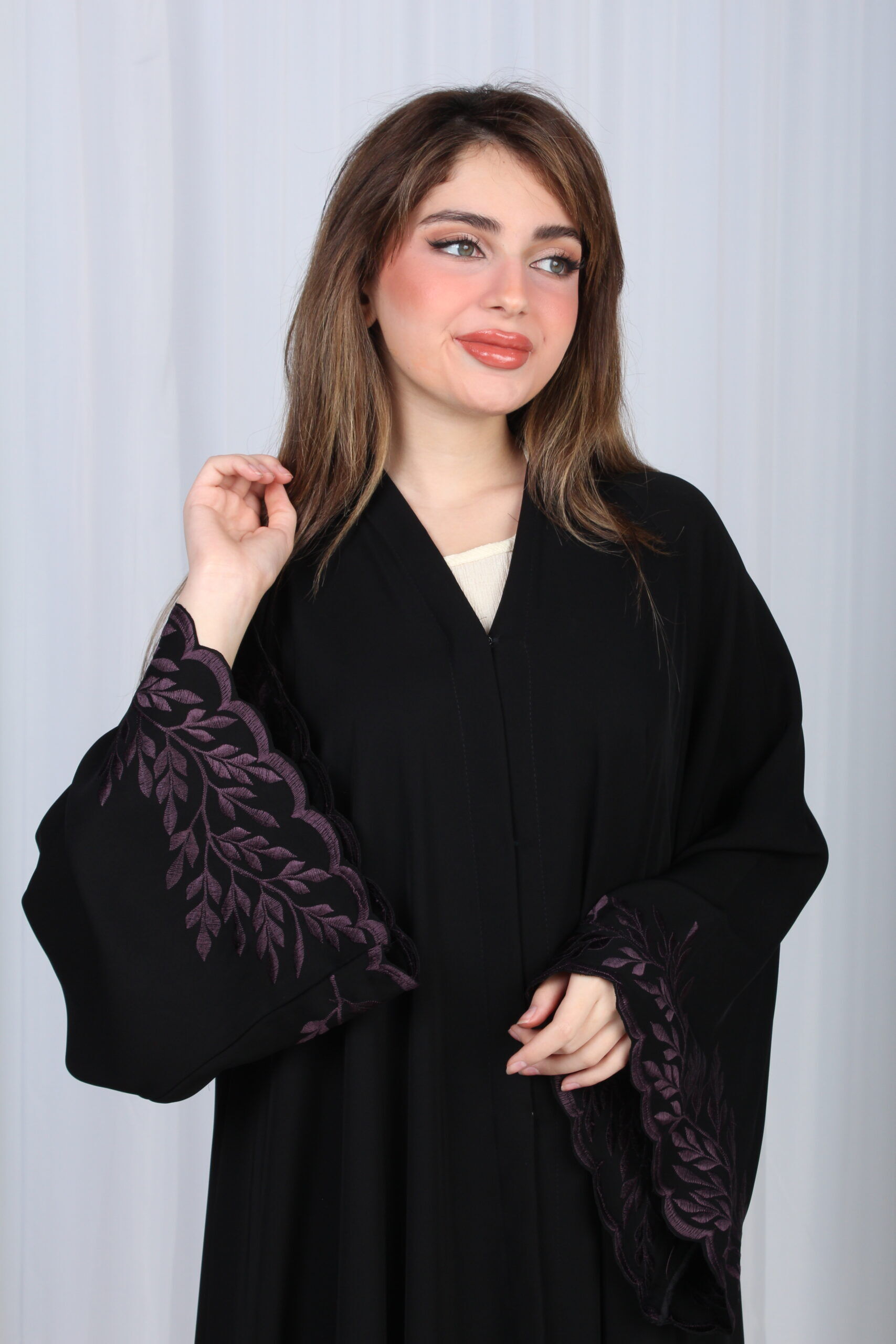 - تأتي بشكل أنيق ، فهي مطرزة بتطريز موف مخفي على الاكمام يعطيها شكلا مميزا