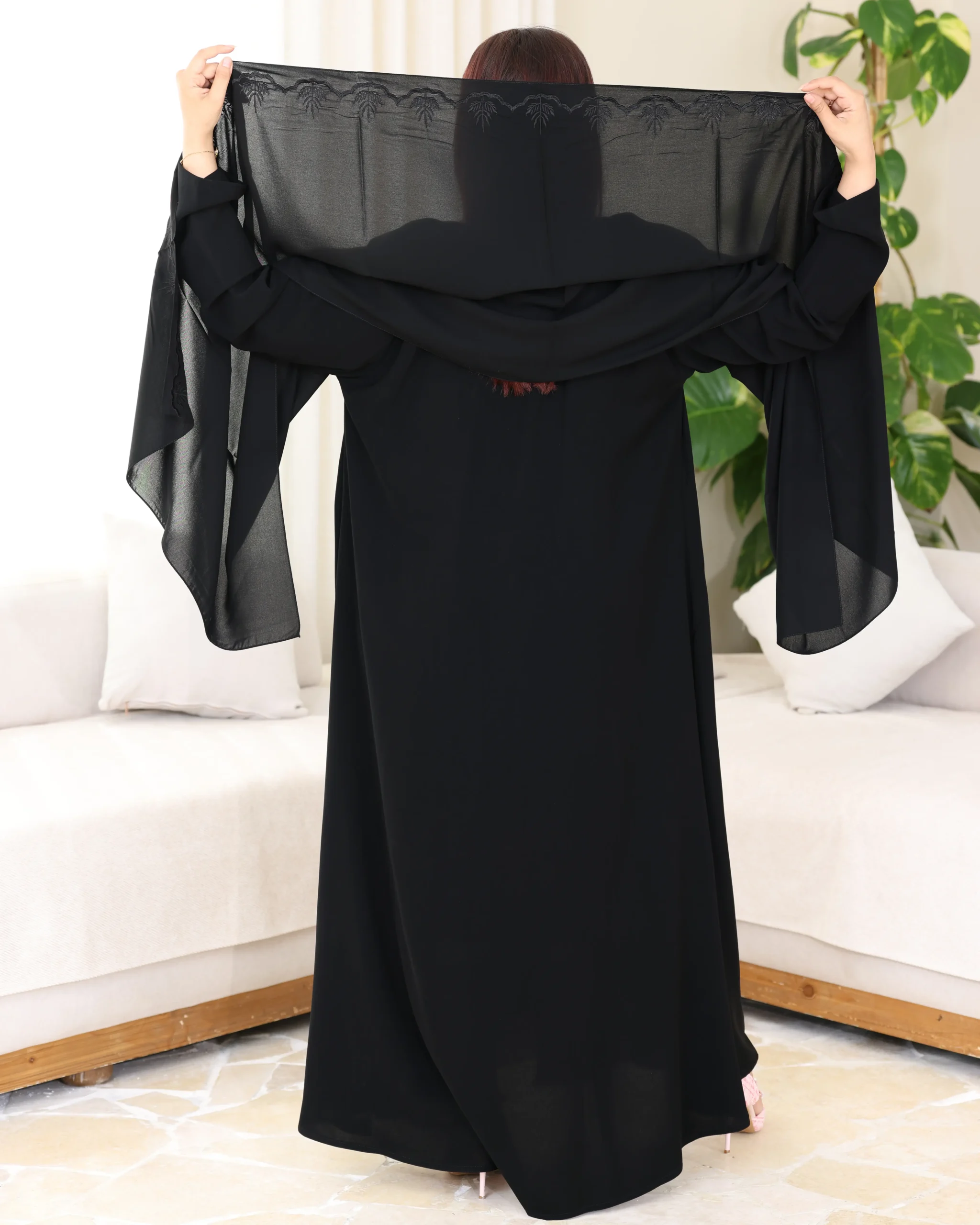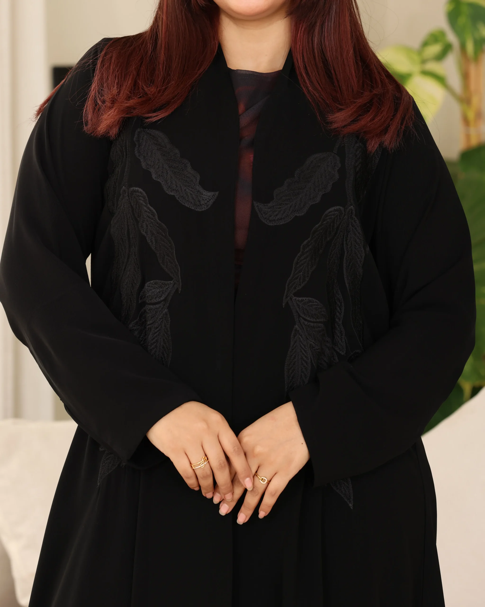 مصنوعة من قماش الانترنت عالي الجودة، وتتميز بتطريز دقيق (خيط اسود مخفي) يغطي نصف عباية ، بلمسات أغصان أنيقة. تأتي بقصة مريحة،و أكمام عادية ، مع طرحة متناسقة، مما يجعلها مثالية للمناسبات الخاصة او اعمال يومية
