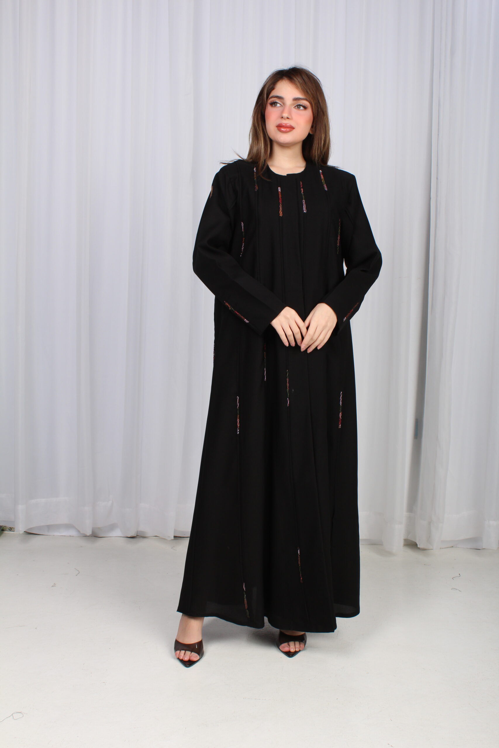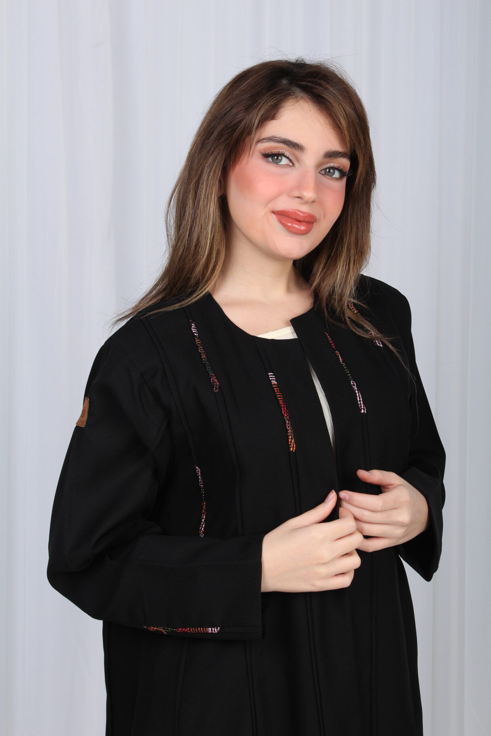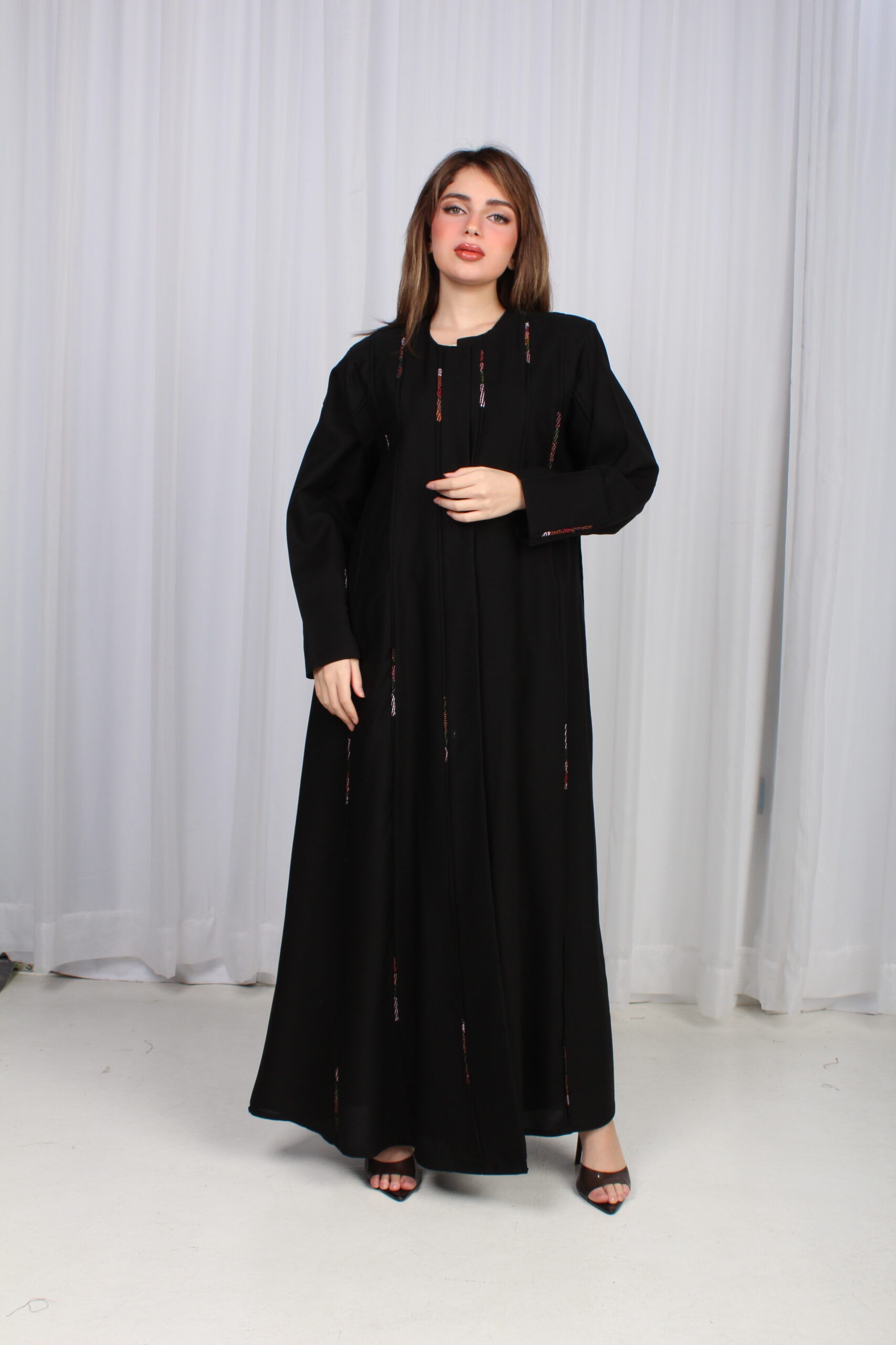 تألقي بإطلالة ساحرة مع هذه العباية السوداء الفاخرة، المصممة بقصة أنيقة من الوسط ومزينة بقماش ملون محددة، الراقية التي تضيف لمسة من الفخامة. تأتي بأكمام كلاسيكية تضفي عليها لمسة من الرقي والراحة، مما يجعلها مثالية لكل المناسبات، سواء كانت رسمية أو كاجوال.