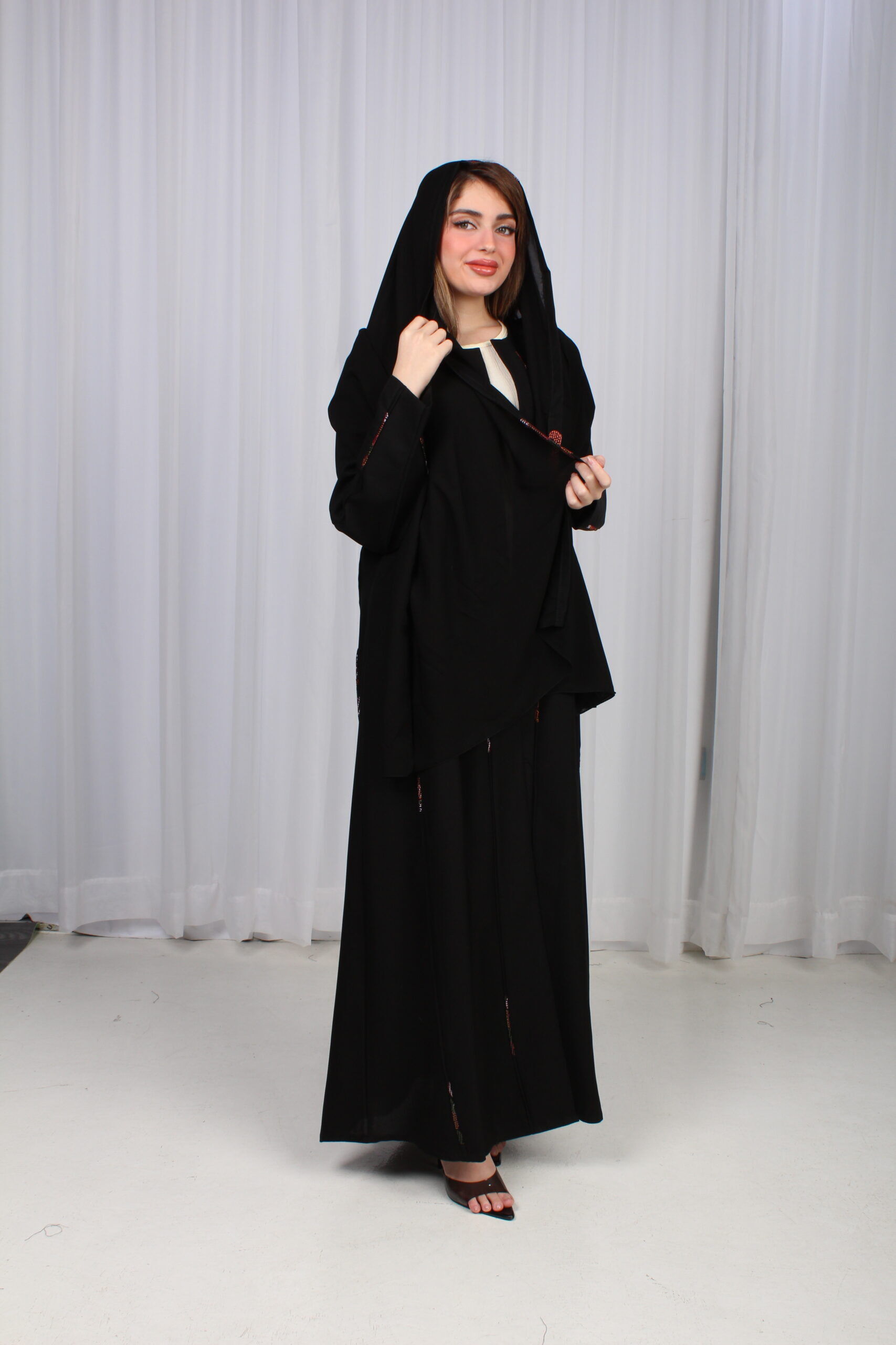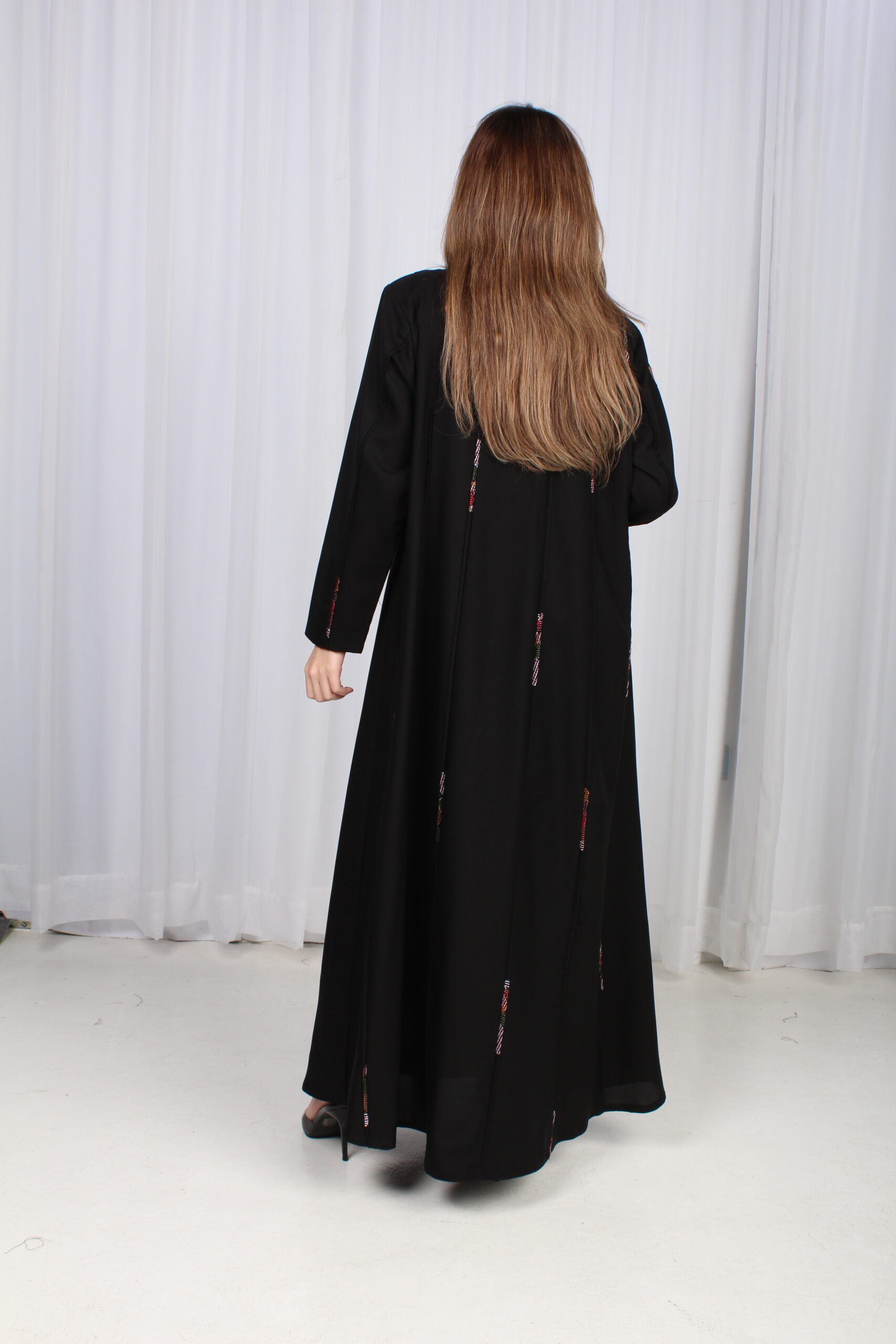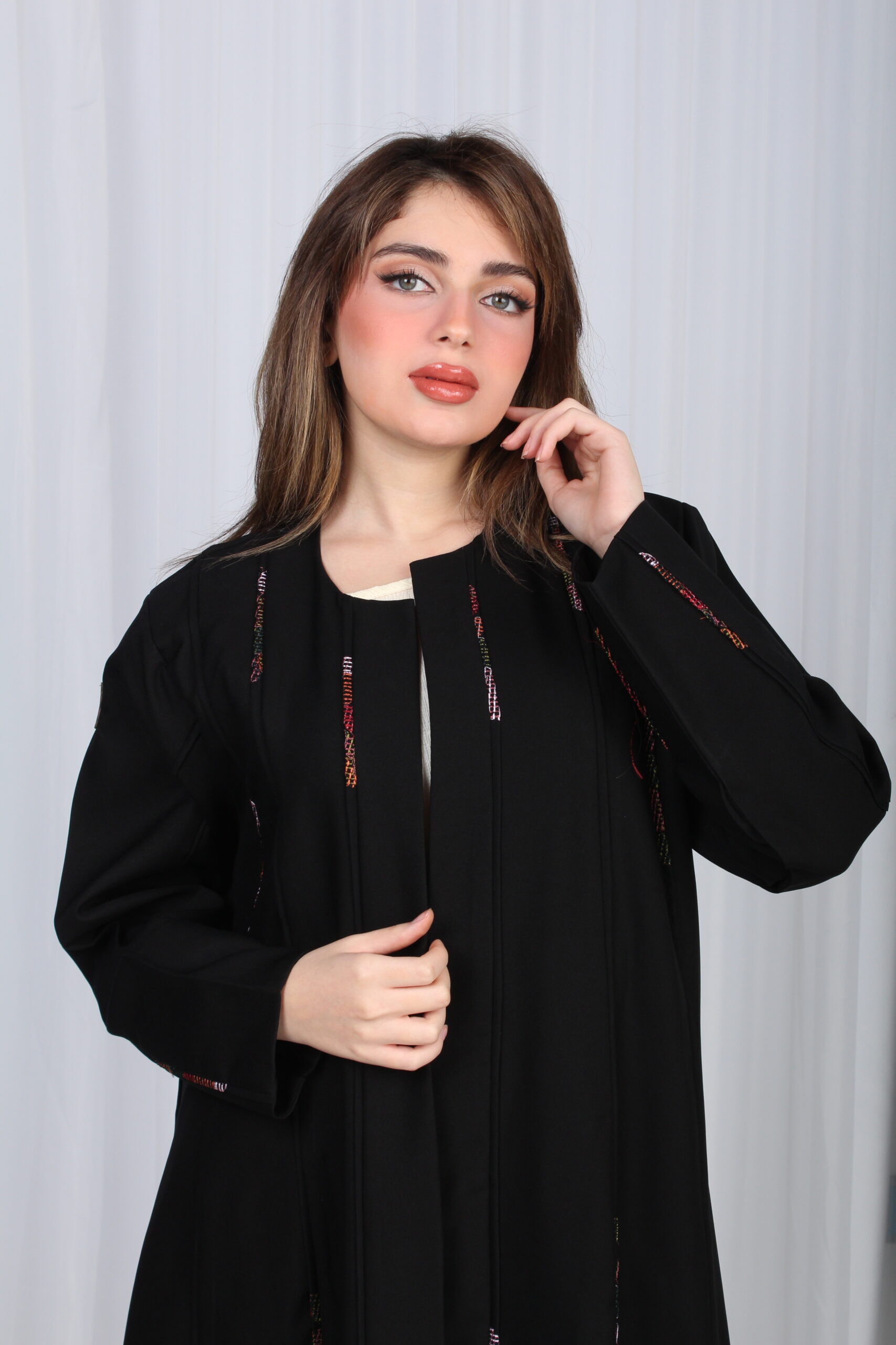 تألقي بإطلالة ساحرة مع هذه العباية السوداء الفاخرة، المصممة بقصة أنيقة من الوسط ومزينة بقماش ملون محددة، الراقية التي تضيف لمسة من الفخامة. تأتي بأكمام كلاسيكية تضفي عليها لمسة من الرقي والراحة، مما يجعلها مثالية لكل المناسبات، سواء كانت رسمية أو كاجوال.