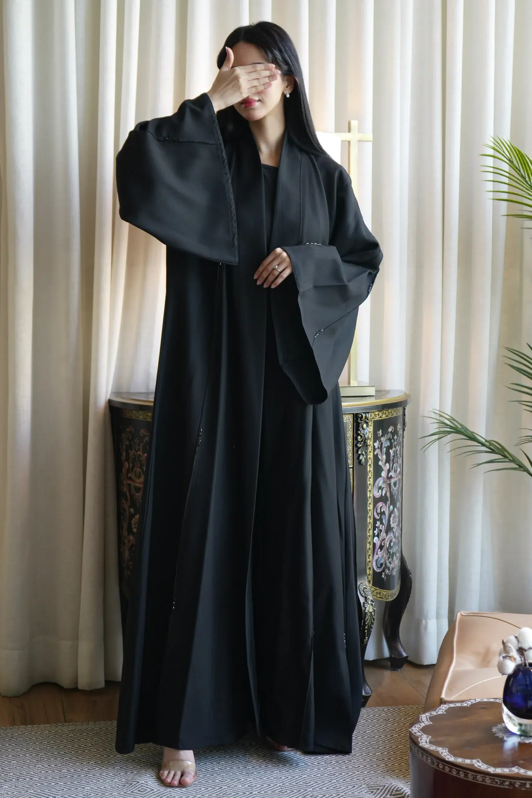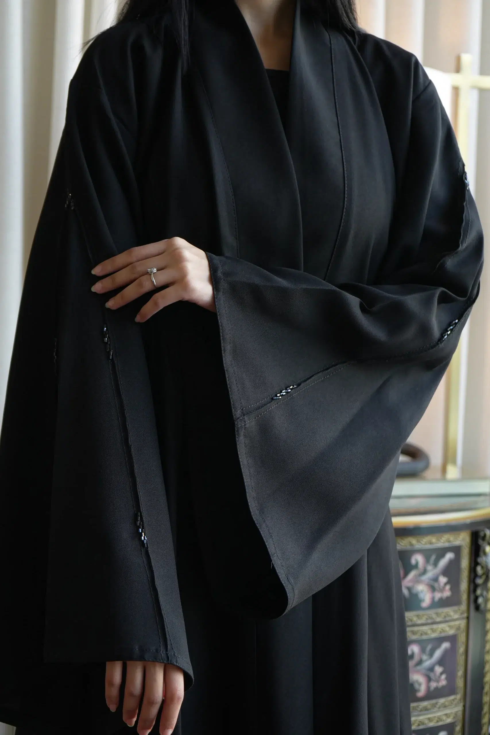 عباية بجيوب جانبية مميزه و أكمام مزينه بفايفين
