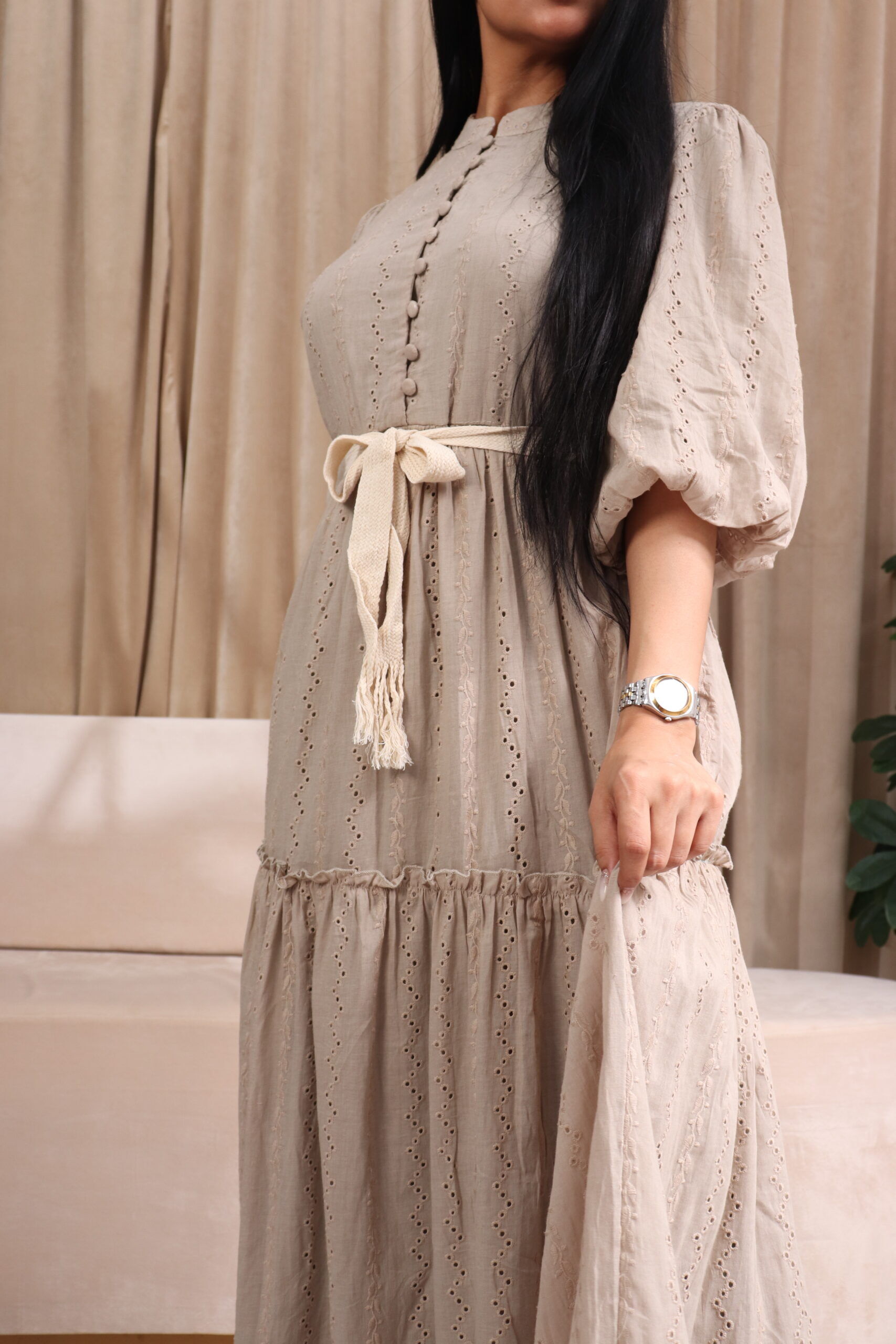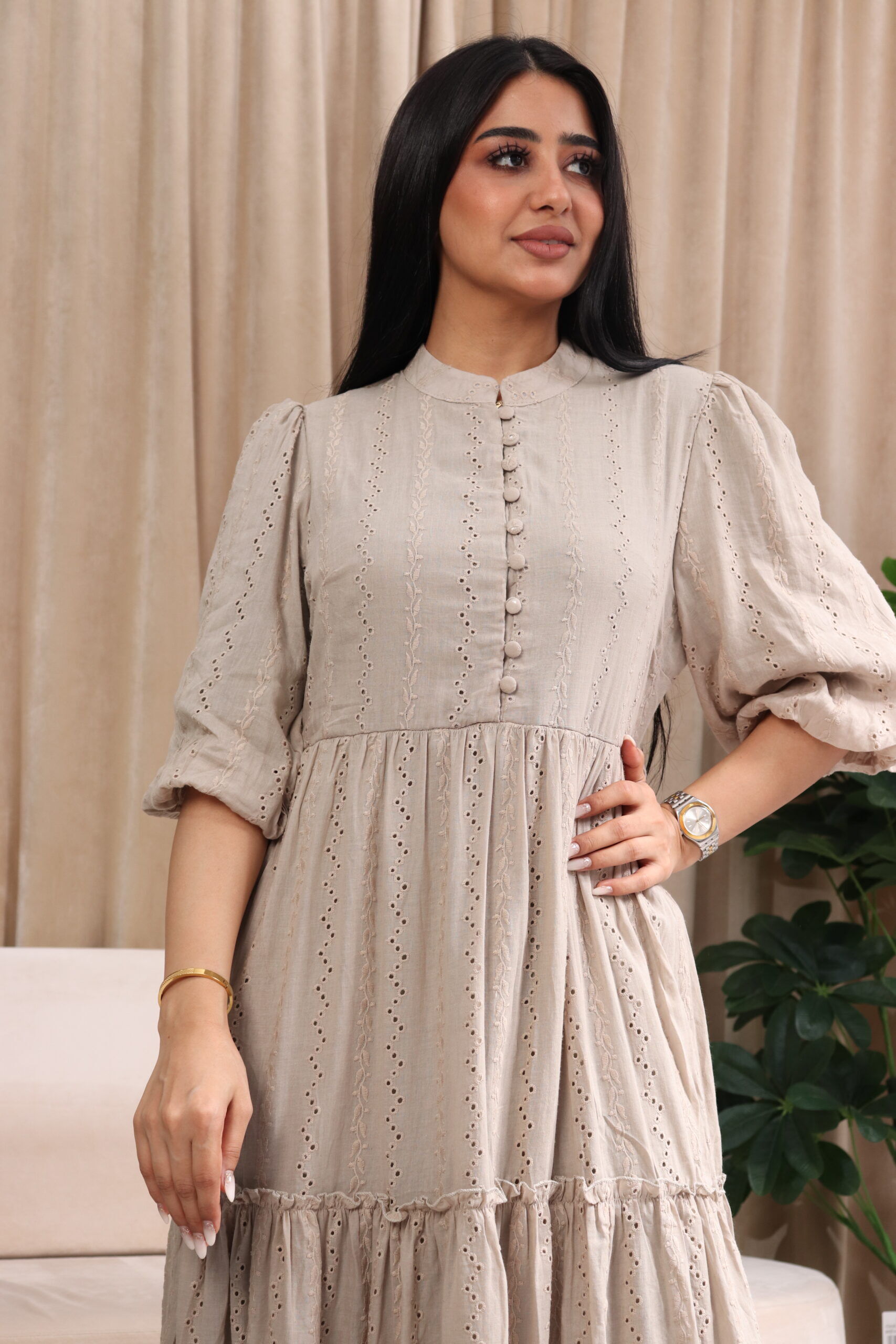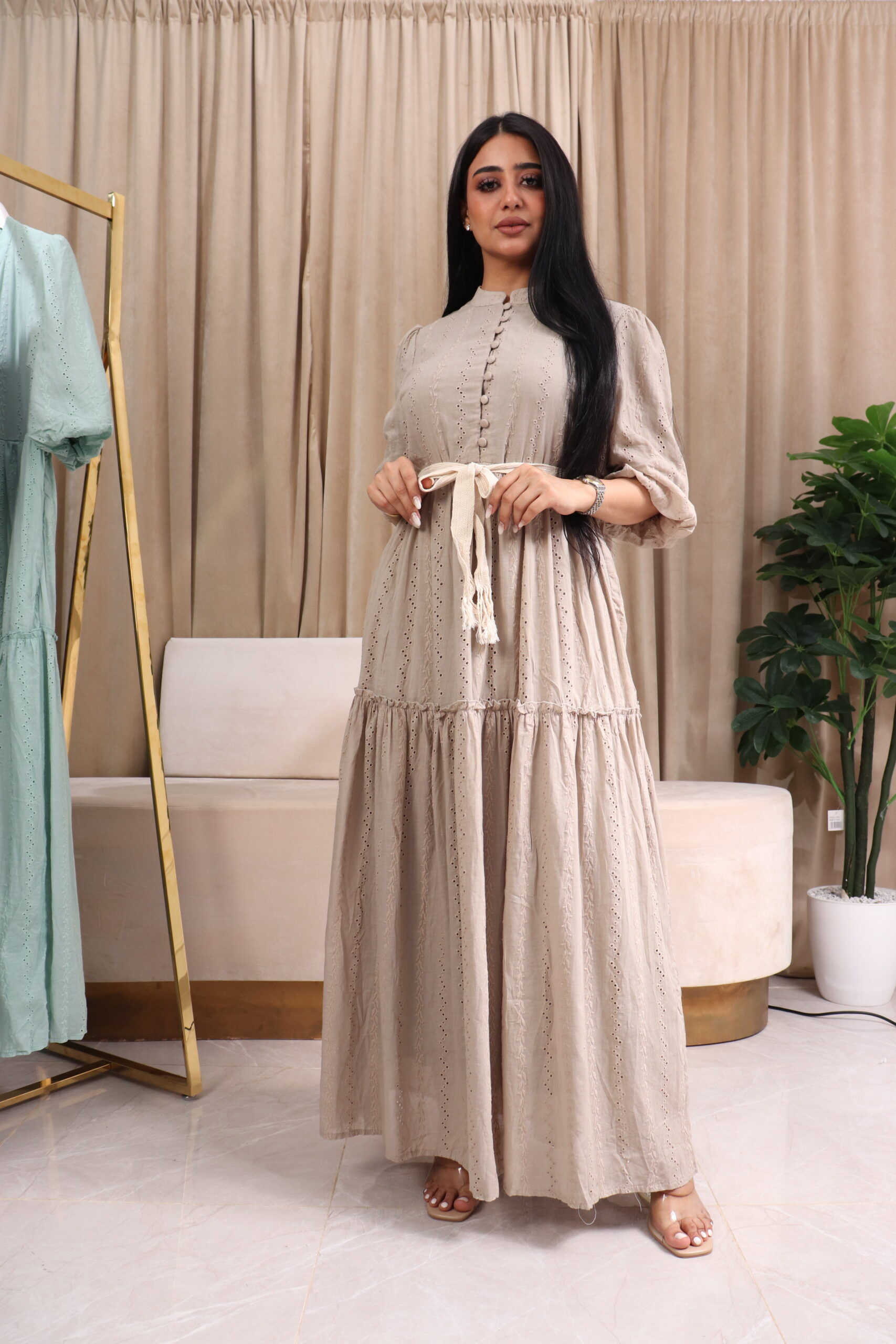 فستان القطن الفاخر بيج مكسره من وسط ومن اسفل