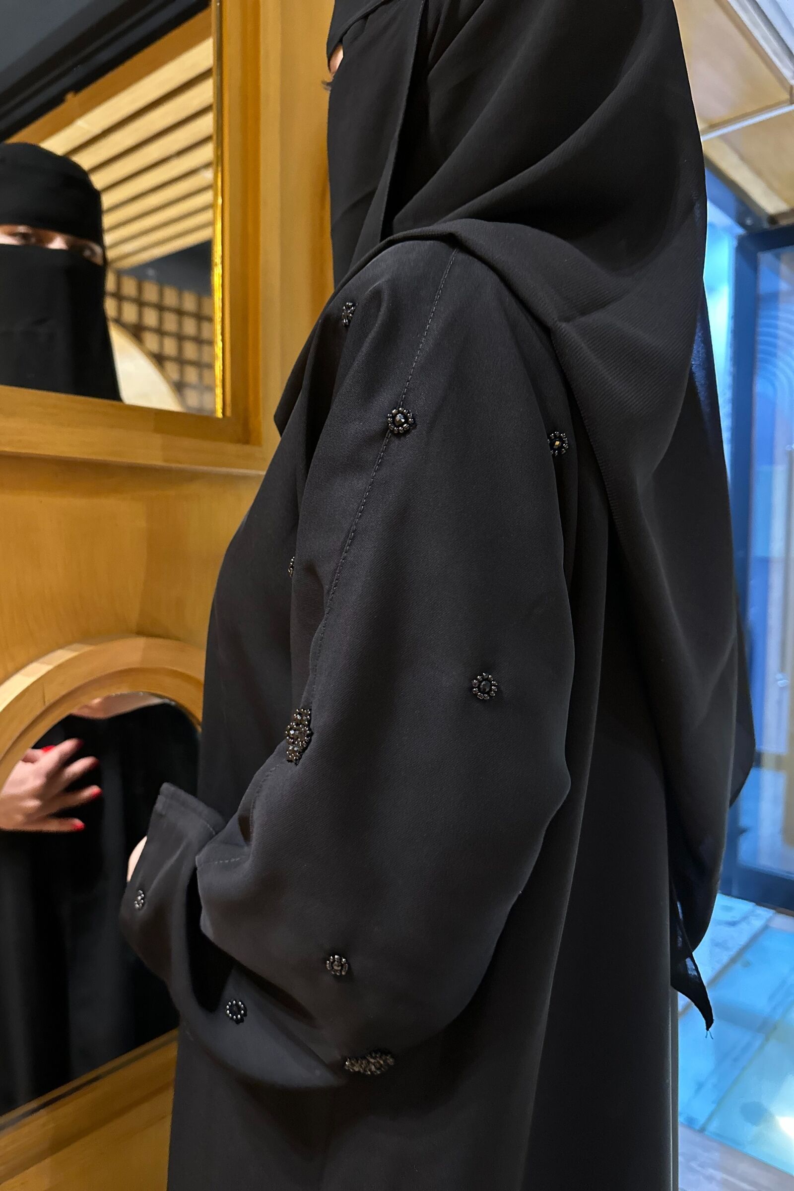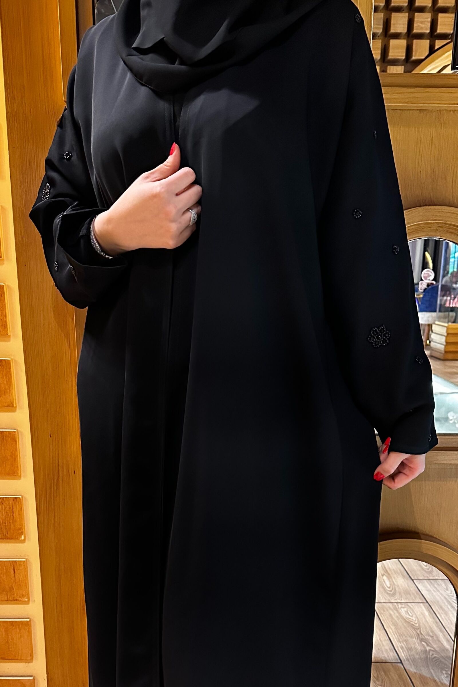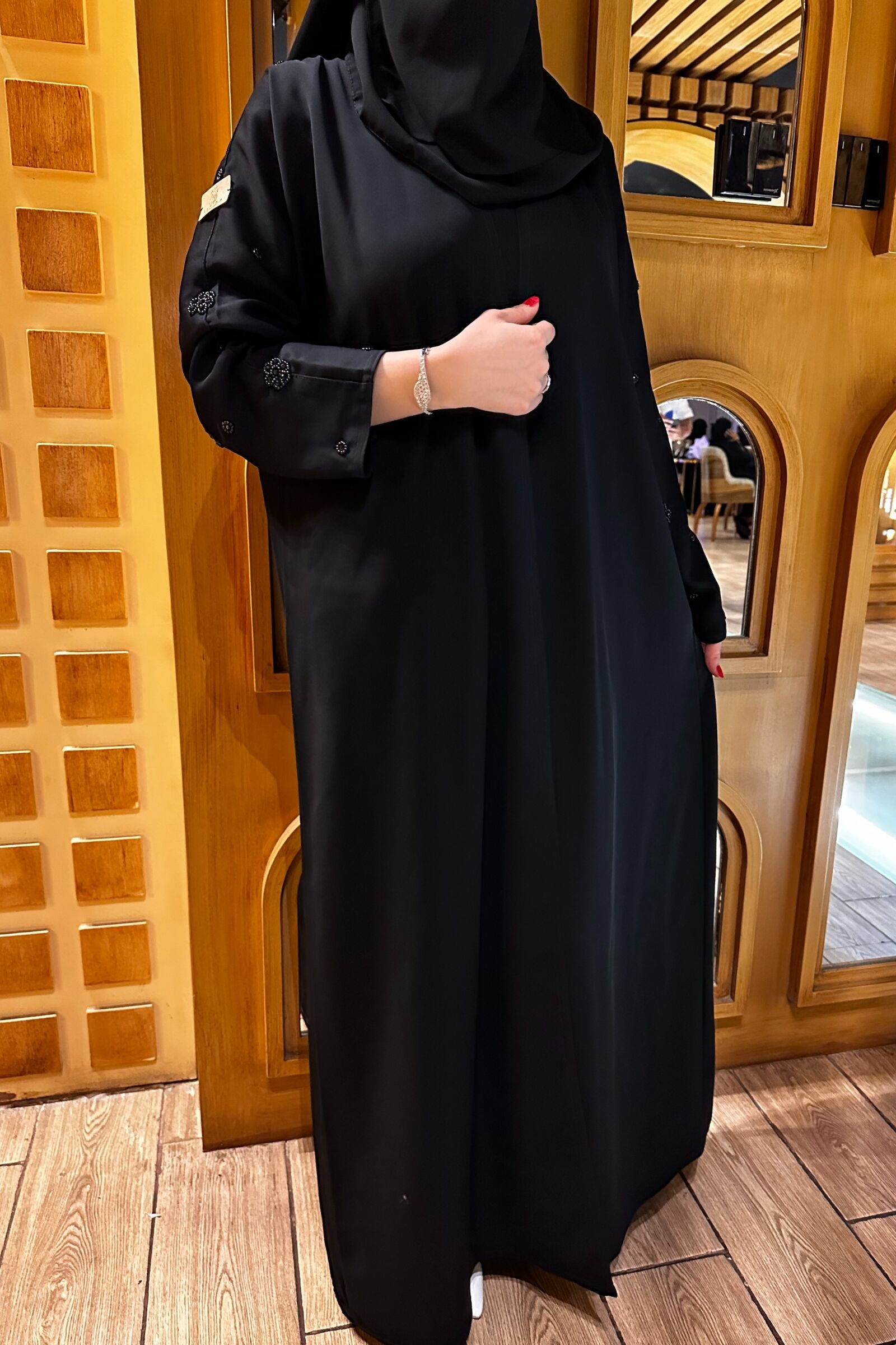 فخامة اللون الأسود لا يضاهيها شيء ، فما بالك بعبايه بشك كلاسيك فخمه مطرزة يدوياً بالخرز ، مصممه بإبداع من قماش انترنت عالي الجودة ، و تطريز مبتكر ذي لمعة مميزة على اكمام بلون اسود، ستكون اكثر عباية سوداء شيك في خزانتك ، تناسب مختلف المناسباتو الأوقات .