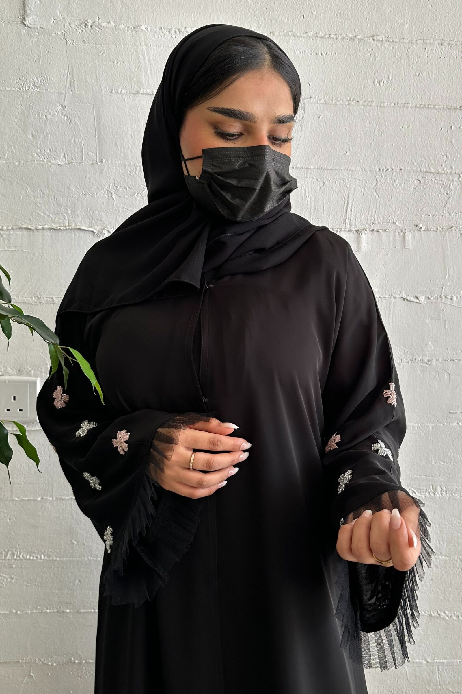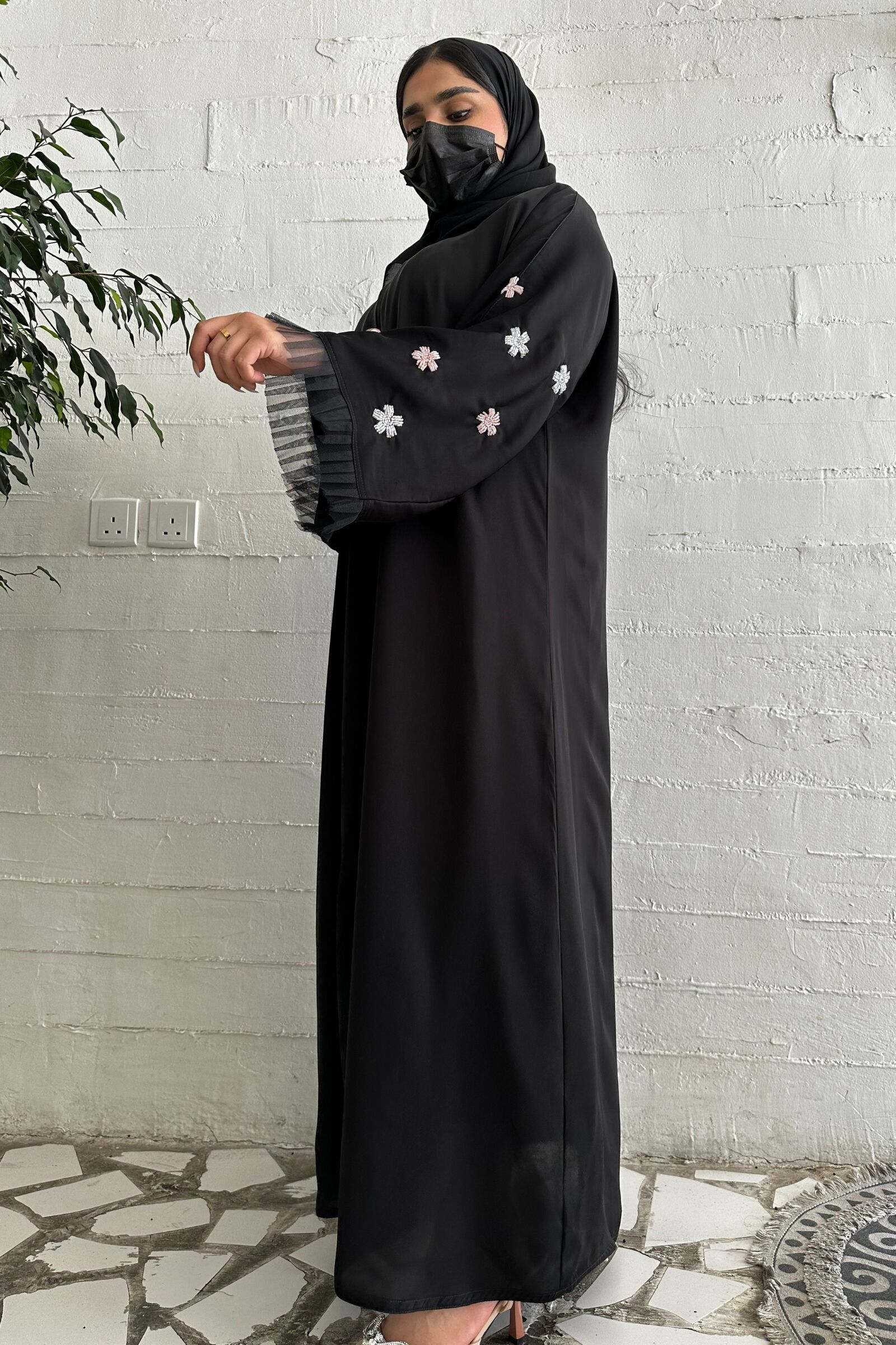 تألقي بإطلالة راقية وأنيقة مع عباية مميزة بشك ناعم على الأكمام. تضفي الأكمام المزينة بشك ناعم على شكل ورود بلون خربزي و ابيض الجديد لمسة من الأنوثة والجمال على التصميم العام للعباية. يوفر القماش المستخدم في هذه العباية الراحة والنعومة للمرتدية، مما يجعلها خيارًا مثاليًا لارتدائها في المناسبات الخاصة والاجتماعية.