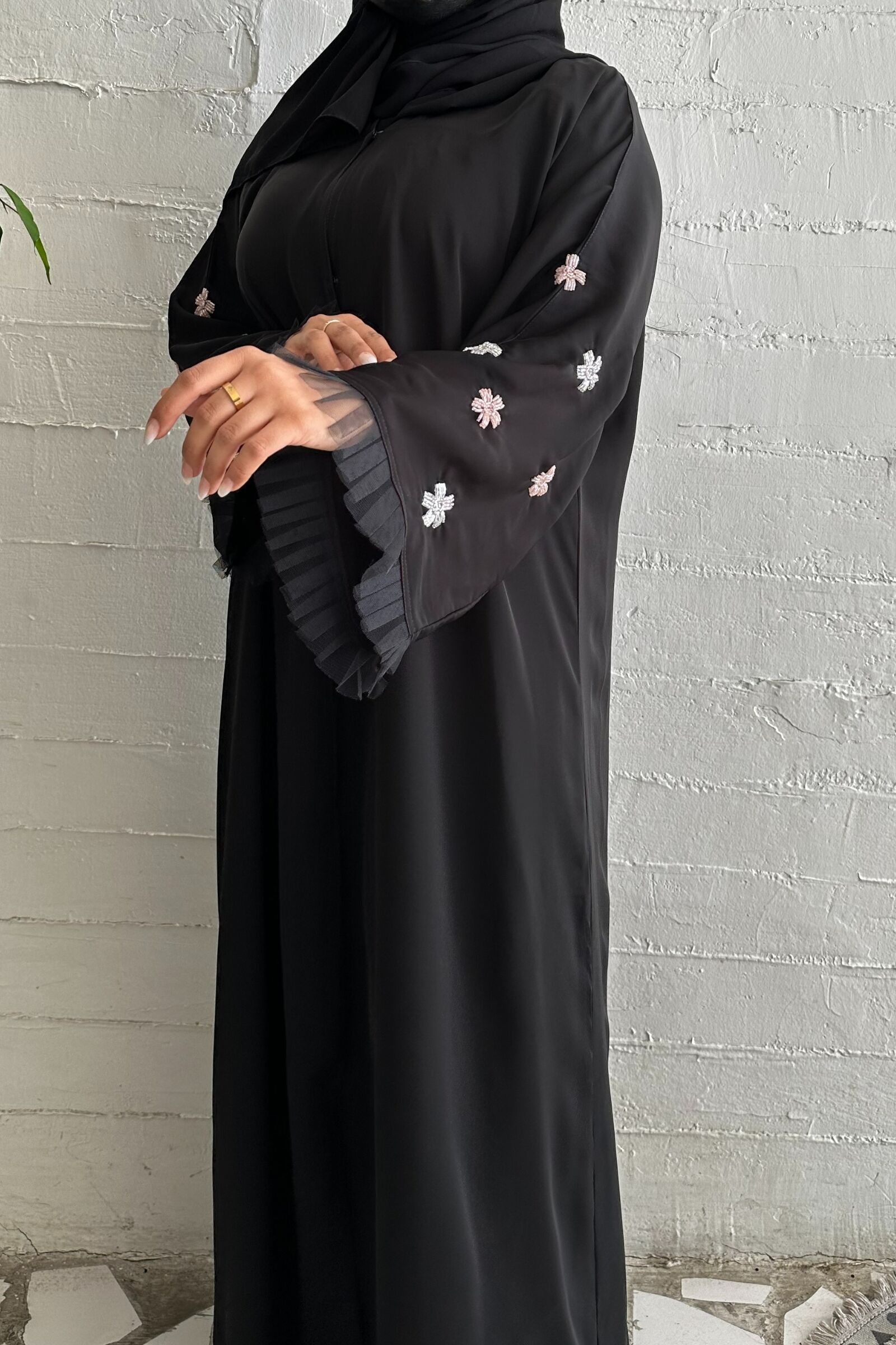 اختاري هذه العباية بشك ناعم على الأكمام لتتألقي بإطلالة عصرية وجذابة تجمع بين الأناقة والراحة في جميع المناسبات. ستضيف هذه العباية المميزة لمسة فريدة من الجاذبية والأناقة إلى خزانتك.